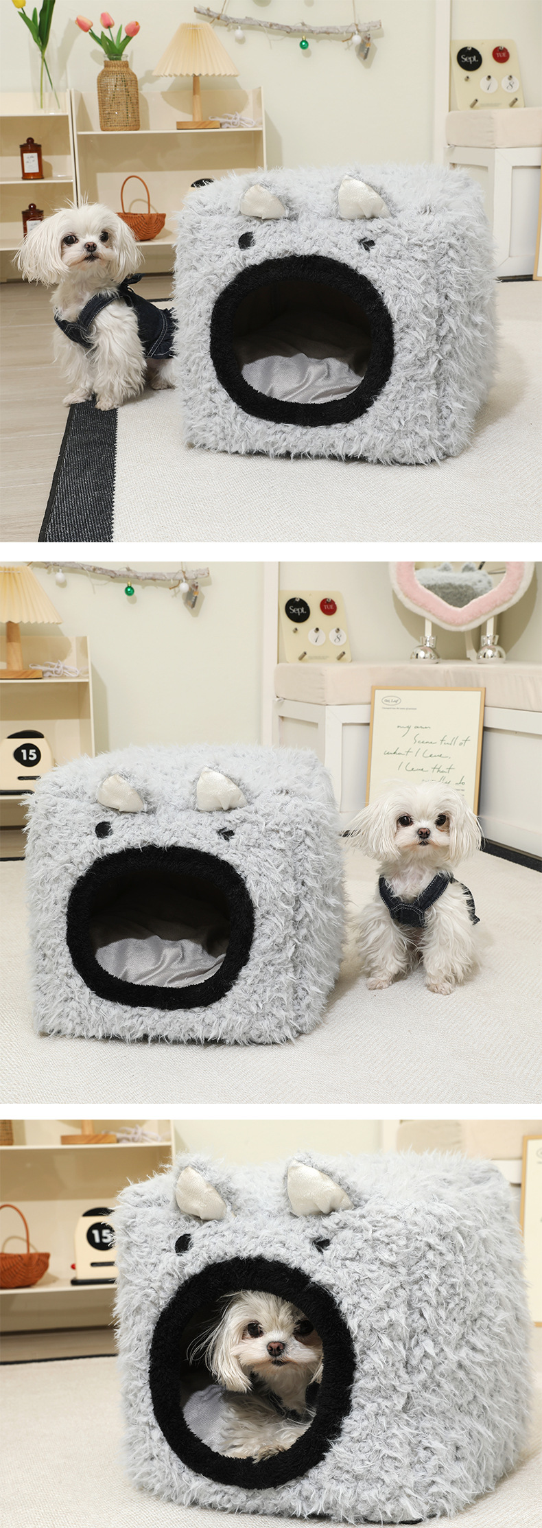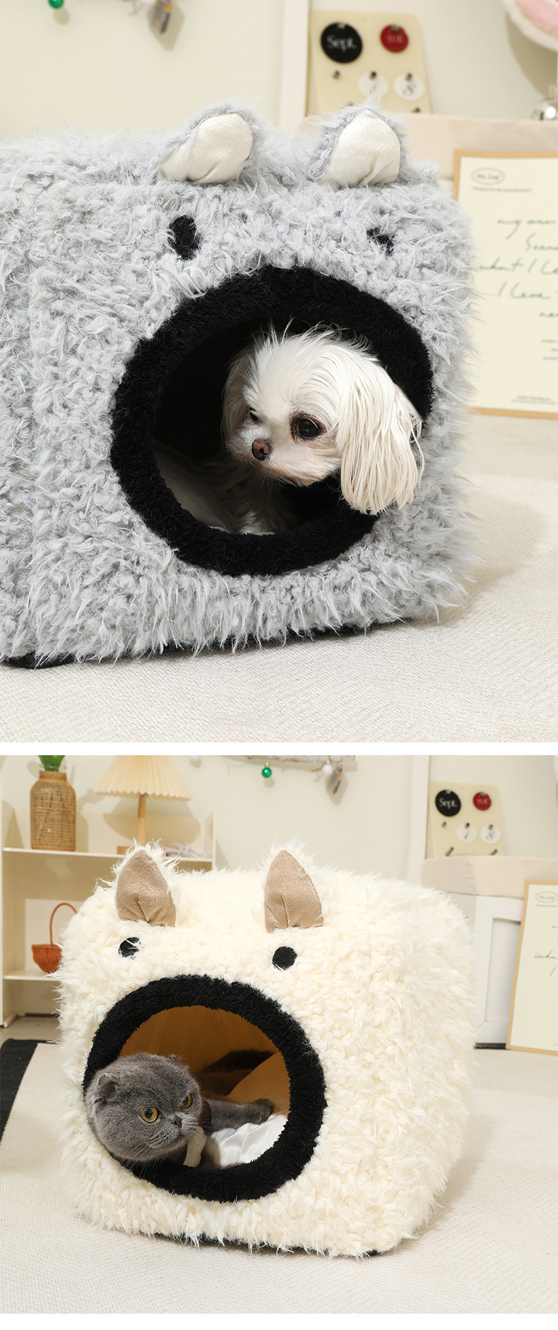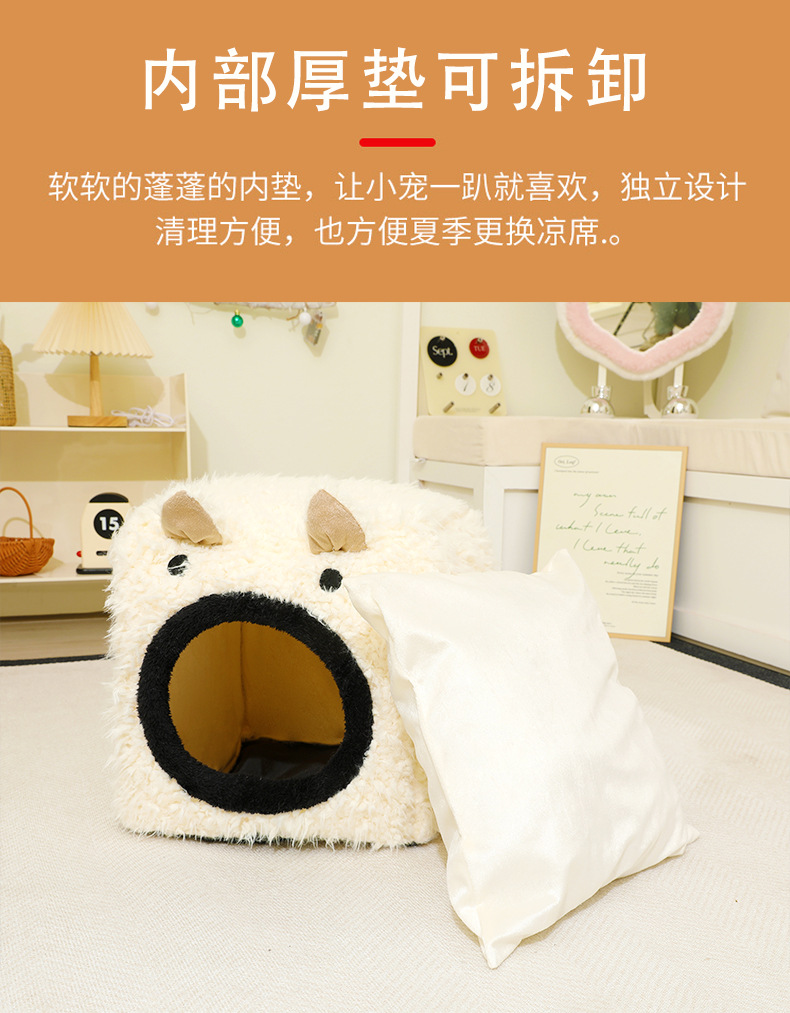 Peluche para mascotas, orejas de gato, nido cuadrado tridimensional, cojín desmontable, cama para mascotas, perrera cálida, nido para gatos semicerrado