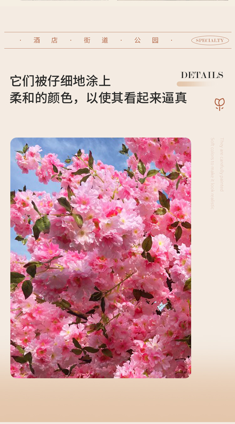 | Material | Tronco: tubo de acero FRP o madera maciza Ramas: madera PE Flores: tela de seda |