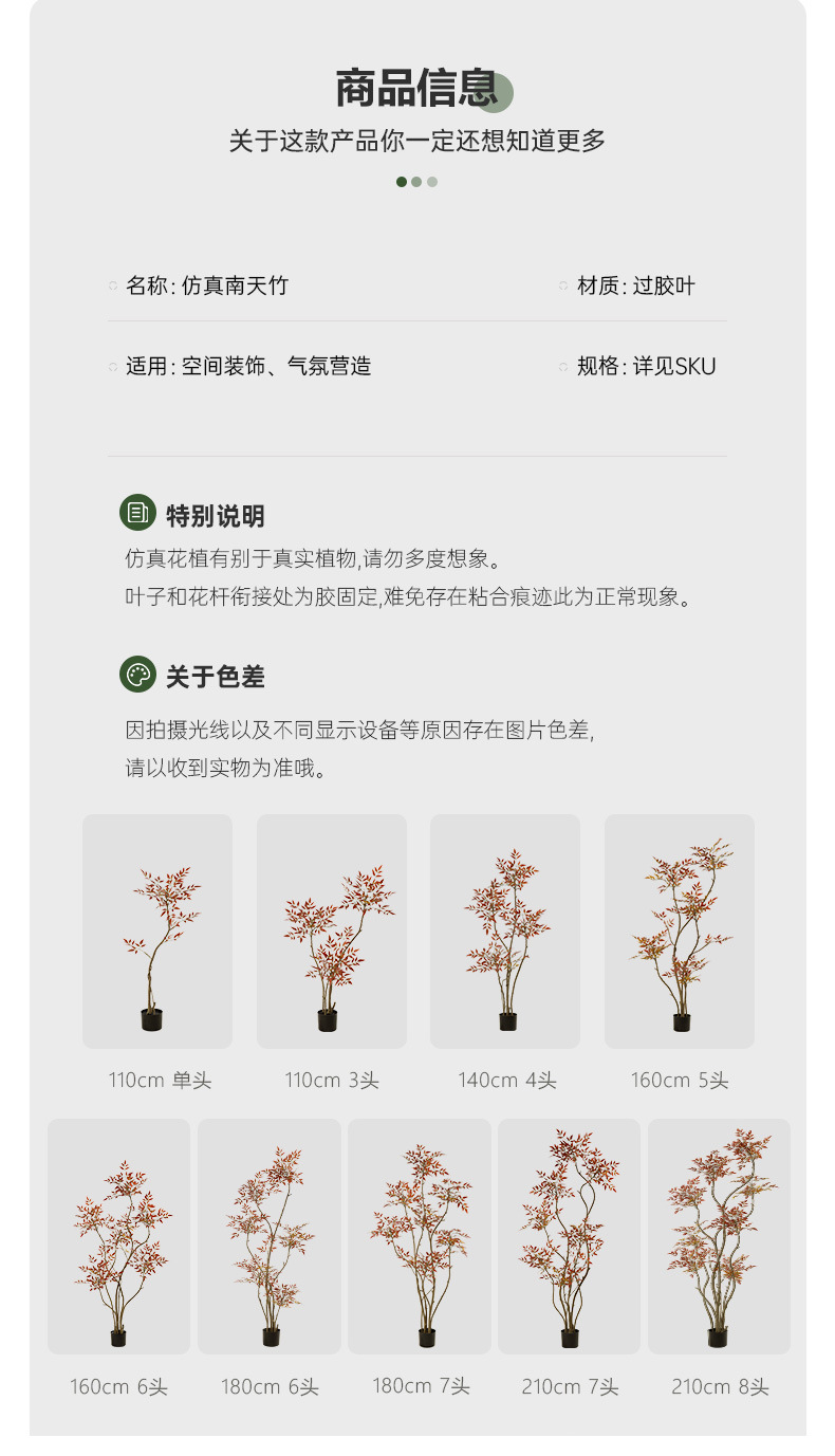 | Colores | 1,1 metros de bambú del sur 1 cabeza,1,1 metros de bambú del sur 3 cabezas,1,4 metros de bambú del sur 4 cabezas,5 cabezas de bambú del cielo del sur de 1,6 m,6 cabezas de bambú del sur de 1,6 m,6 cabezas de bambú del cielo del sur de 1,8 m,7 cabezas de bambú del sur de 1,8 m,2,1 metros de bambú del sur 7 cabezas,2,1 metros de bambú del sur 8 cabezas |
