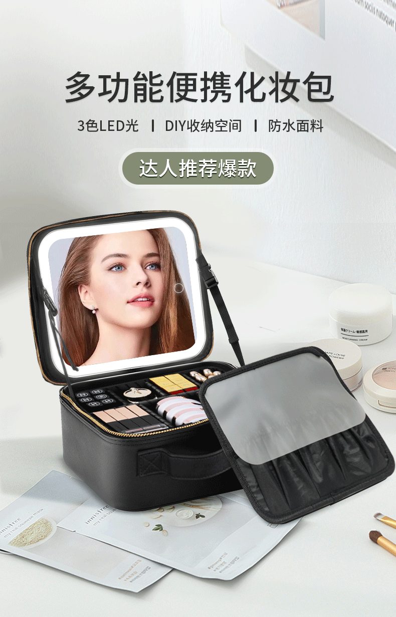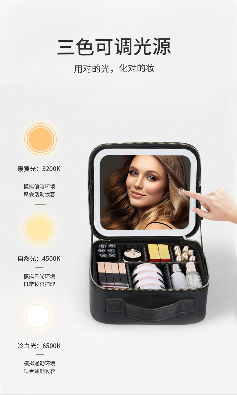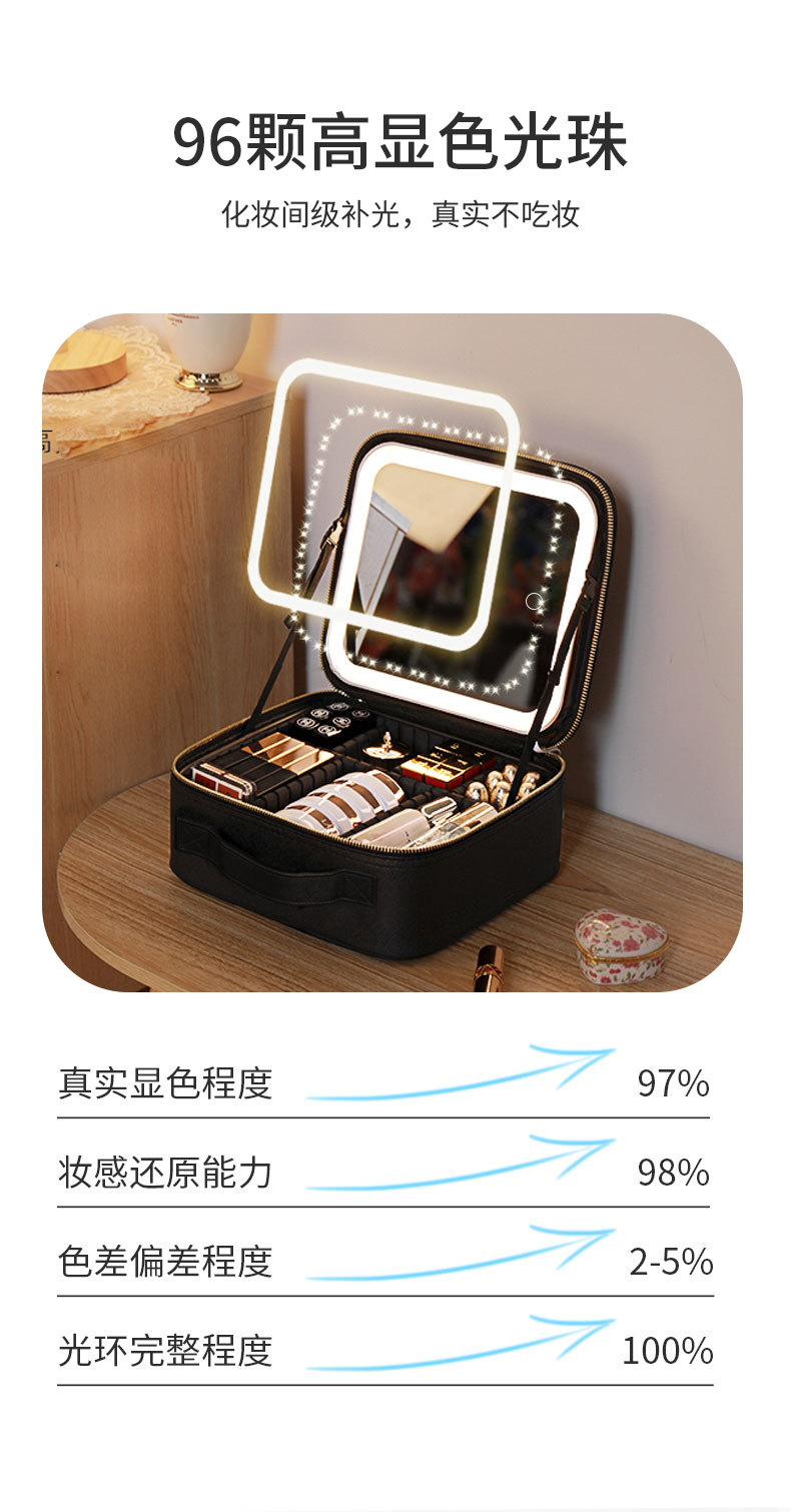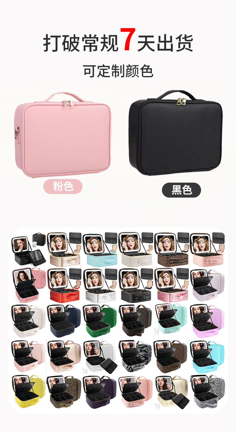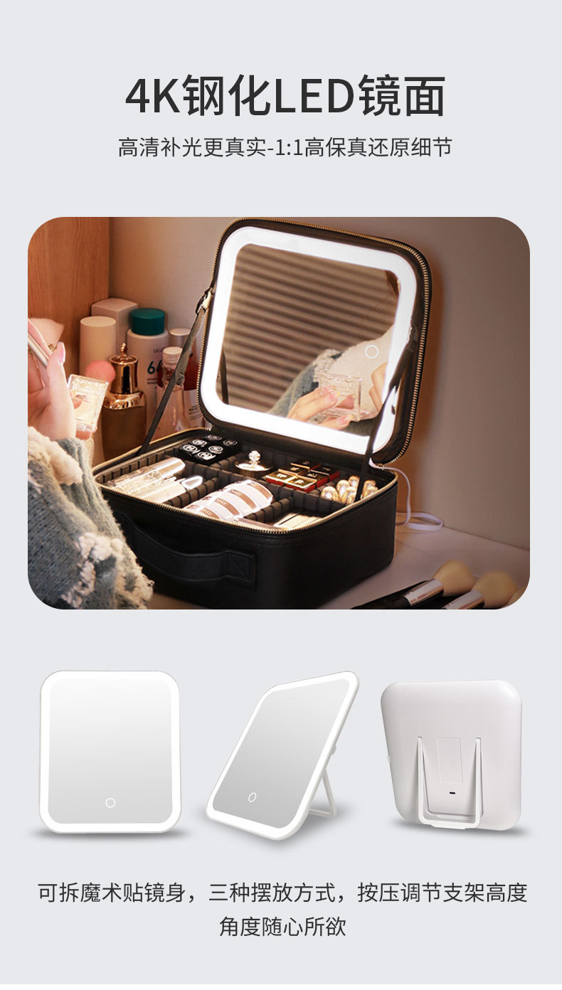 Bolsa de cosméticos con luz, espejo LED, bolsa de almacenamiento de gran capacidad, bolsa de viaje portátil, caja de cosméticos extraíble grande