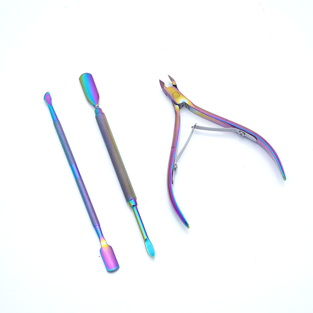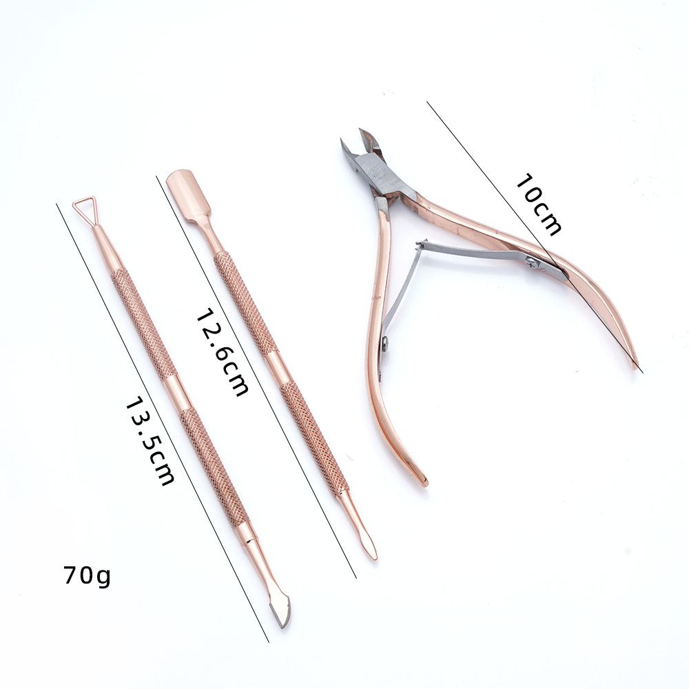 Manicura, manicura, removedor de uñas, juego de tres piezas, corte de piel muerta de acero inoxidable, tamaño, juego de empuje de acero de doble cabezal, fábrica al por mayor