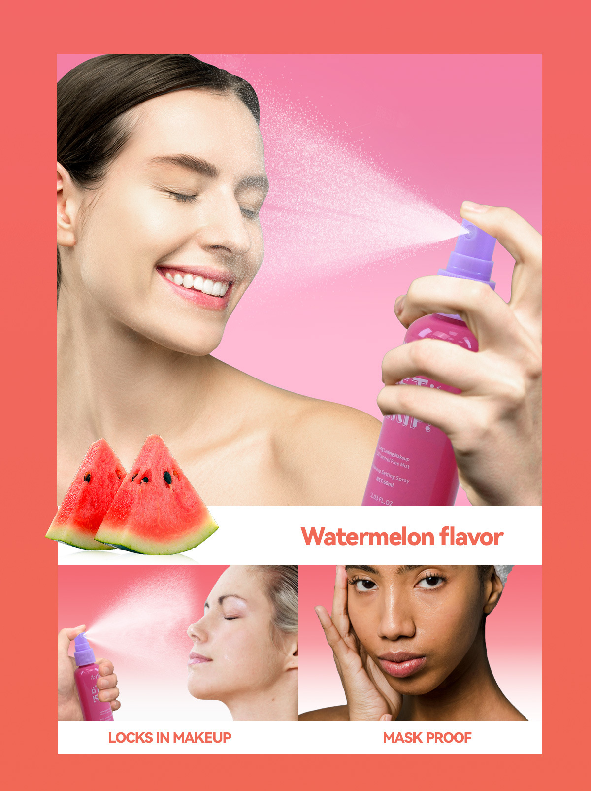 MAFFICK aerosol de maquillaje con sabor a sandía transfronterizo seco, hidratante, control de aceite, eliminación de maquillaje, duradero, impermeable y resistente al sudor, portátil 60ml