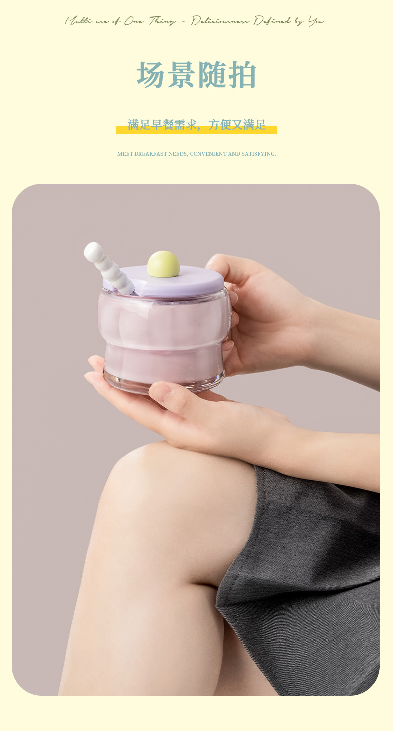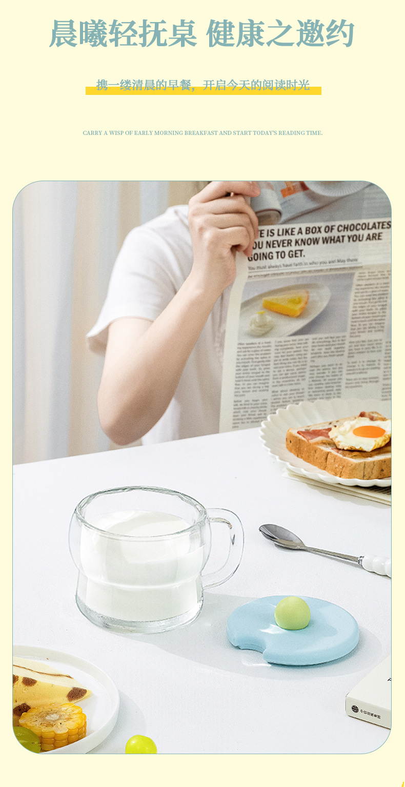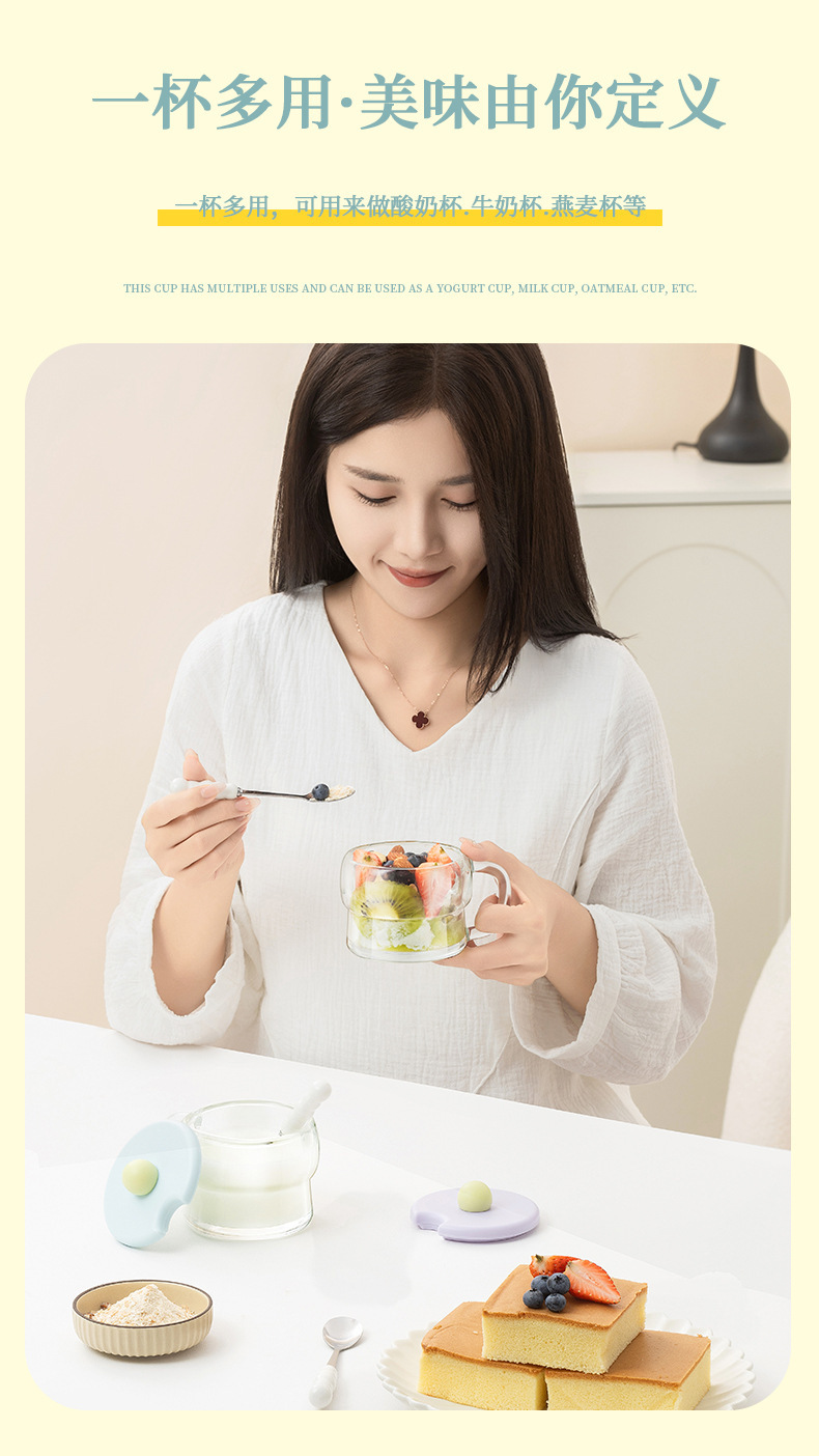 Taza transparente de alto valor Taza de desayuno con tapa Cuchara Taza de leche Mango Taza de avena Taza de vidrio Taza de yogur de leche de soja