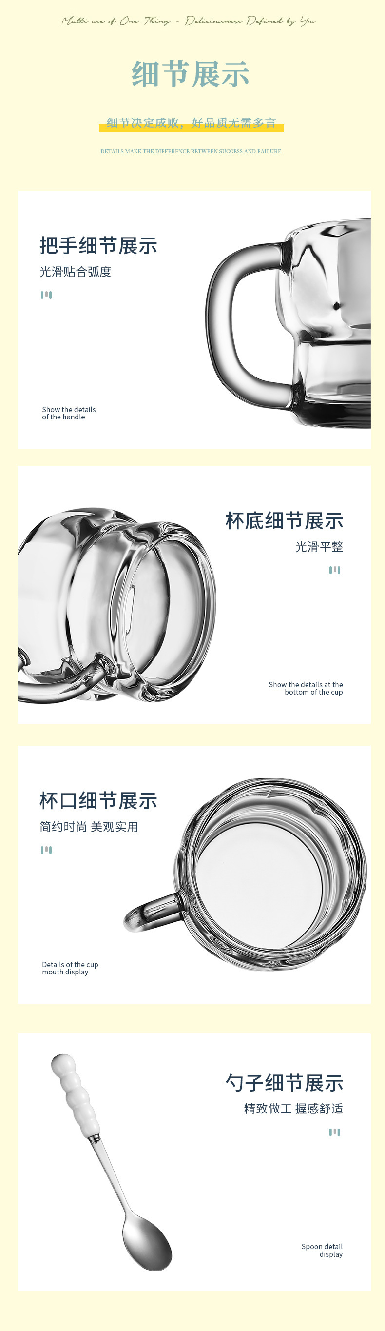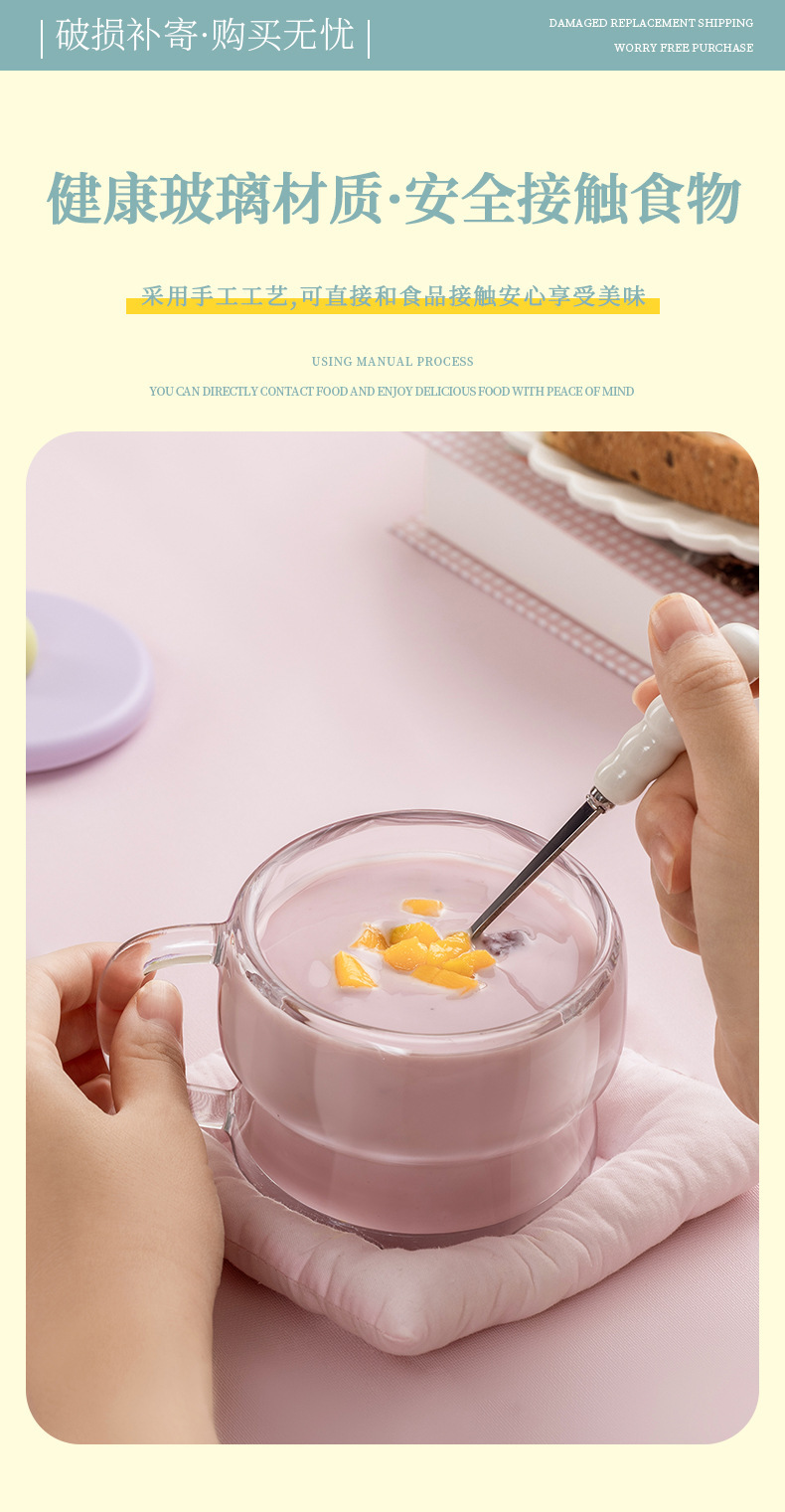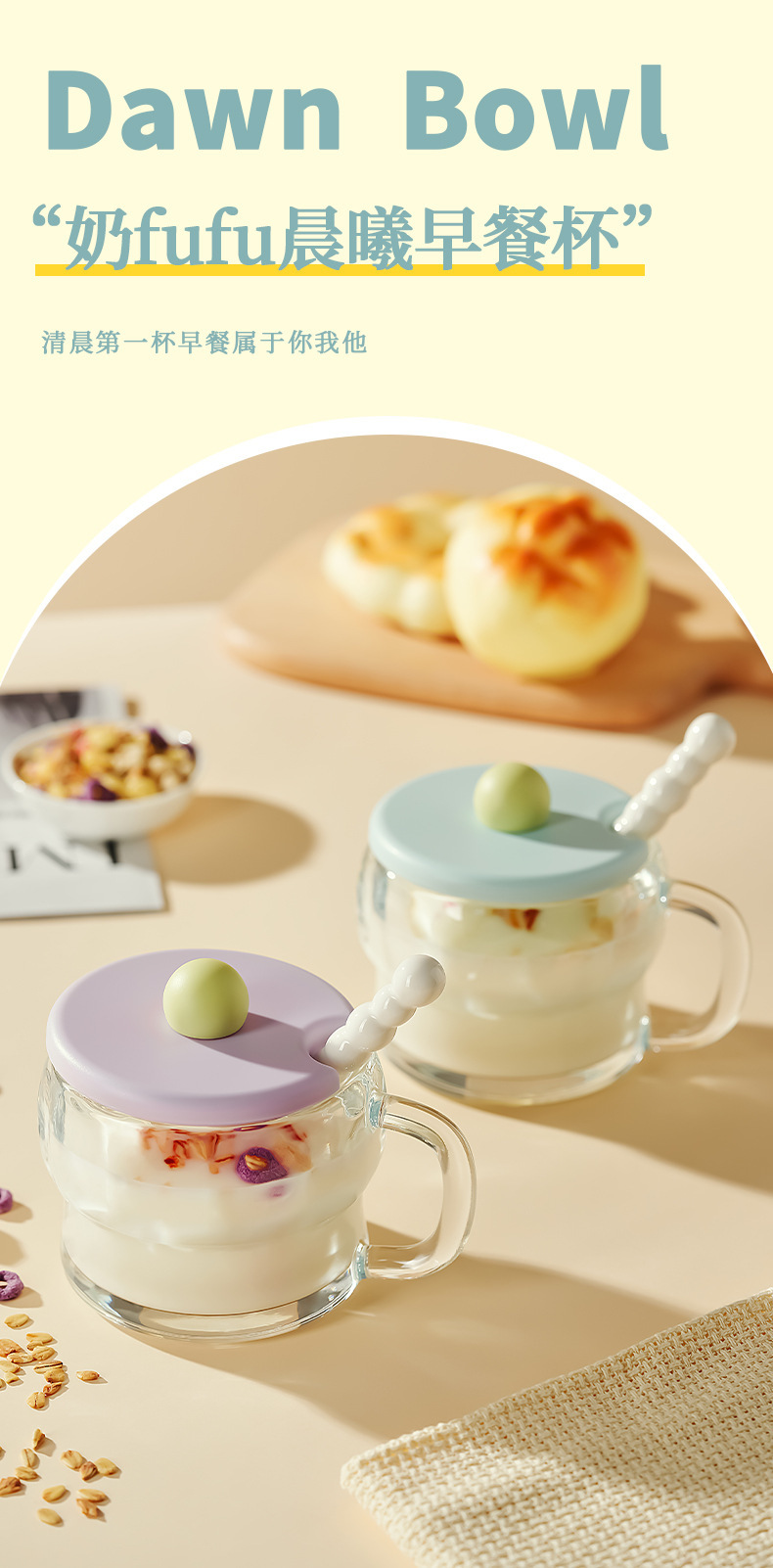 Taza transparente de alto valor Taza de desayuno con tapa Cuchara Taza de leche Mango Taza de avena Taza de vidrio Taza de yogur de leche de soja