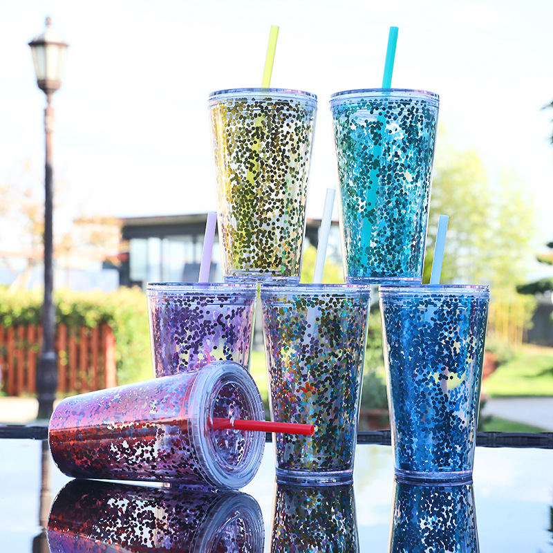 Pajita de plástico de doble capa con logotipo, taza de té con leche, taza simple y portátil, taza de té de frutas con lentejuelas, taza de verano