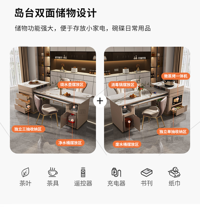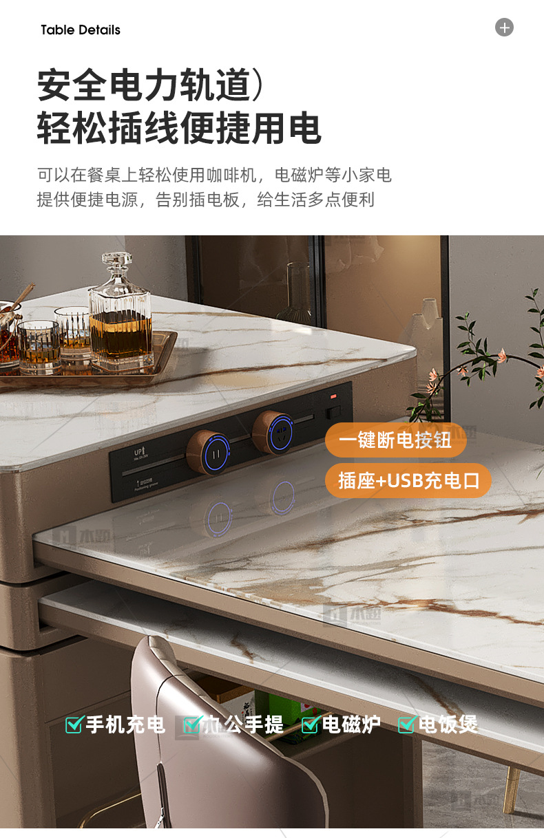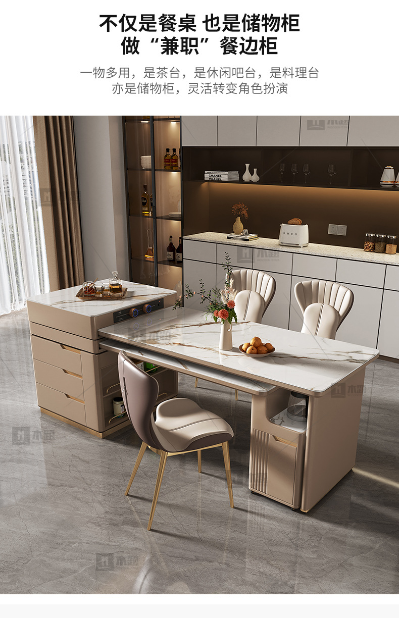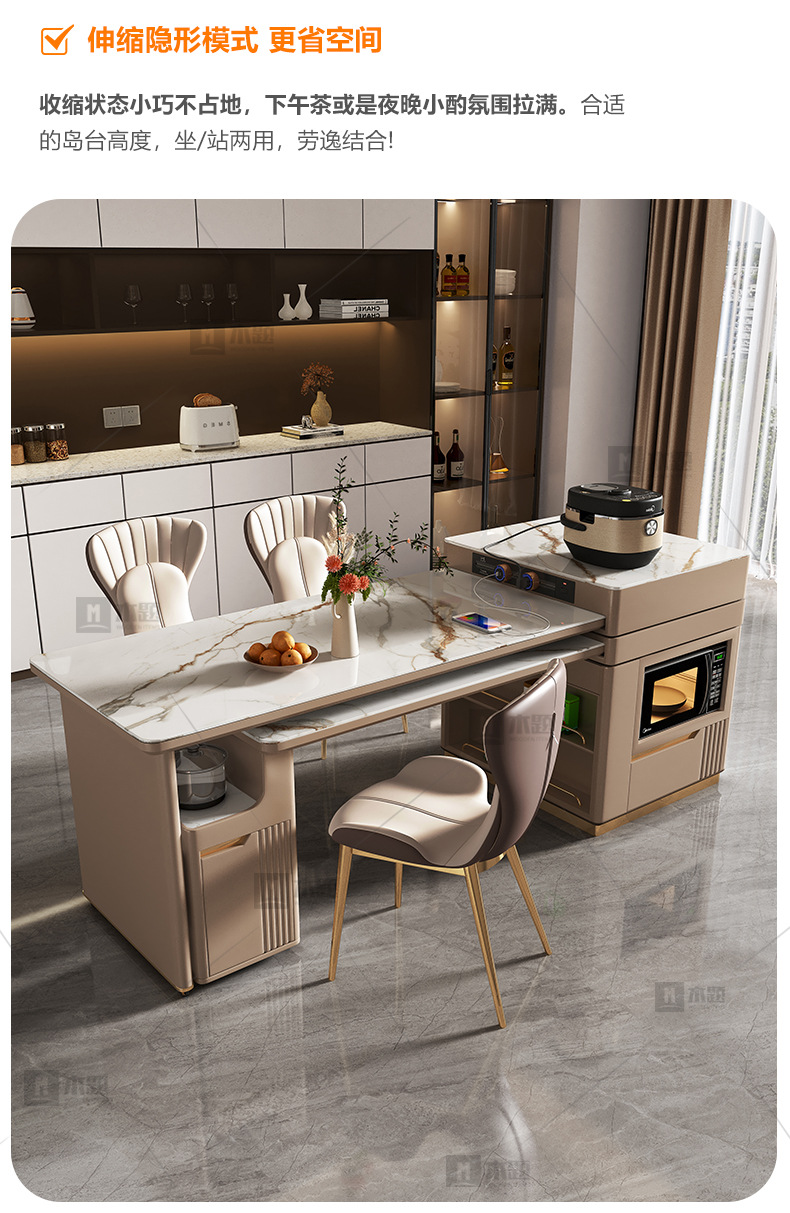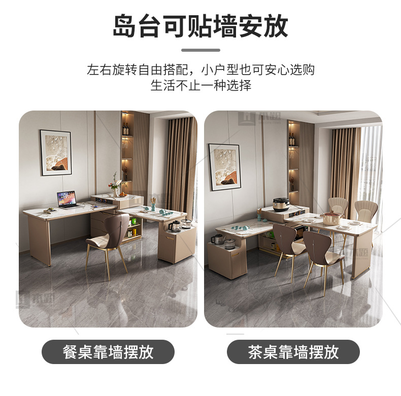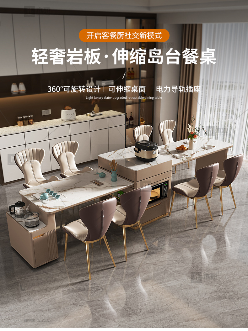 Mesa de mesa de isla de losa de lujo ligero, mesa de comedor, mesa de té giratoria retráctil integrada, mesa de té con cocina de inducción, barra de cocina, mesa de guía y mesa de comedor