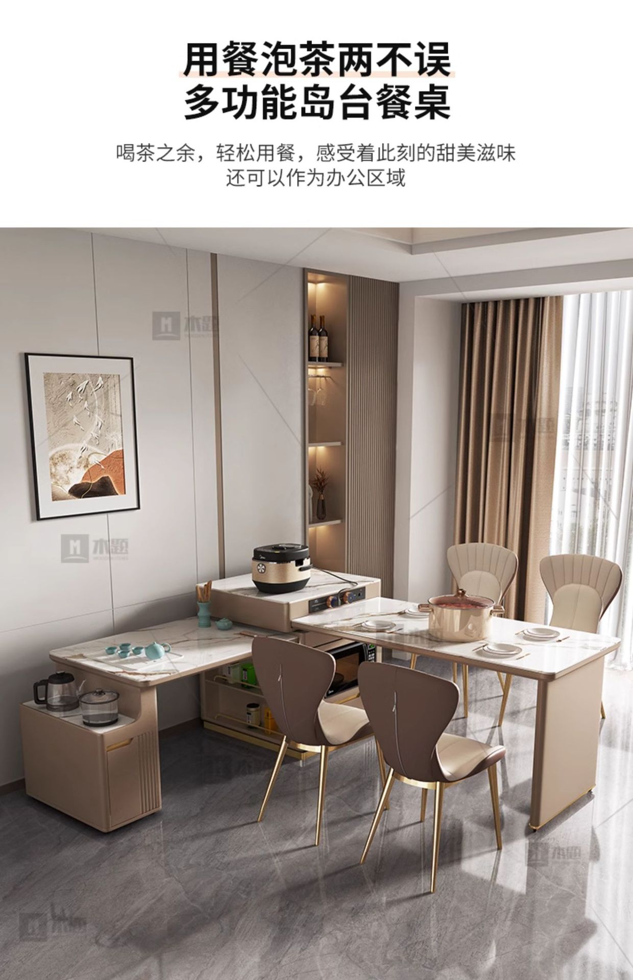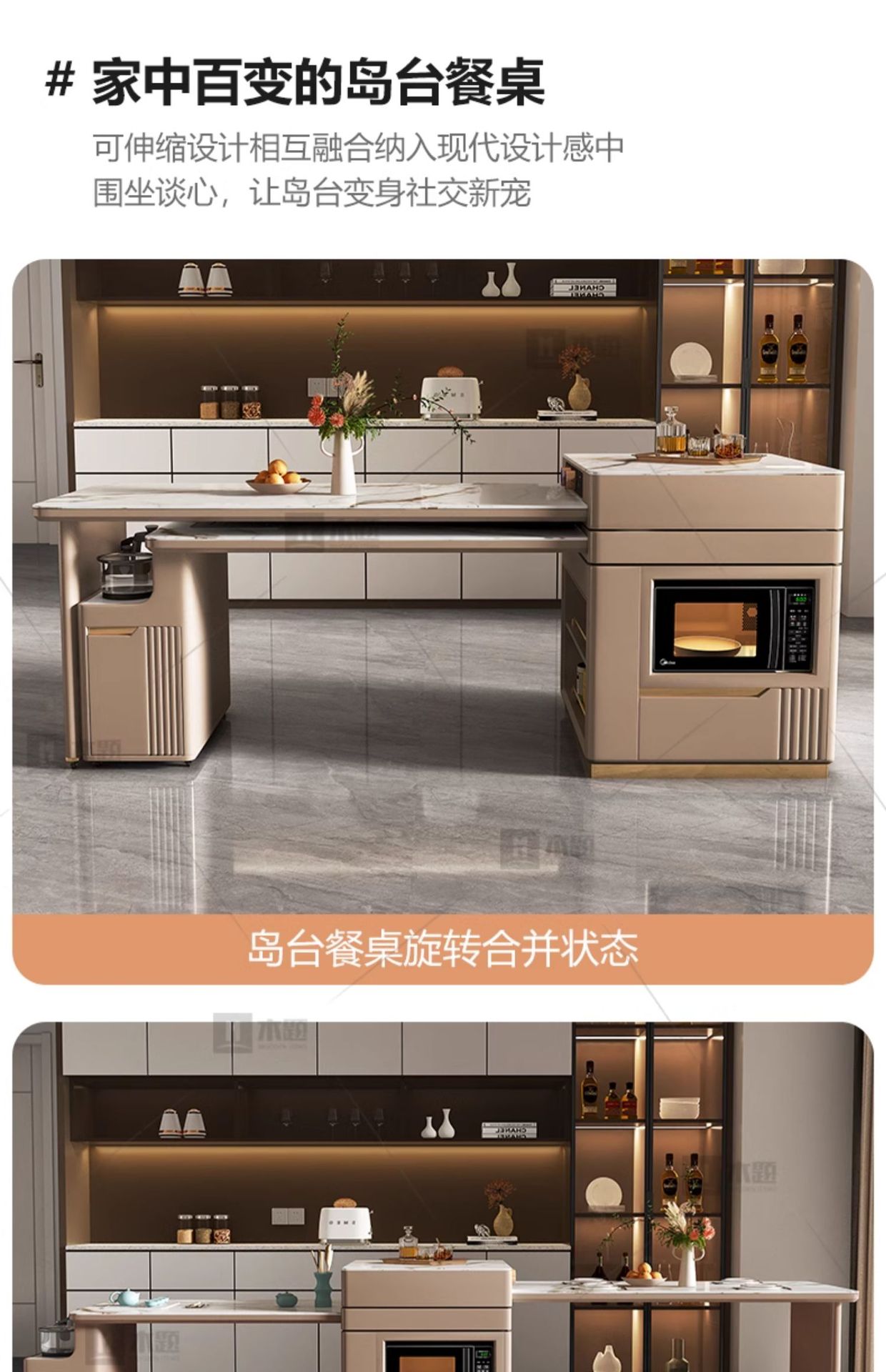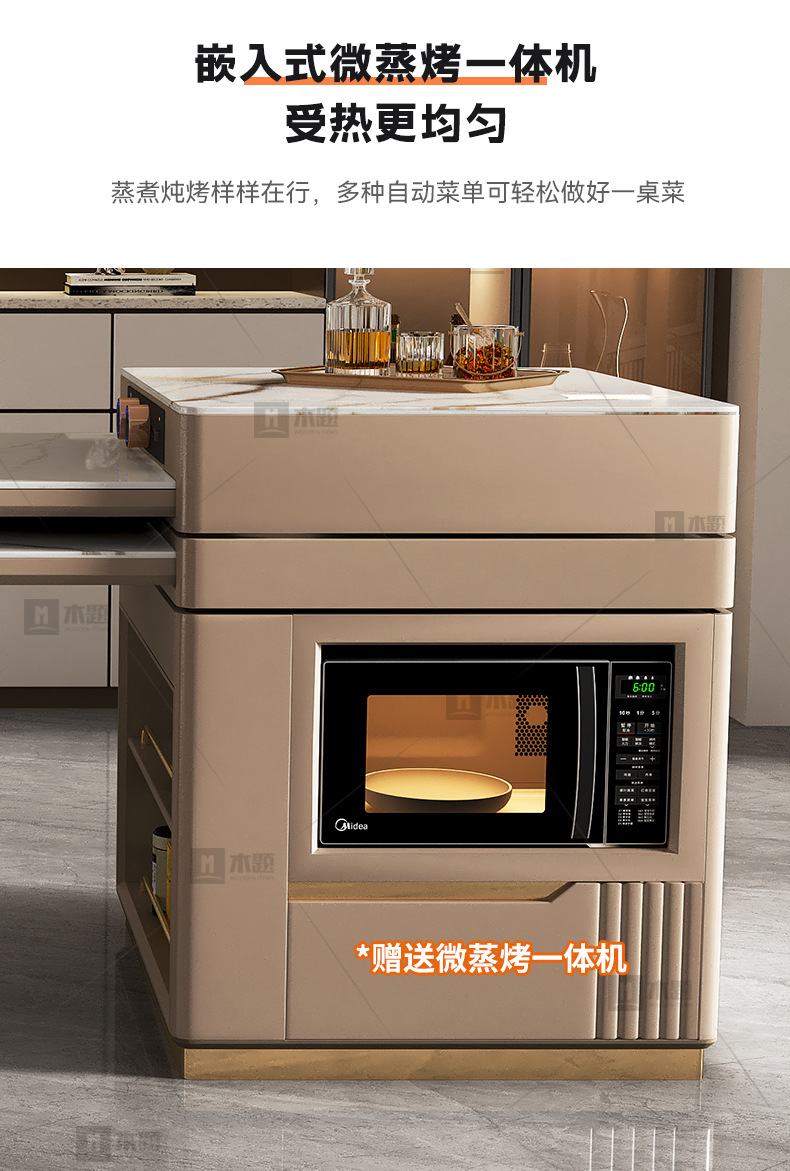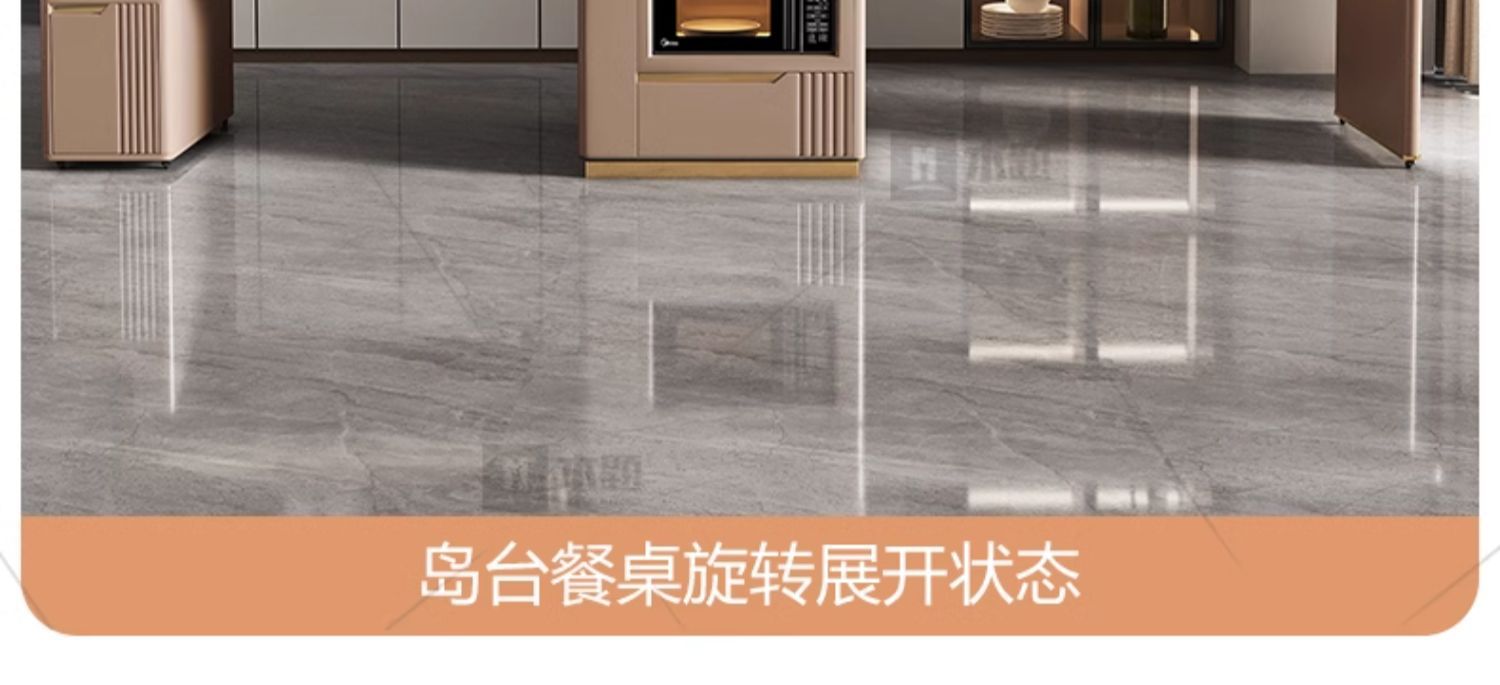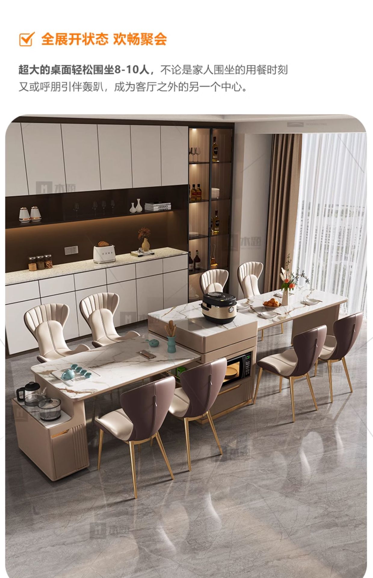 Mesa de mesa de isla de losa de lujo ligero, mesa de comedor, mesa de té giratoria retráctil integrada, mesa de té con cocina de inducción, barra de cocina, mesa de guía y mesa de comedor