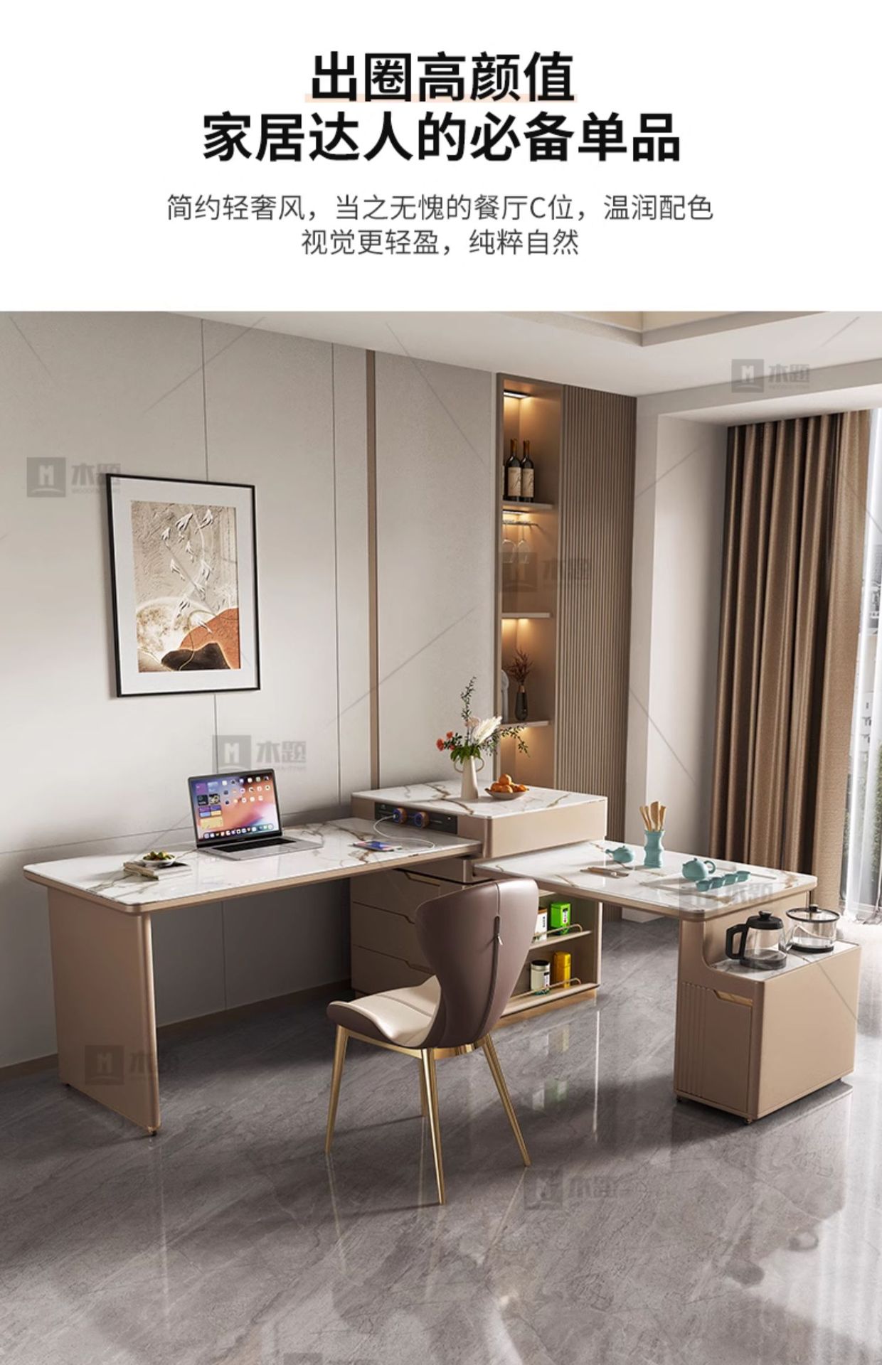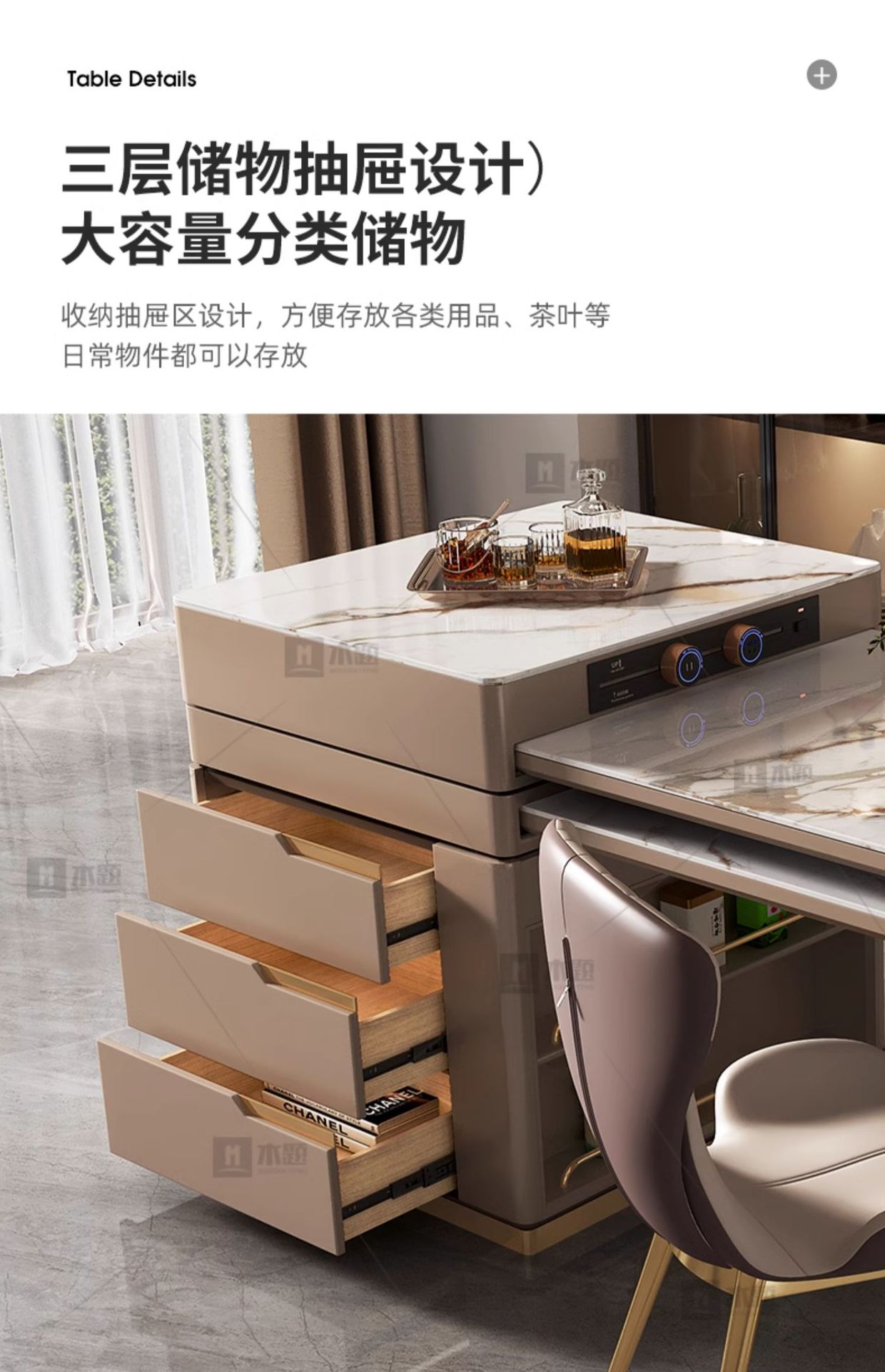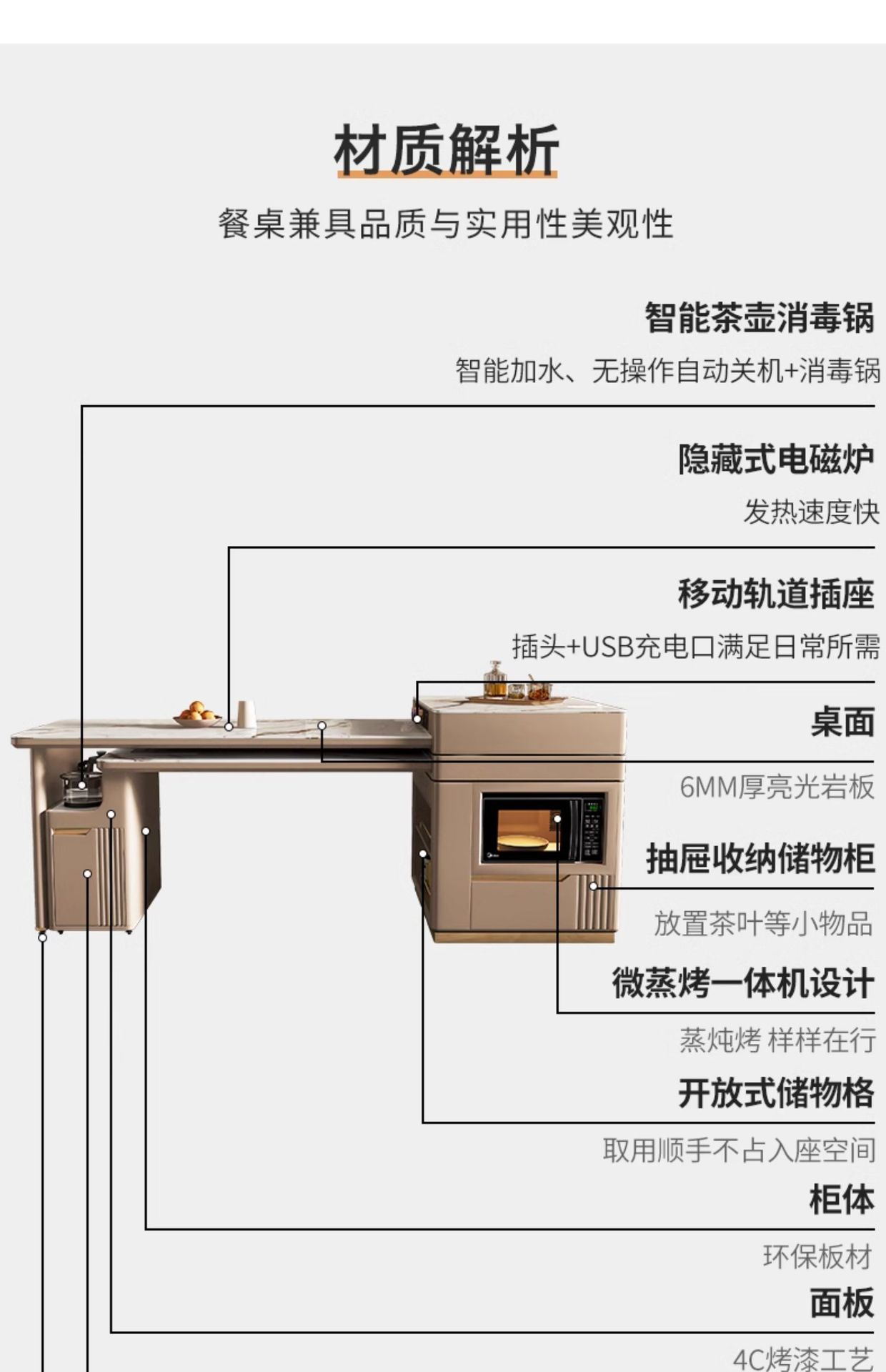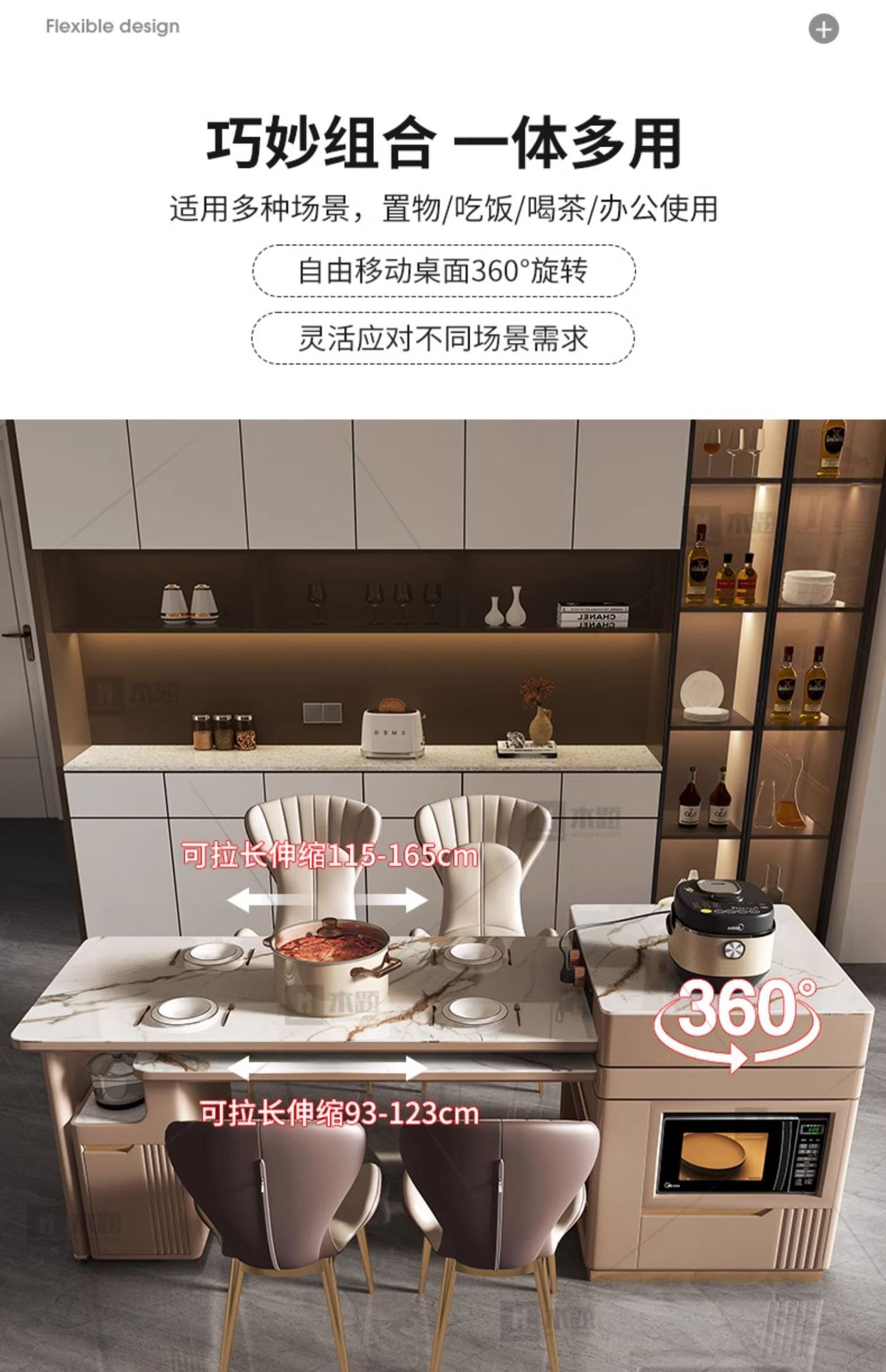Mesa de mesa de isla de losa de lujo ligero, mesa de comedor, mesa de té giratoria retráctil integrada, mesa de té con cocina de inducción, barra de cocina, mesa de guía y mesa de comedor