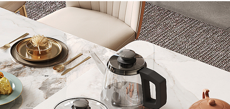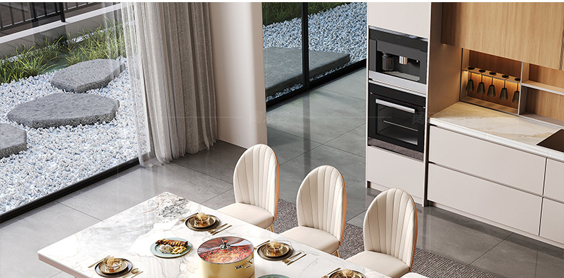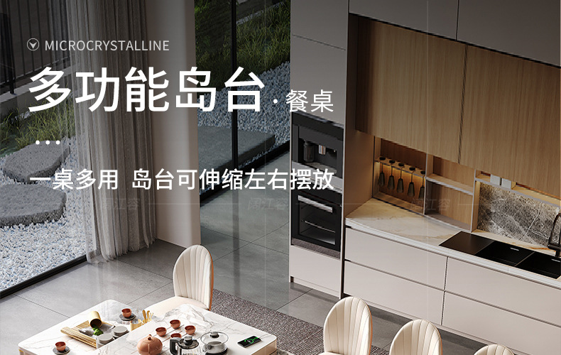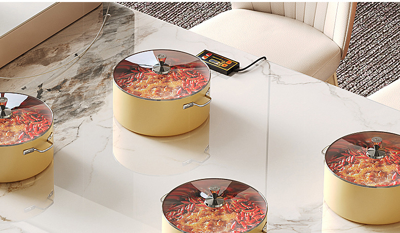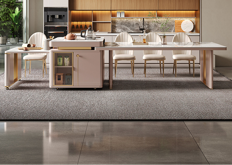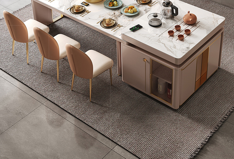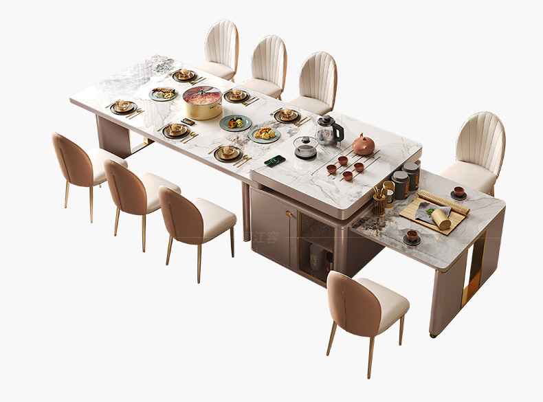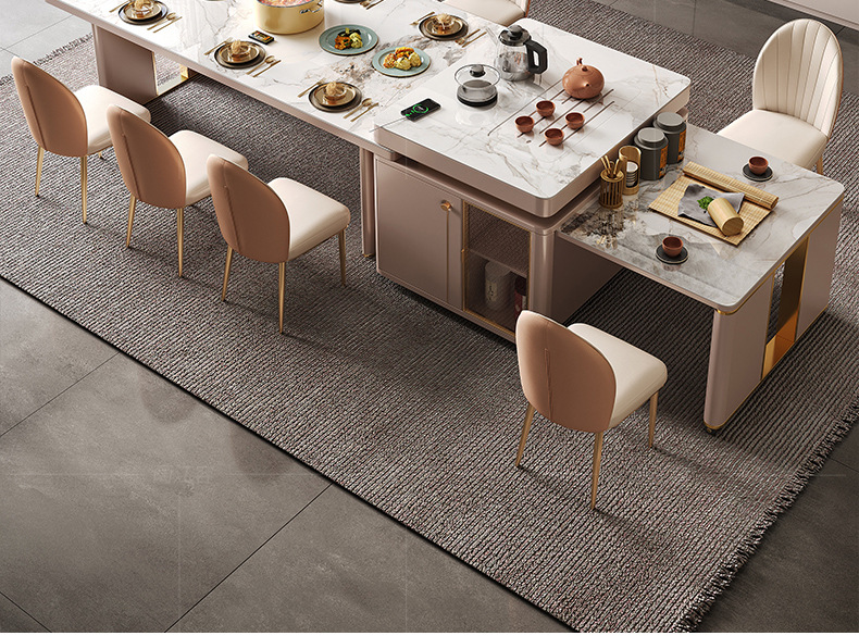 Mesa de comedor de mesa de mesa de isla integrada, losa de roca de lujo ligero, giratoria, retráctil, móvil, cocina de inducción doméstica moderna, combinación de mesa y silla de comedor