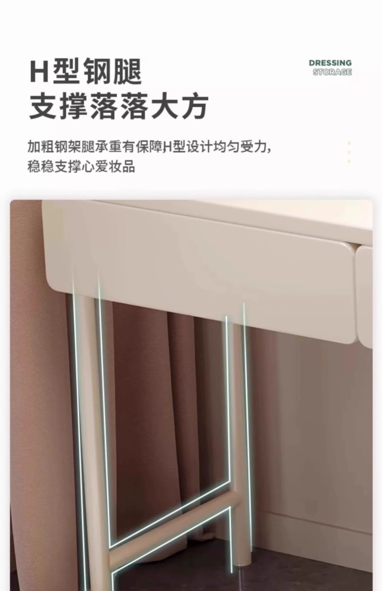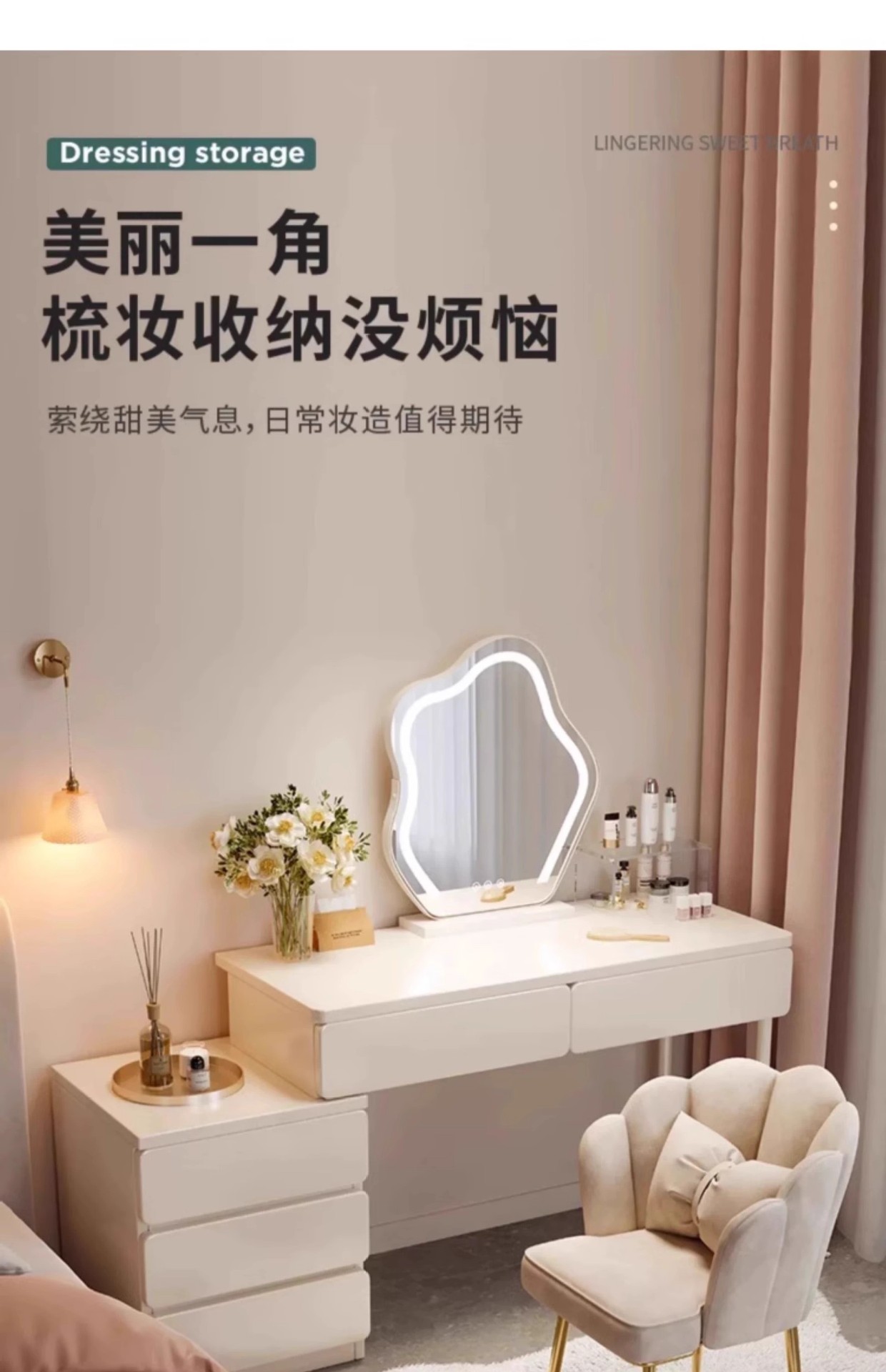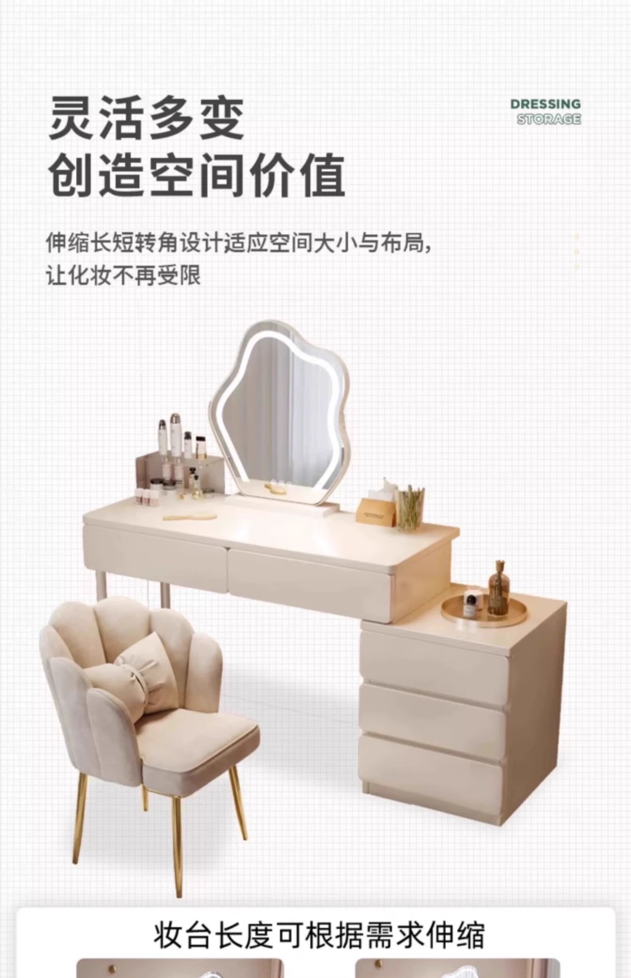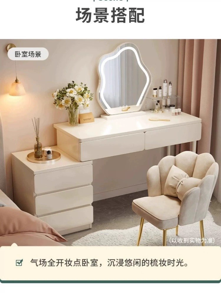 Tocador de estilo crema de madera maciza, gabinete integrado, mesa de maquillaje, dormitorio de apartamento pequeño, tocador minimalista moderno, lujo ligero de alta gama