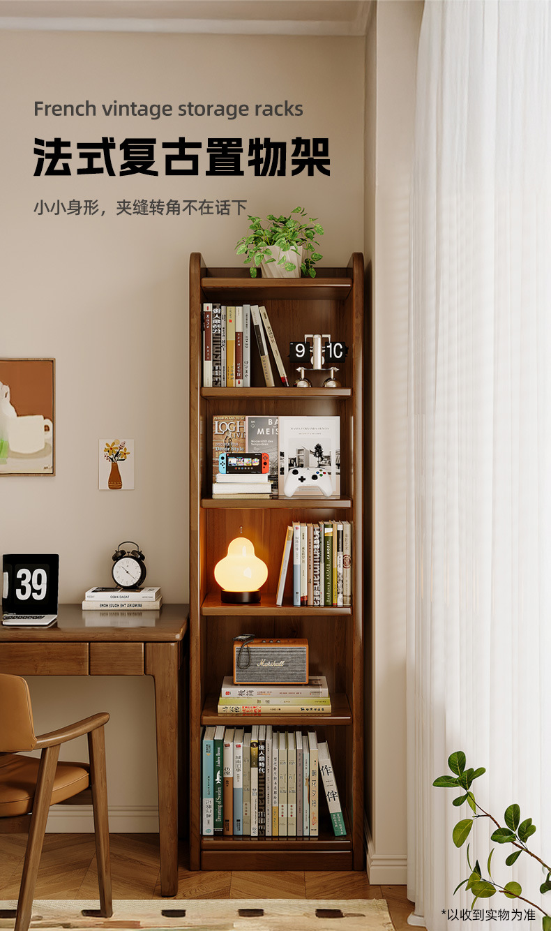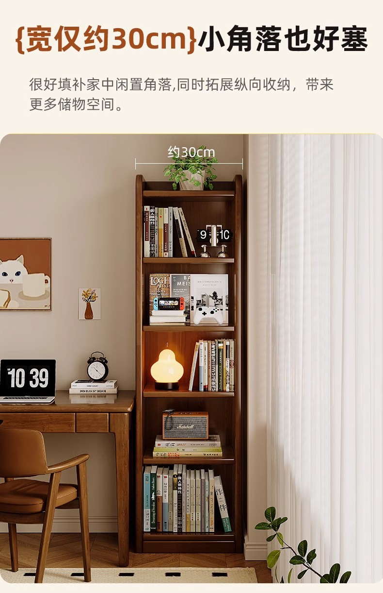 Estantería de madera maciza, estante de piso a techo, una pieza contra la pared, armario de almacenamiento de costura estrecha de color nogal, estantería para el hogar