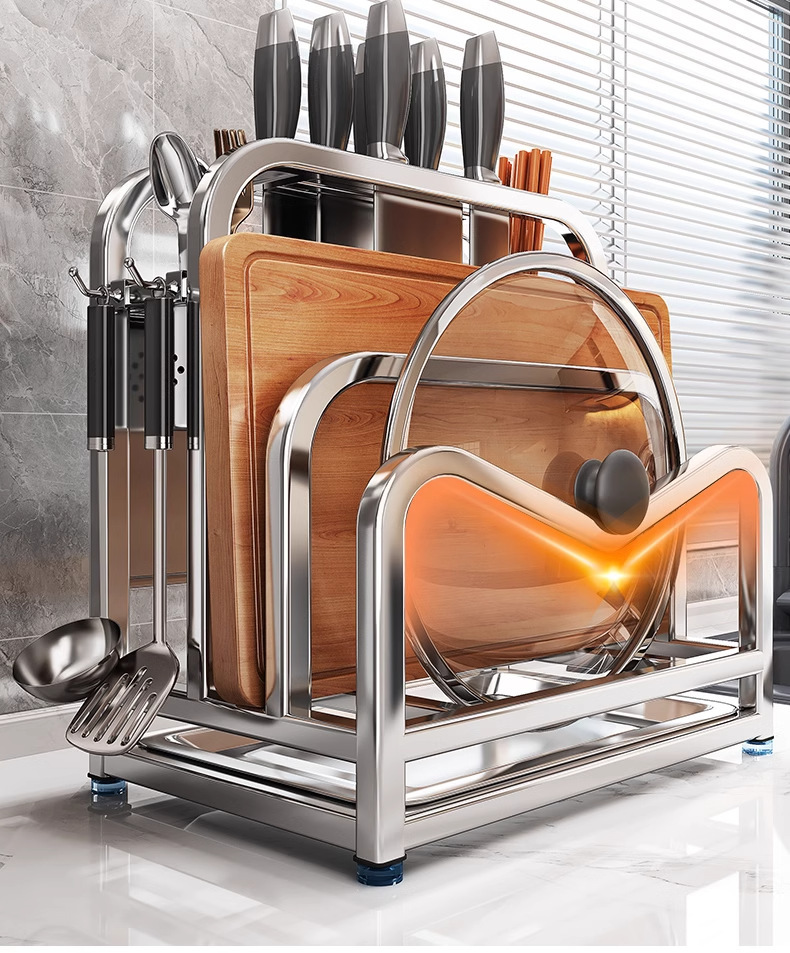 Estante de herramientas de cocina de acero inoxidable 304, soporte multifuncional para tabla de cortar y almacenamiento integrado