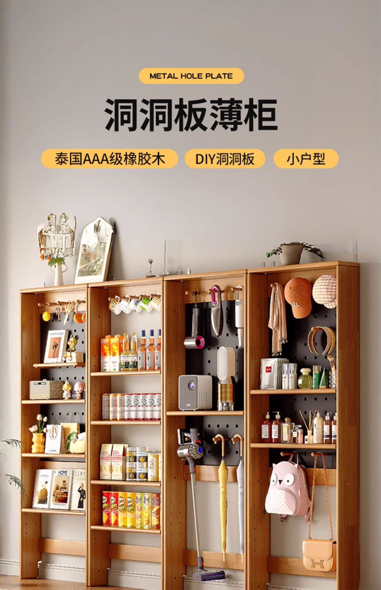 Tablero de agujero de madera maciza Estante ultrafino Gabinete delgado de queso de color madera de cerezo Estante de almacenamiento de piso sin grietas en la parte trasera de la puerta perforada