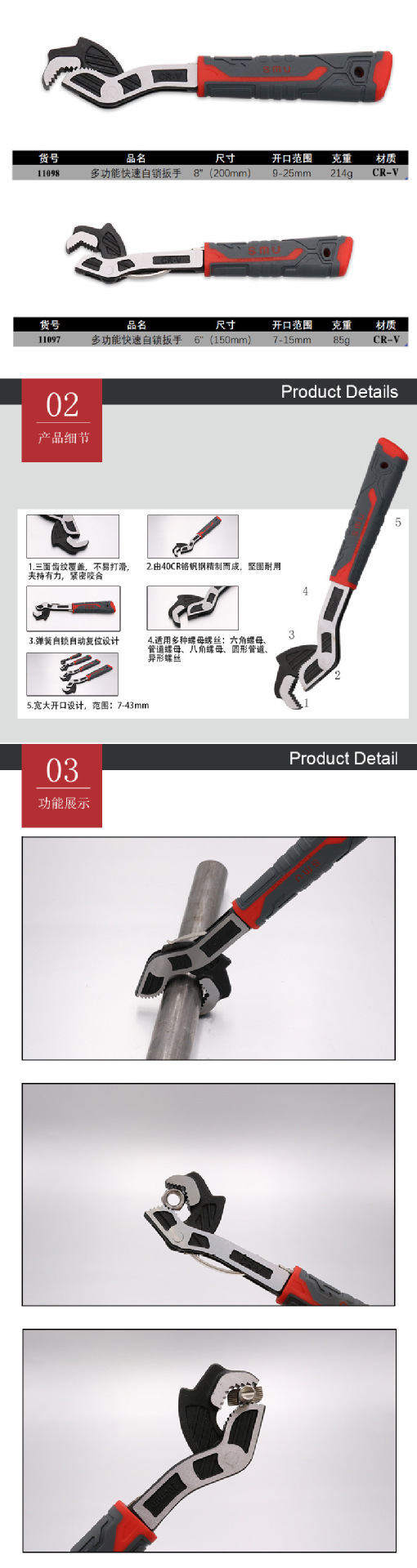 | Especificaciones y modelos | Llave ajustable autoblocante multifuncional-6 pulgadas,Llave ajustable autoblocante multifuncional-8 pulgadas,Llave ajustable autoblocante multifuncional-10 pulgadas,Llave ajustable autoblocante multifuncional-12 pulgadas |