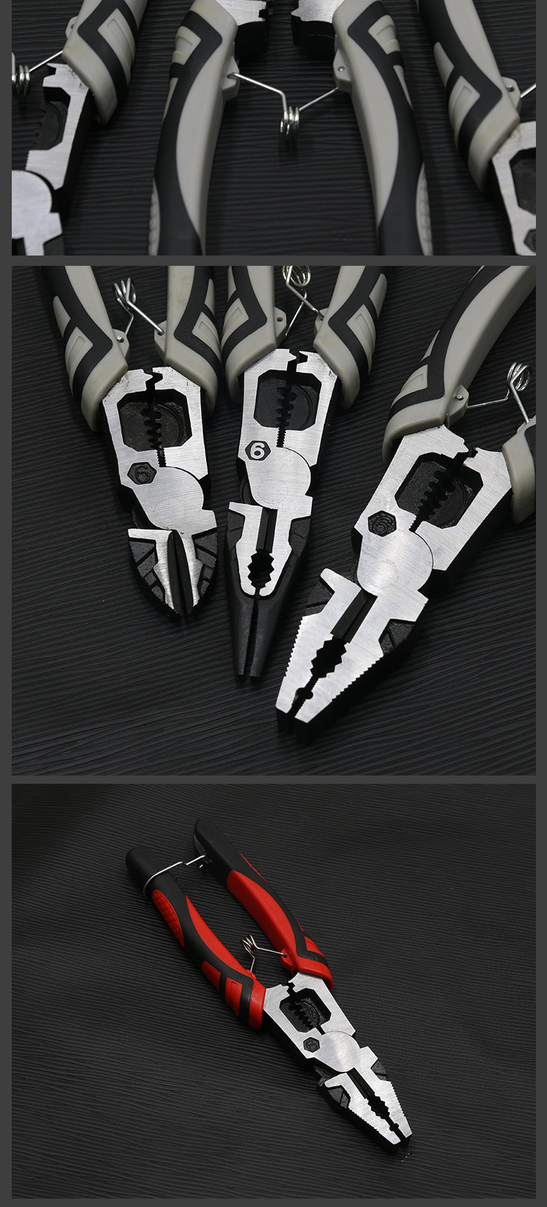 | Modelo | Alicates de alambre pelado rojo de 9 pulgadas,Alicates de punta fina con cordón pelado rojo de 9 pulgadas,Alicates biselados rojos de 9 pulgadas,Alicates de alambre pelado gris negro de 9 pulgadas,Alicates de punta de aguja de línea pelada gris negro de 9 pulgadas,Alicates biselados negros y grises de 9 pulgadas |