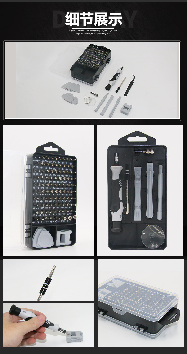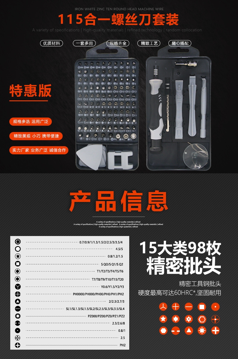 | Modelo de especificación | Destornillador 115 en uno gris (versión especial),Destornillador 115 en uno púrpura (versión especial),Destornillador 115 en uno amarillo (versión especial),Destornillador 115 en uno rojo (versión especial),Destornillador 115 en uno azul (versión especial) |