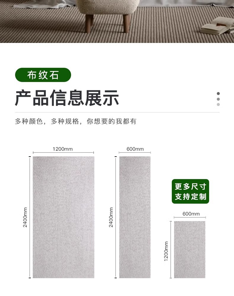 | Especificaciones | Blanco de arroz de piedra con patrón de tela/1200*600,Piedra de tela beige/1200*600,Piedra de tela negra/1200*600 |