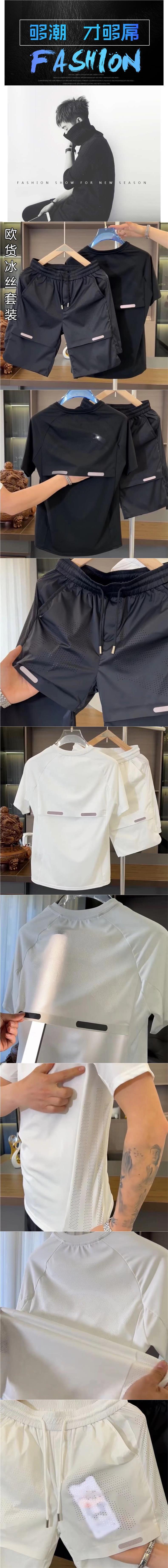 Traje deportivo casual de seda de hielo de moda de lujo ligero para hombres de verano, pantalones cortos de manga corta de malla transpirable de alta elasticidad, traje de dos piezas