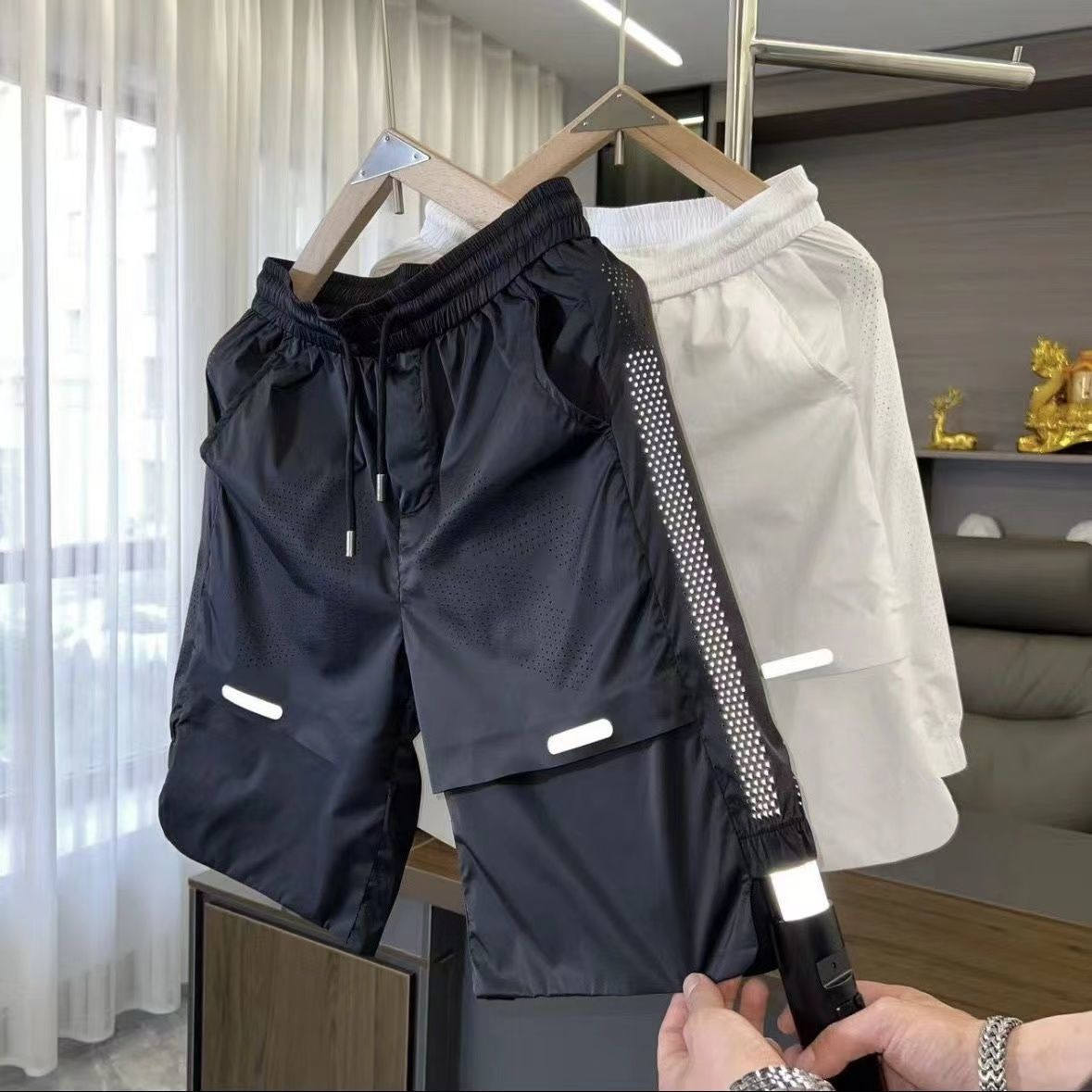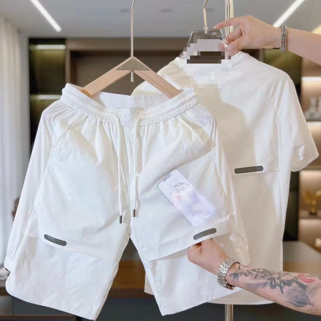 Camiseta de seda de hielo con costuras transpirables de verano, pantalones cortos, traje de ocio deportivo de secado rápido suelto de alta elasticidad para hombre de dos piezas
