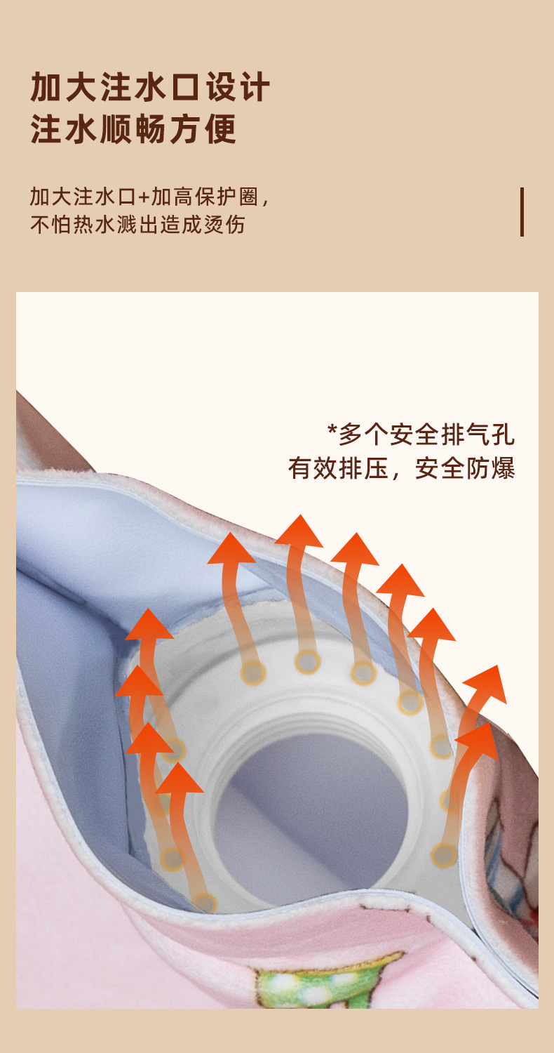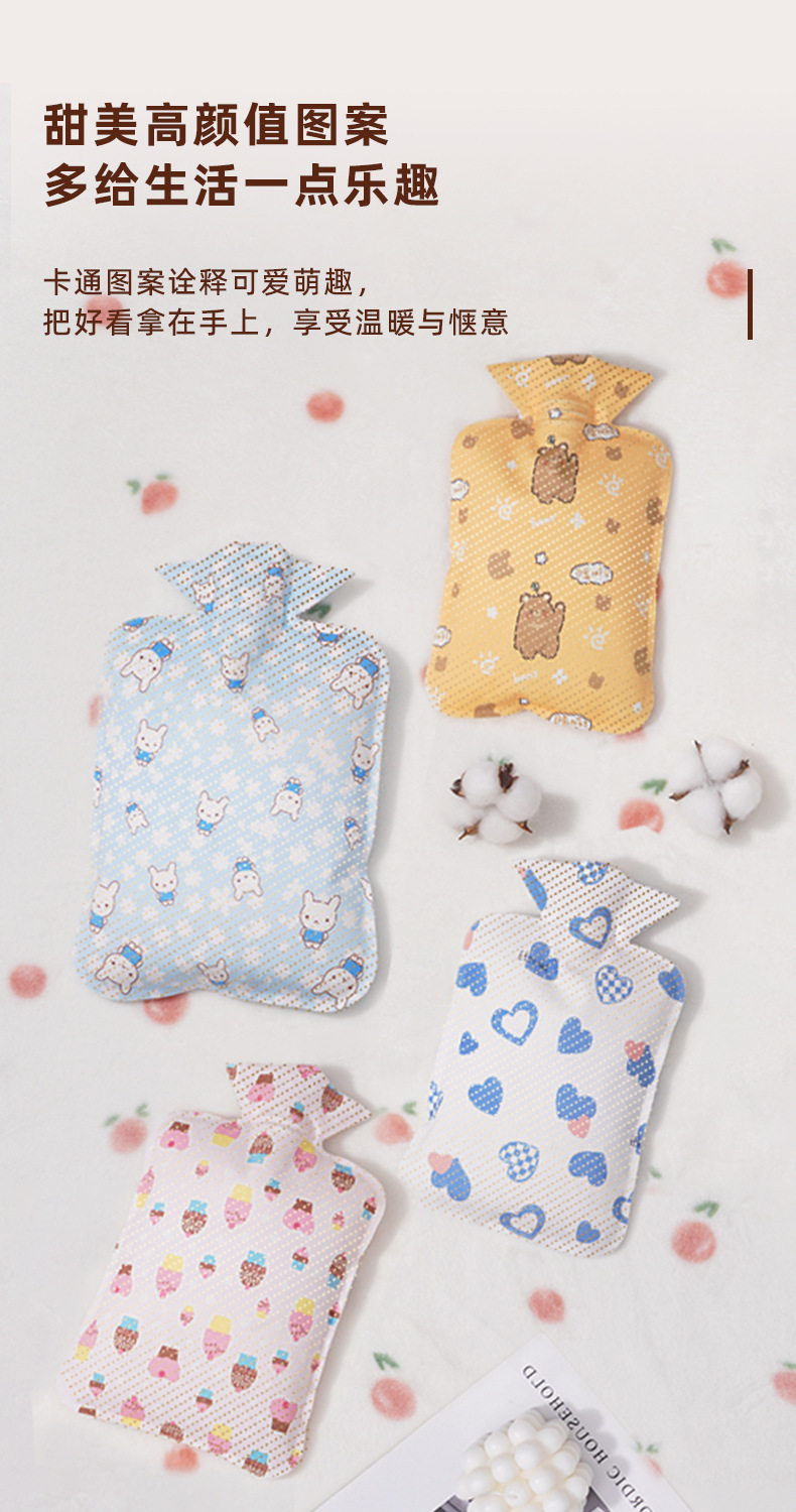 Bolsa de agua caliente, inyección de agua, bolsa de agua caliente, estómago caliente, manta cálida, pies calientes, tela de estampado en caliente, cubierta de tela de felpa, calentador de manos de riego al por mayor