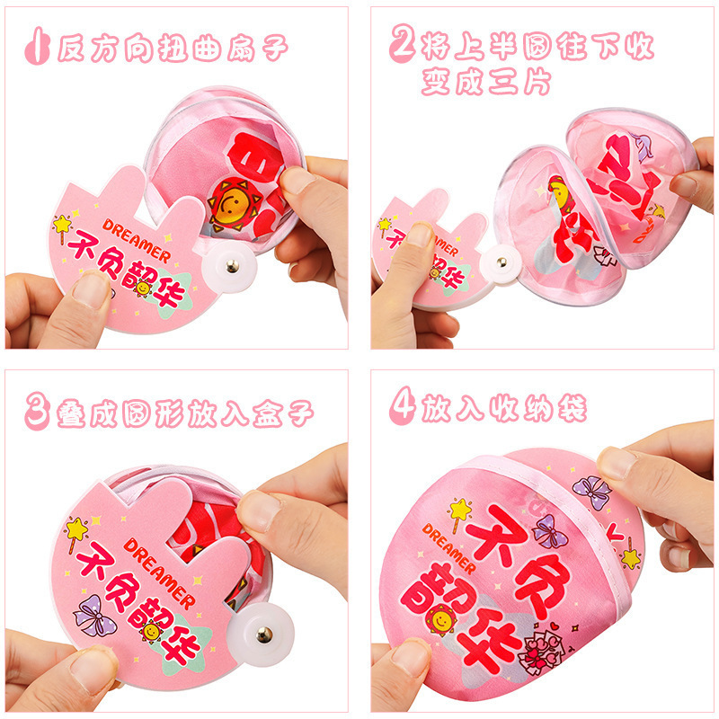 Verano lindo mini tela ventilador plegable portátil portátil regalo de vacaciones ventilador plegable con mango pequeño ventilador redondo