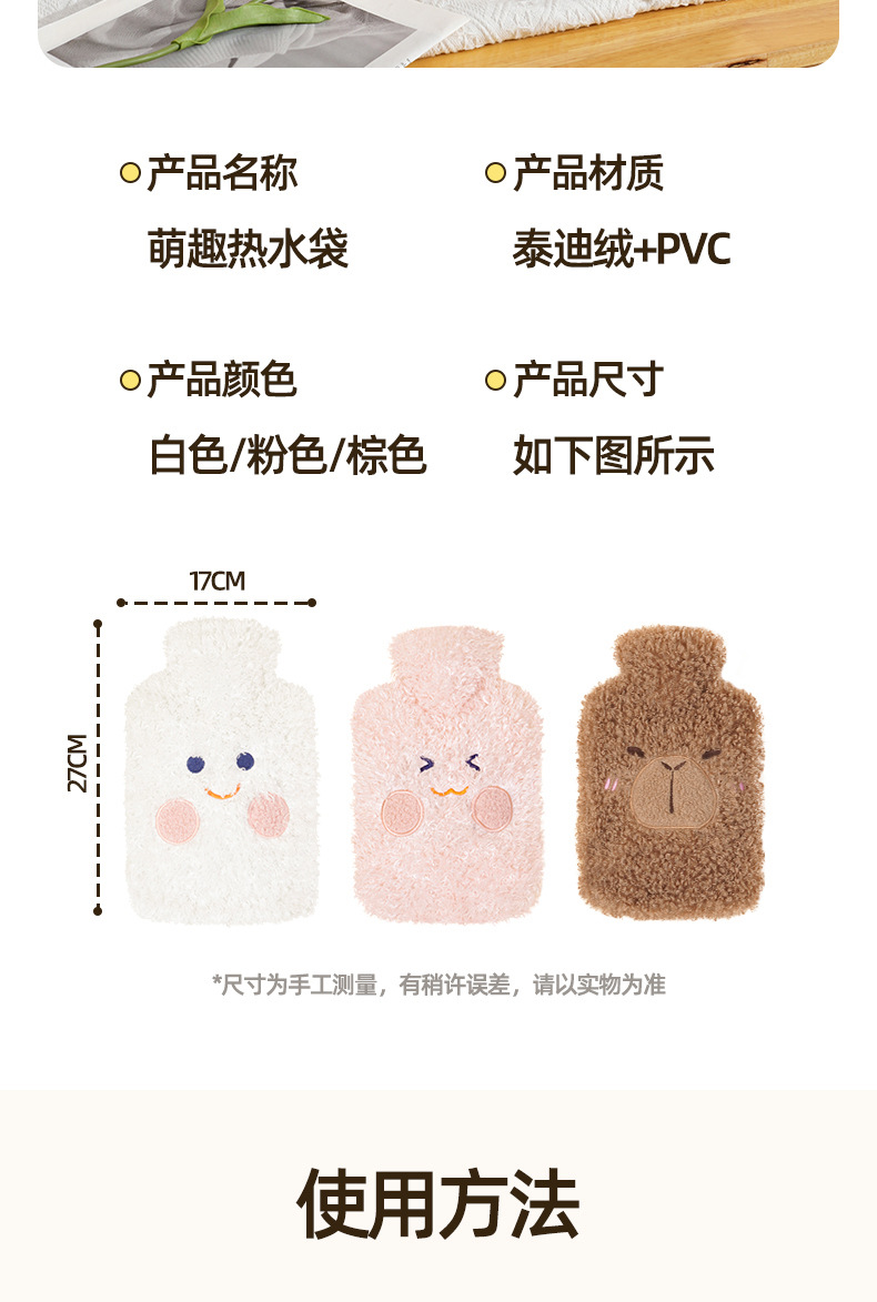 Bolsa de agua caliente riego gran Kapibala funda de tela de felpa inyección de agua calentador de manos vientre cálido bolsa de agua caliente de pvc al por mayor