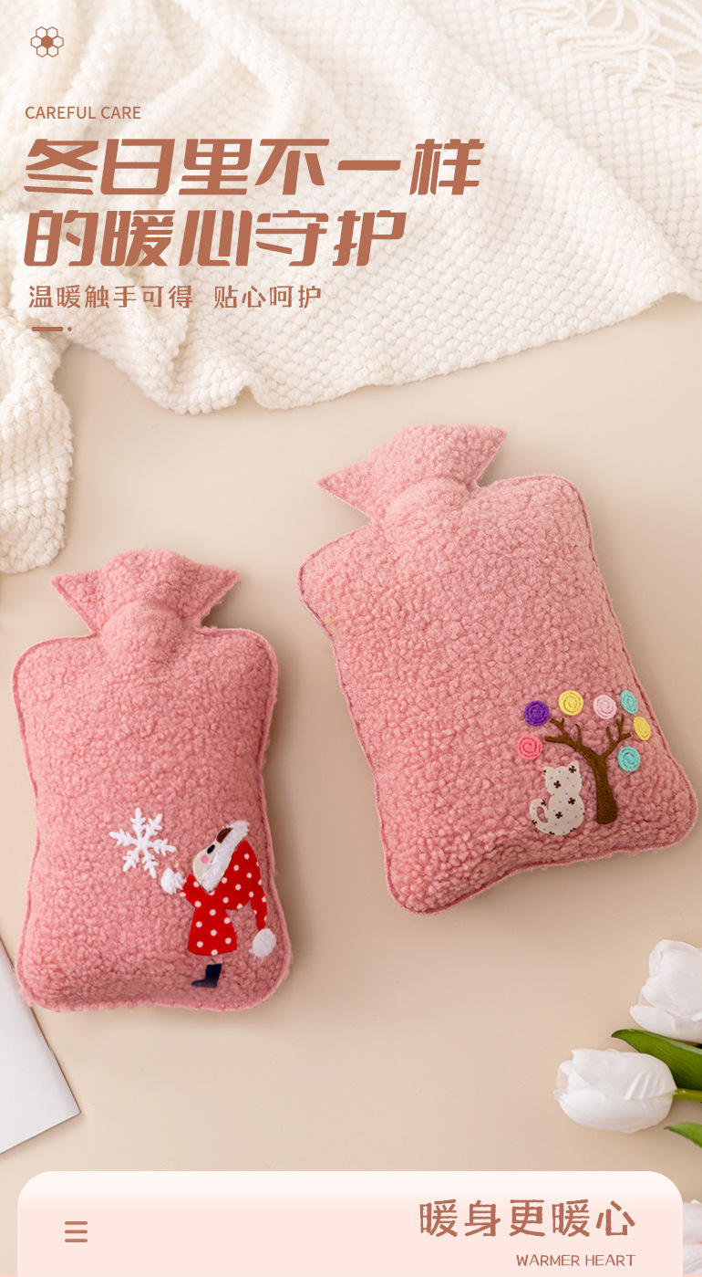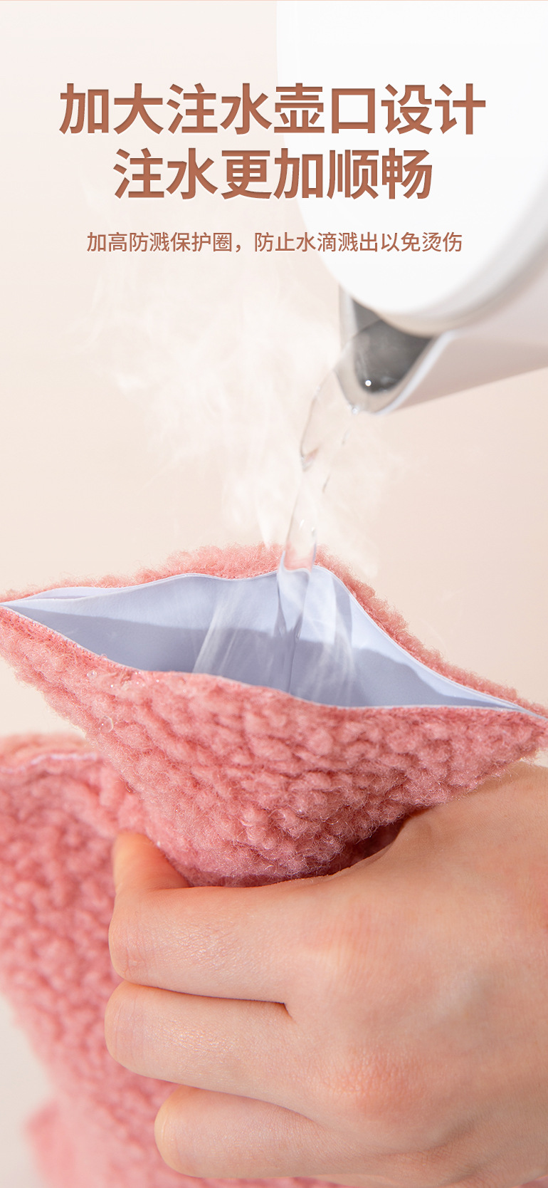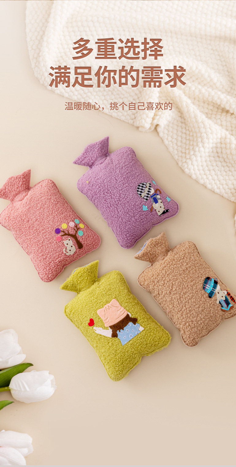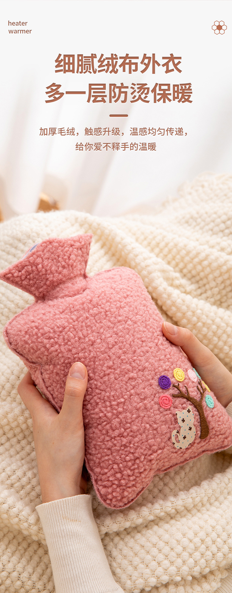 Lexueer tela bolsa de agua caliente de plástico inyección de agua hogar a prueba de explosiones riego calentador de mano tela de felpa bordado bolsa de agua caliente al por mayor