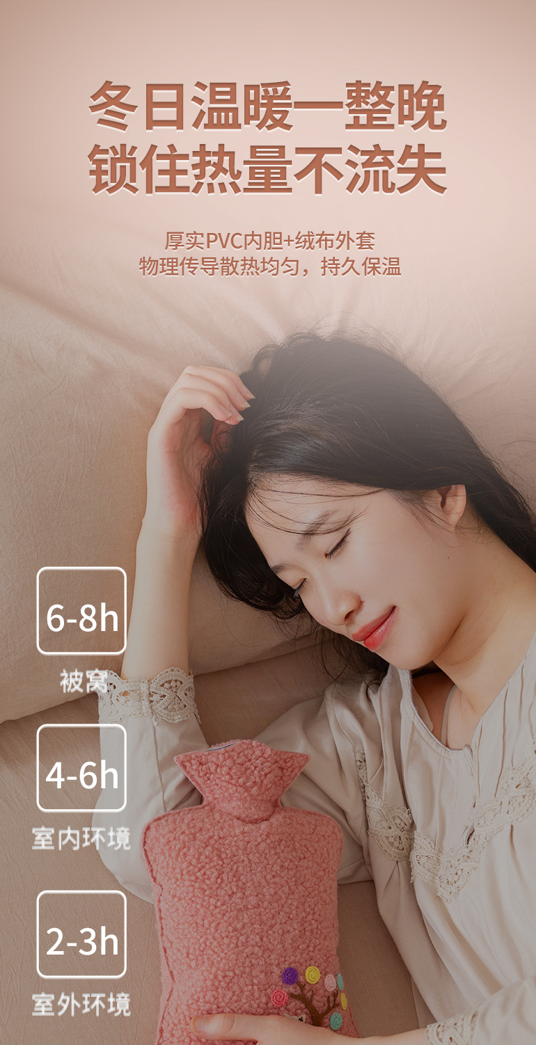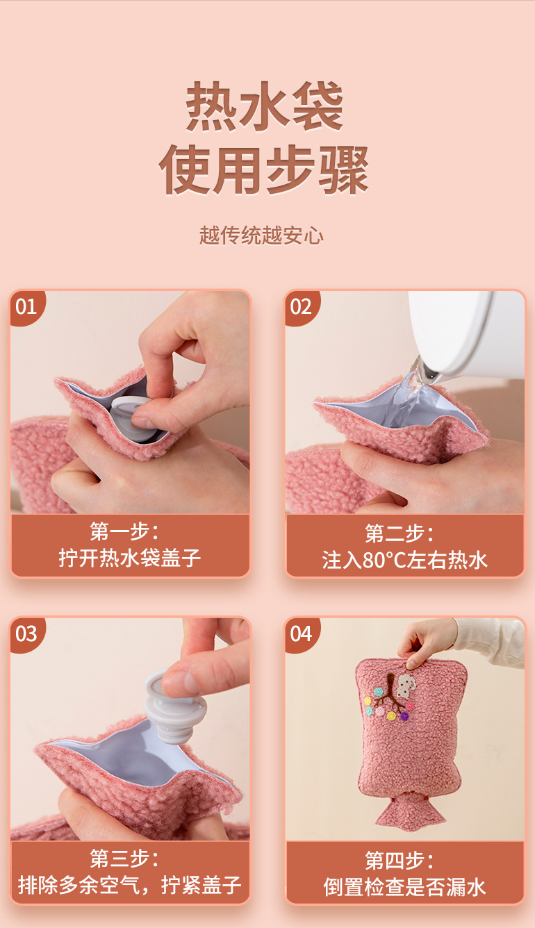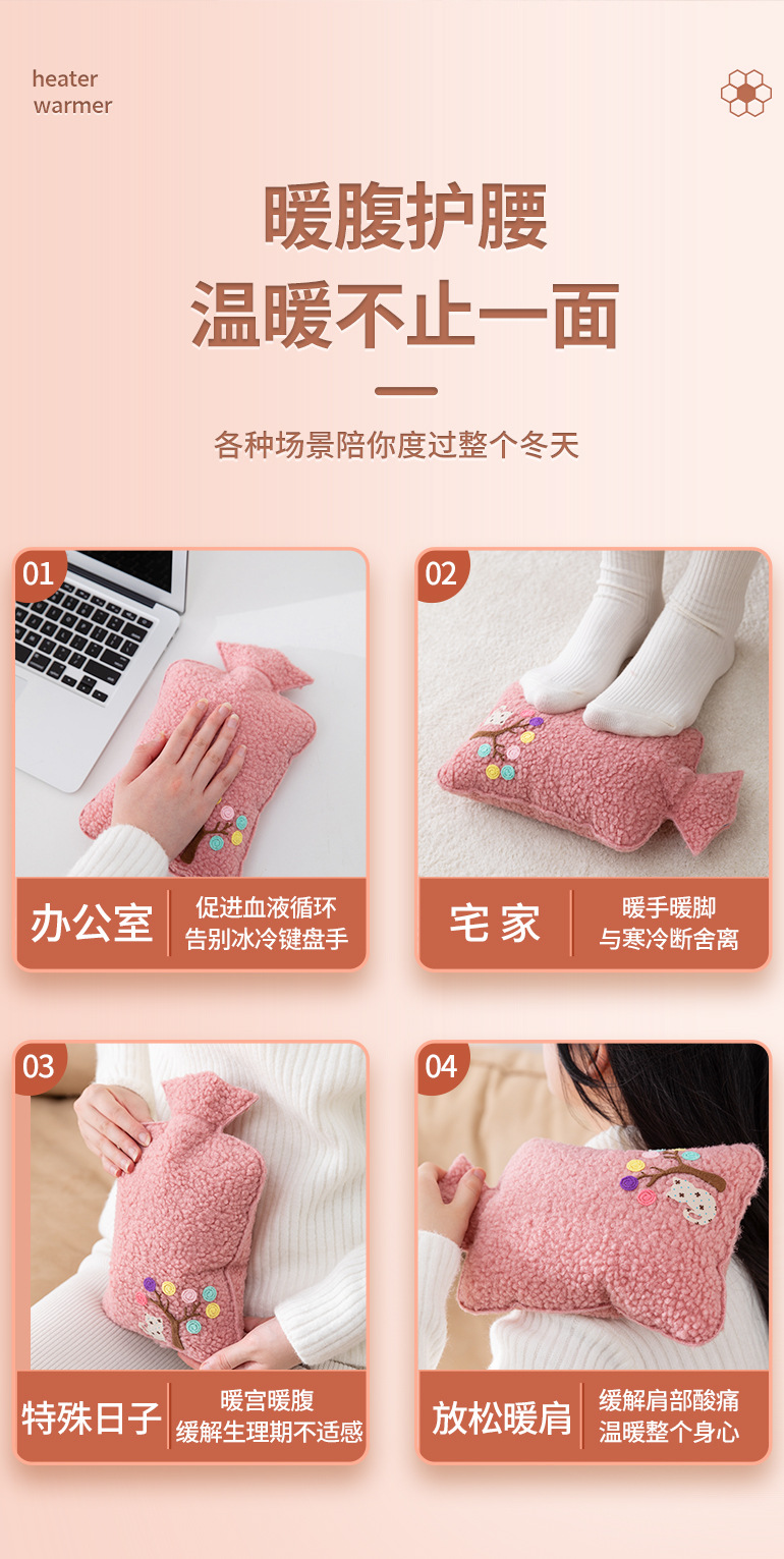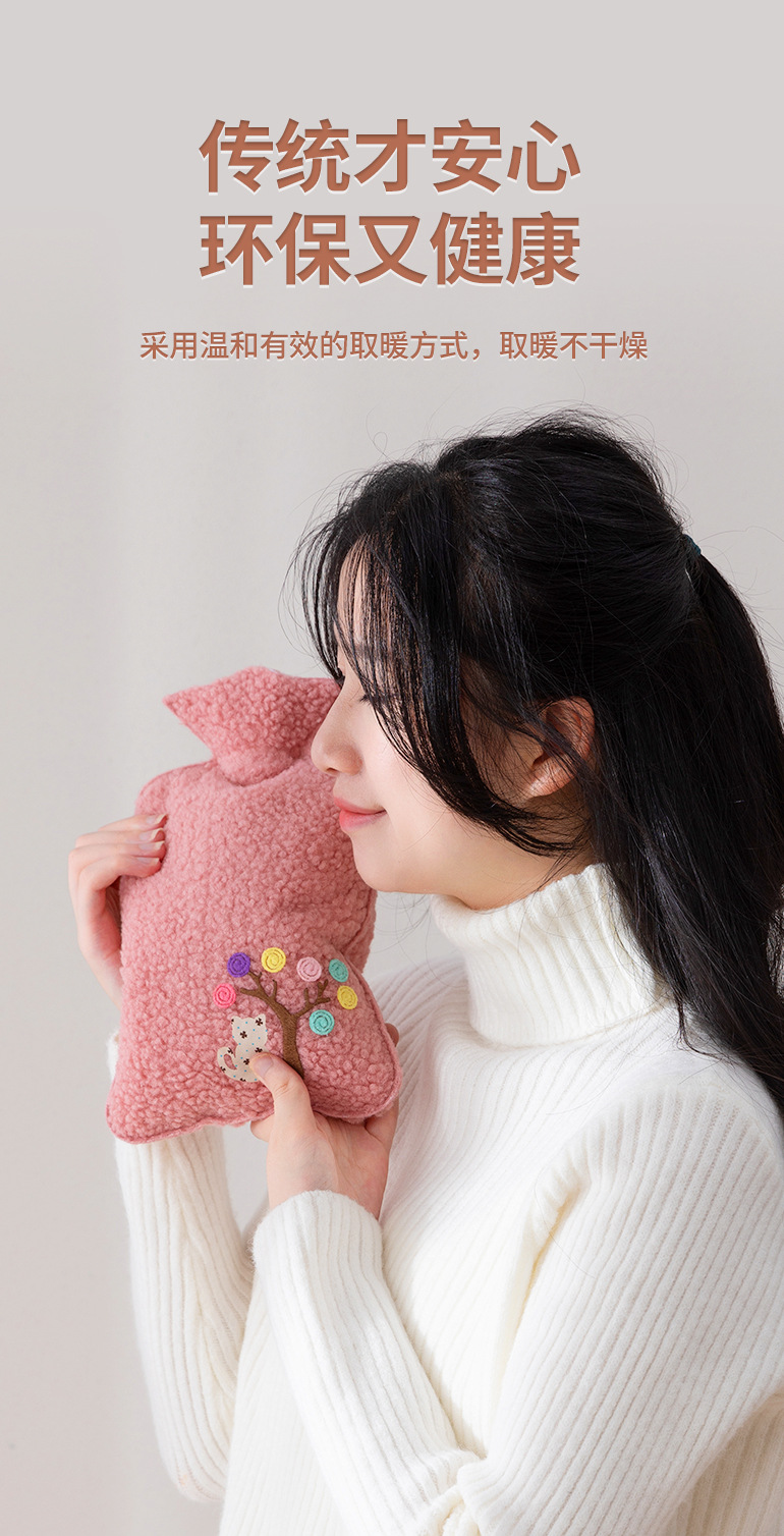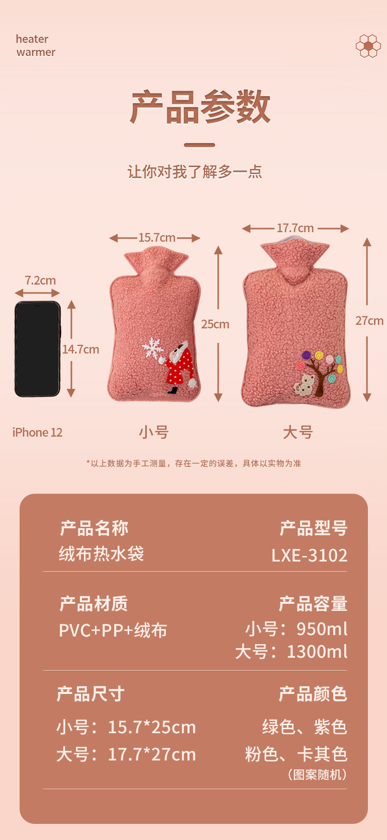 Lexueer tela bolsa de agua caliente de plástico inyección de agua hogar a prueba de explosiones riego calentador de mano tela de felpa bordado bolsa de agua caliente al por mayor