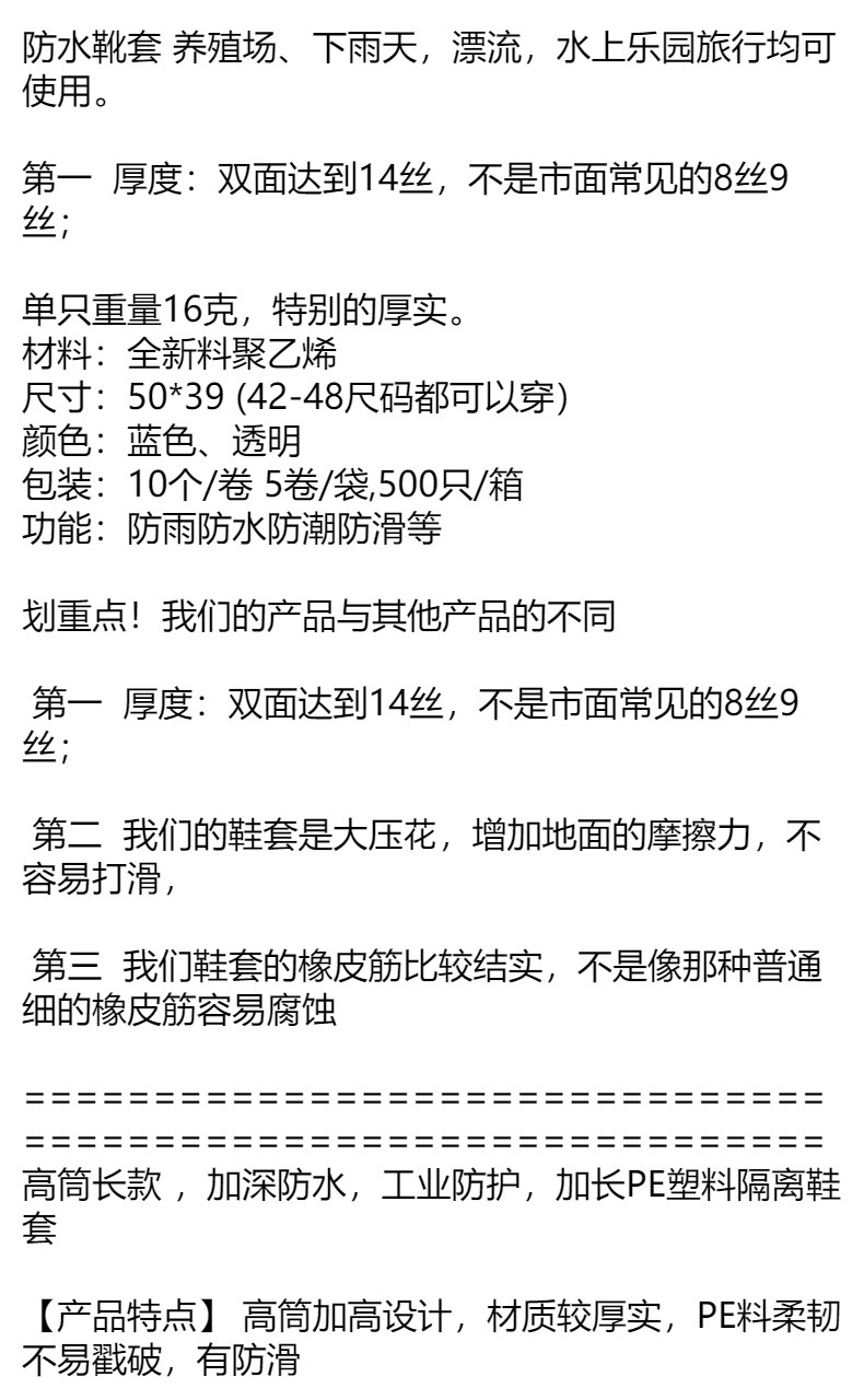 | Colores | Tubo largo azul 14 seda 18g/50*39cm,Tubo largo transparente 14 hilos 18g/50*39cm,Tubo largo azul 16 seda 20g/50*39cm,Tubo largo transparente 16 hilos 20g/50*39cm,Tubo largo transparente 20 hilos 26g/48*41cm,Tubo medio azul 14 seda 12g/30*38cm,Tubo medio transparente 14 filamentos 12g/30*38cm,Tubo alto azul 16g/largo 70 ancho 35cm,Tubo alto transparente 16g/largo 70 ancho 35cm,Tubo alto transparente 18g/largo 70 ancho 39cm,Tubo azul de embalaje independiente 36g/50*39cm(1 paquete doble),Cubierta de zapato transparente para niños 10g/30*28cm,Película transpirable blanco doble nervadura 24g/50*40cm,Cubierta de zapato azul para niños 10g/30*35,Cubierta transparente para niños 10g/30*35 |