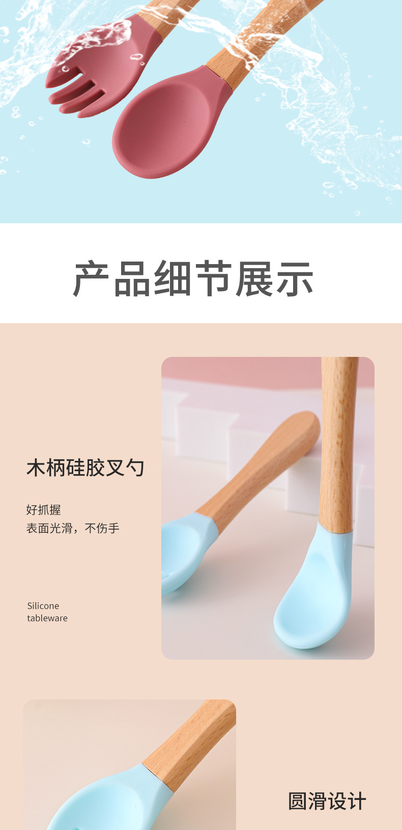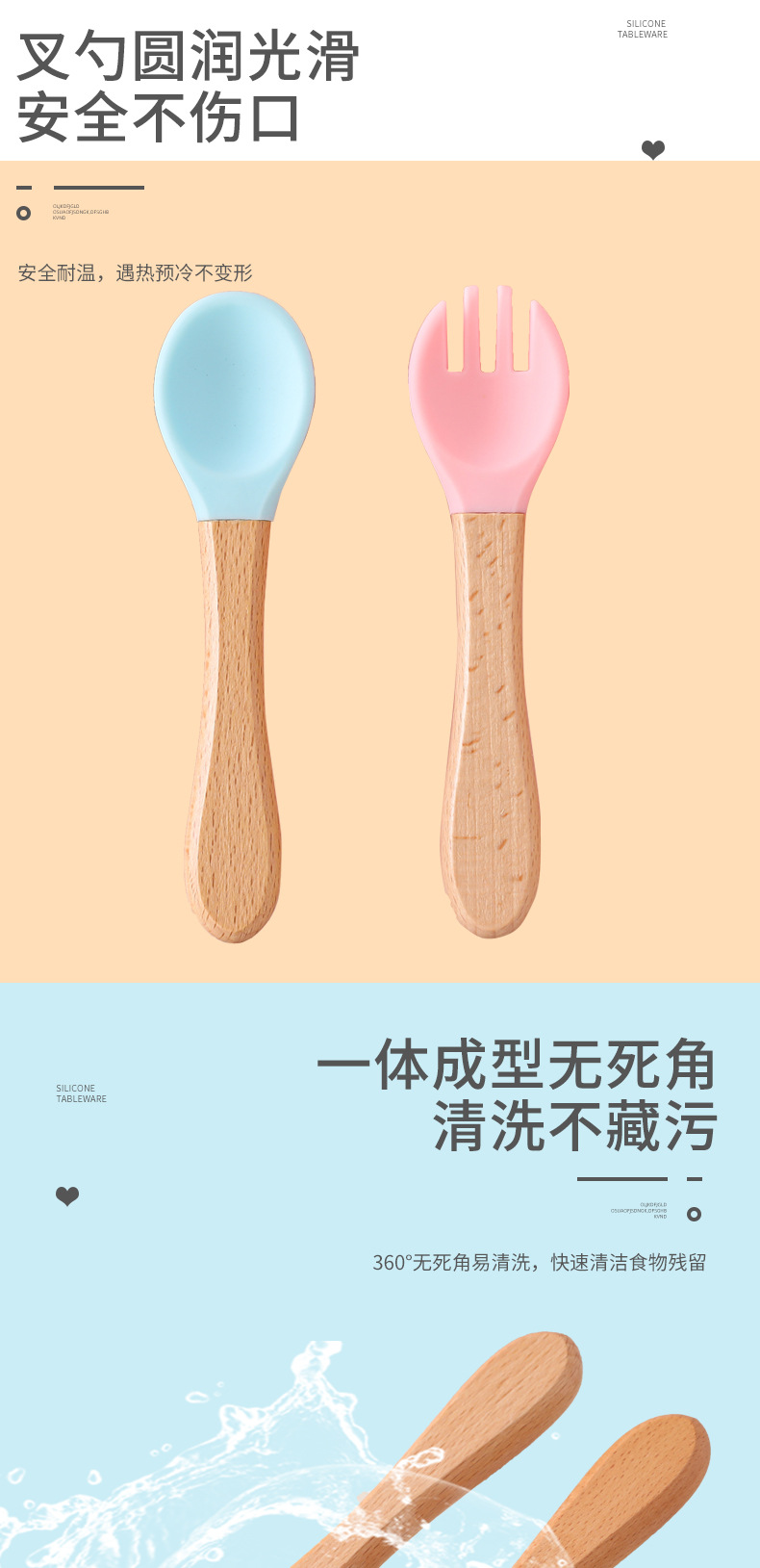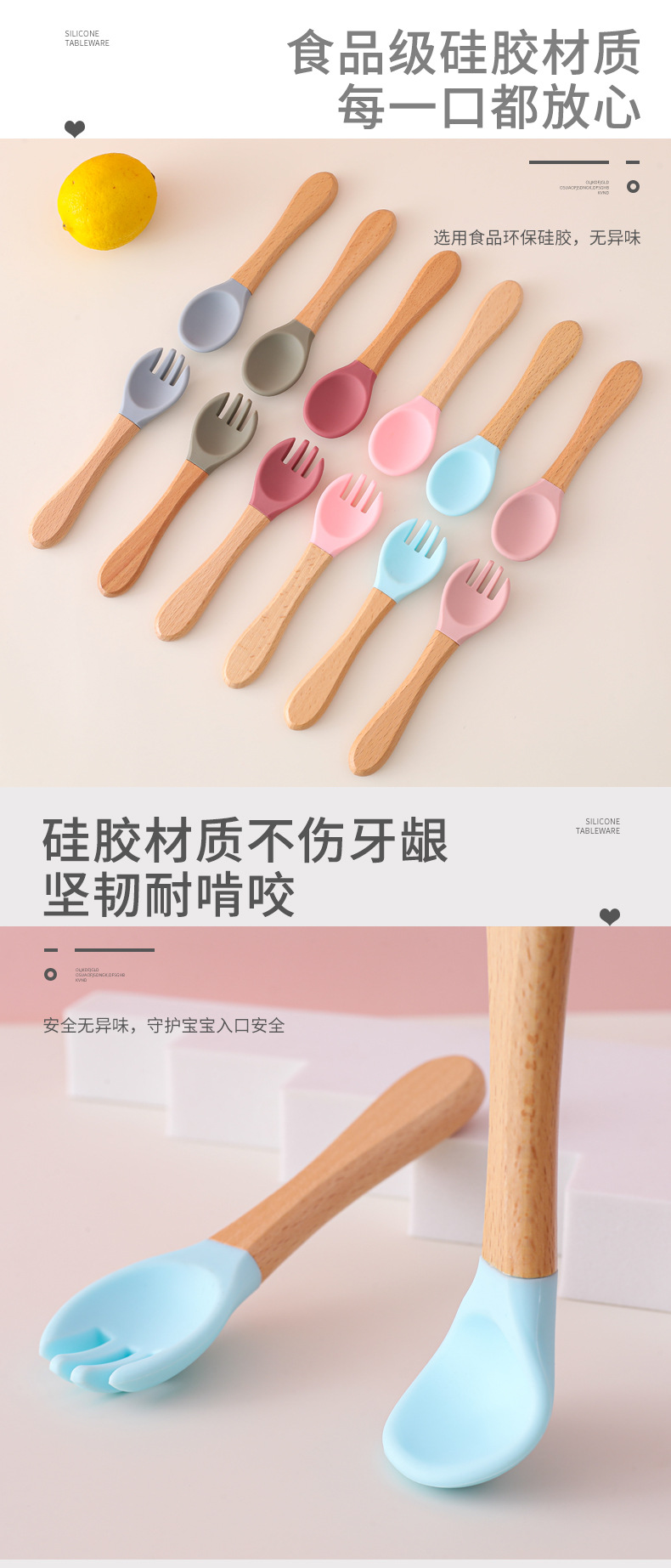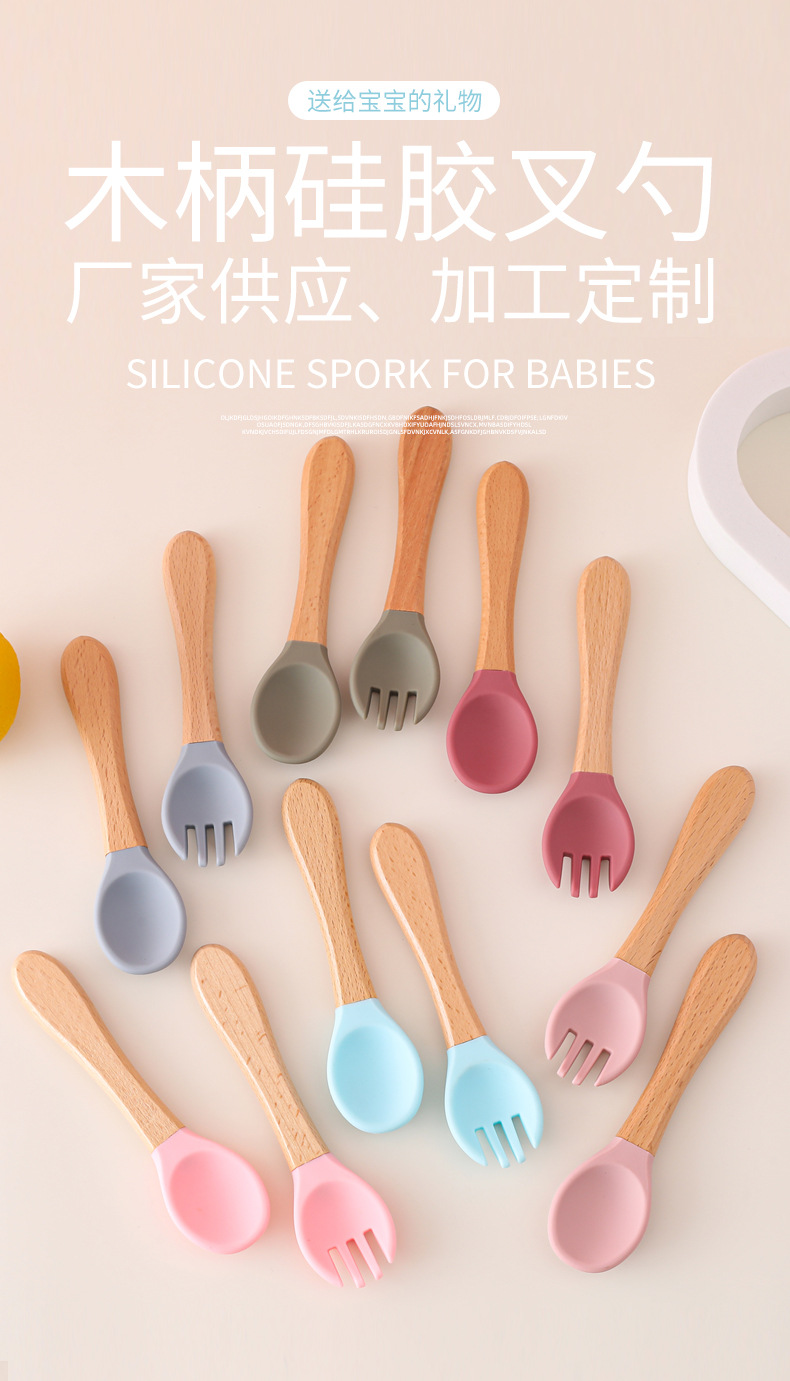 Cuchara de tenedor de silicona con mango de madera para bebés, suplemento alimenticio para el hogar, juego de tenedor y cuchara de silicona con mango de madera, cuchara de alimentación para niños resistente a caídas