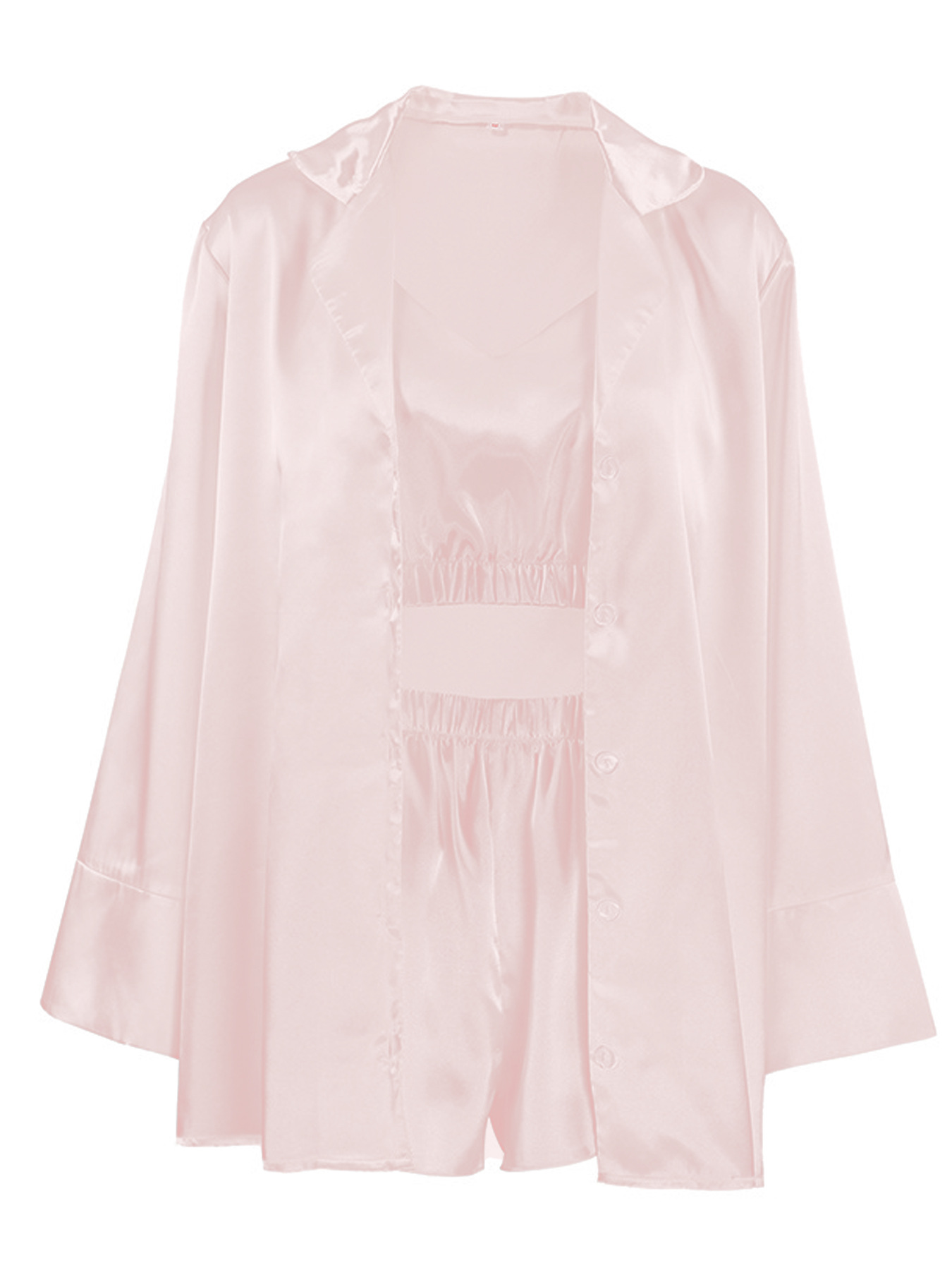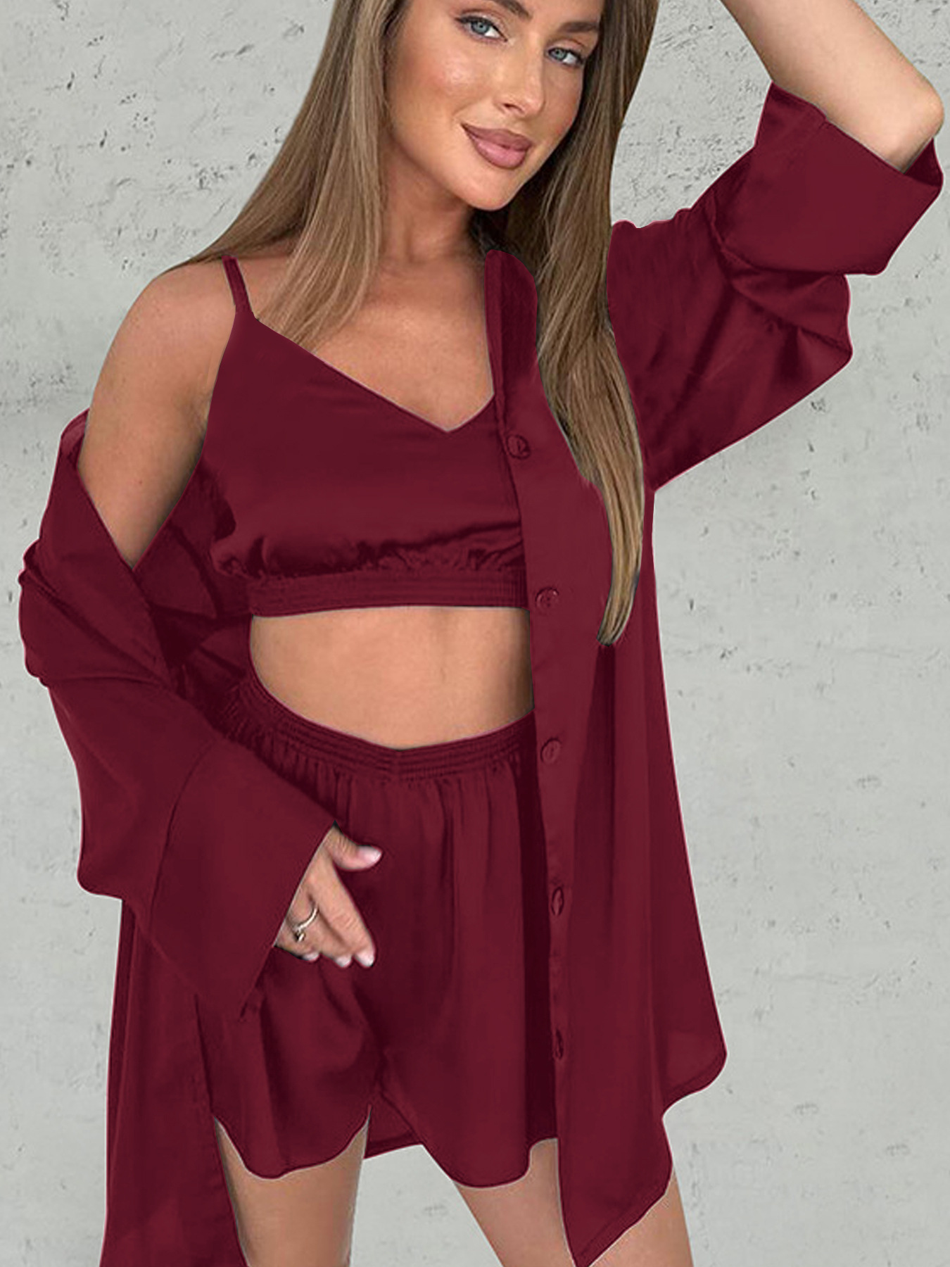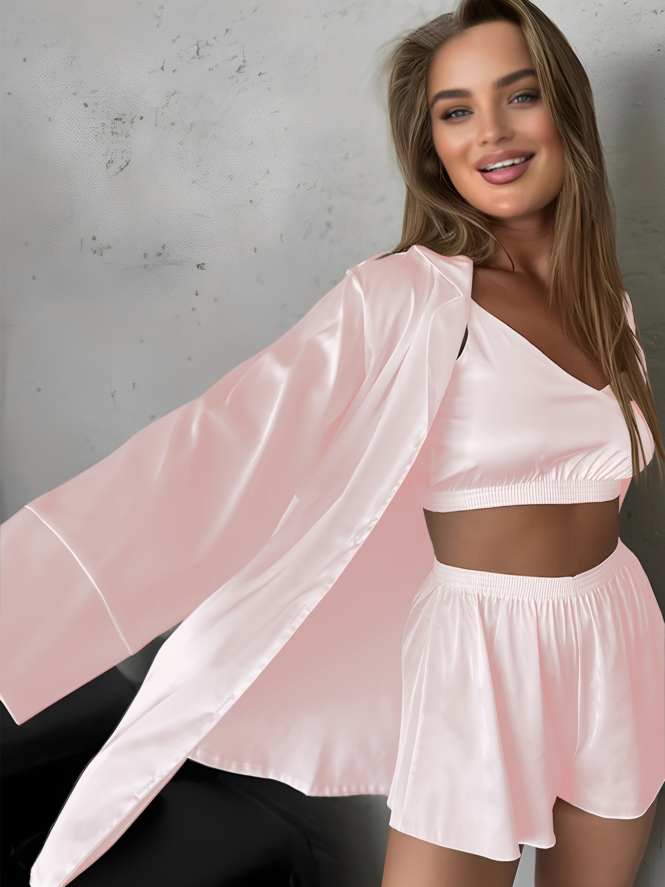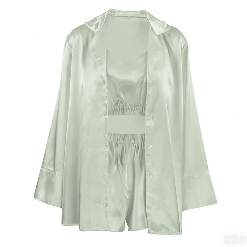 Nuevo estilo transfronterizo europeo y americano sexy top tirantes pantalones cortos de tres piezas textura de seda albornoz de manga larga ropa de hogar al por mayor