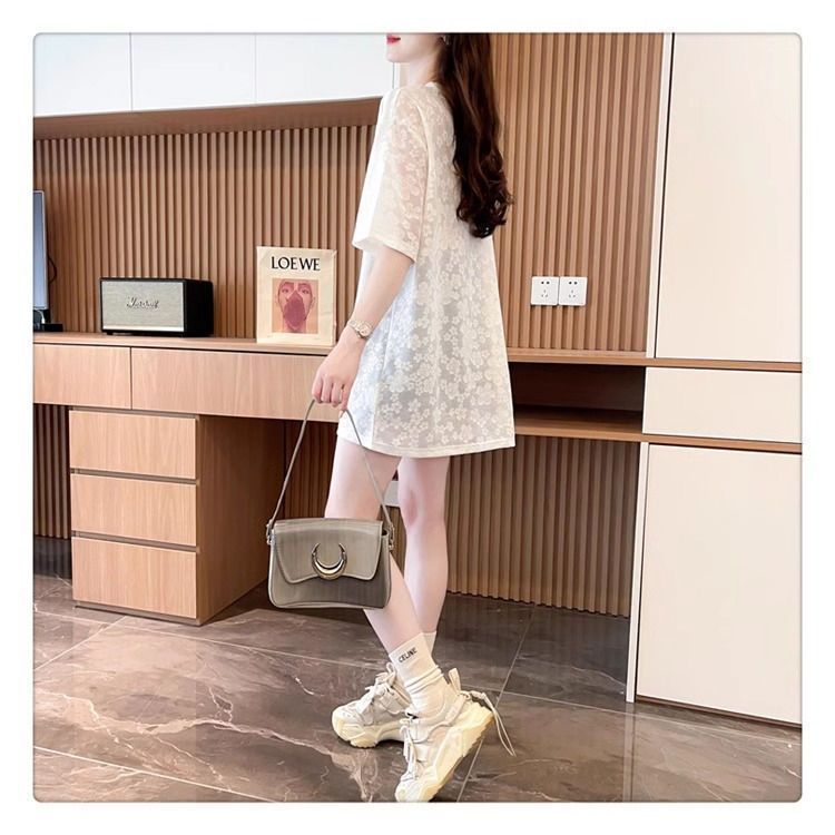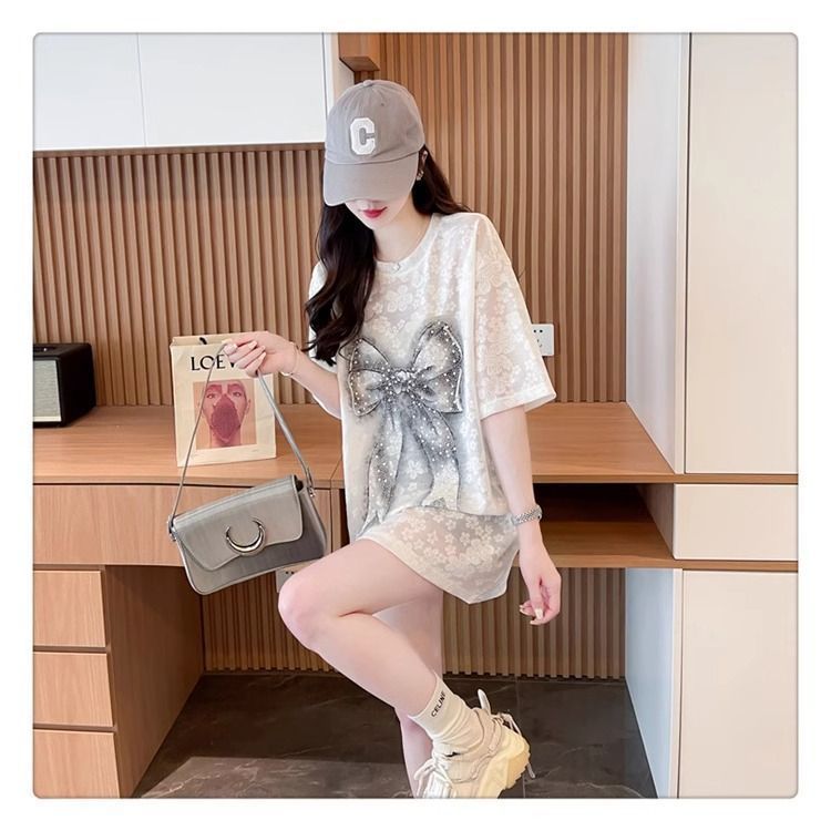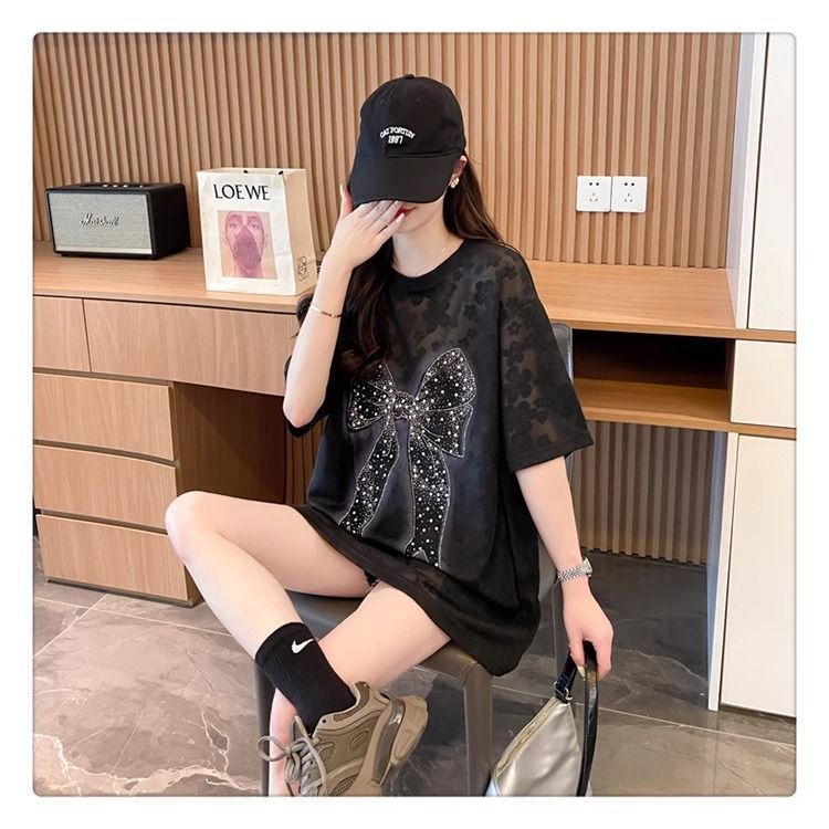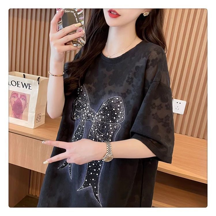 2-300 kg extra grande encaje de diamantes calientes lazo brillante camiseta de manga corta mujer verano de longitud media estilo occidental