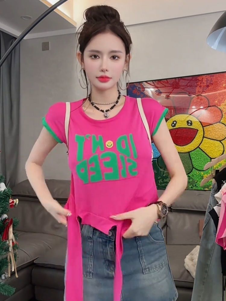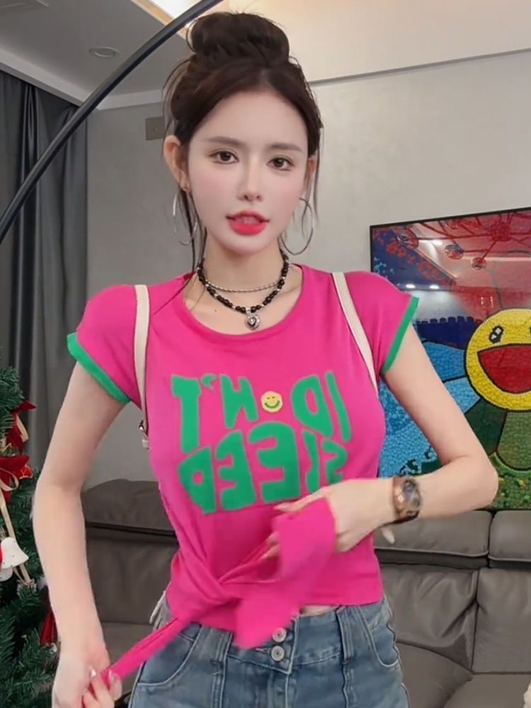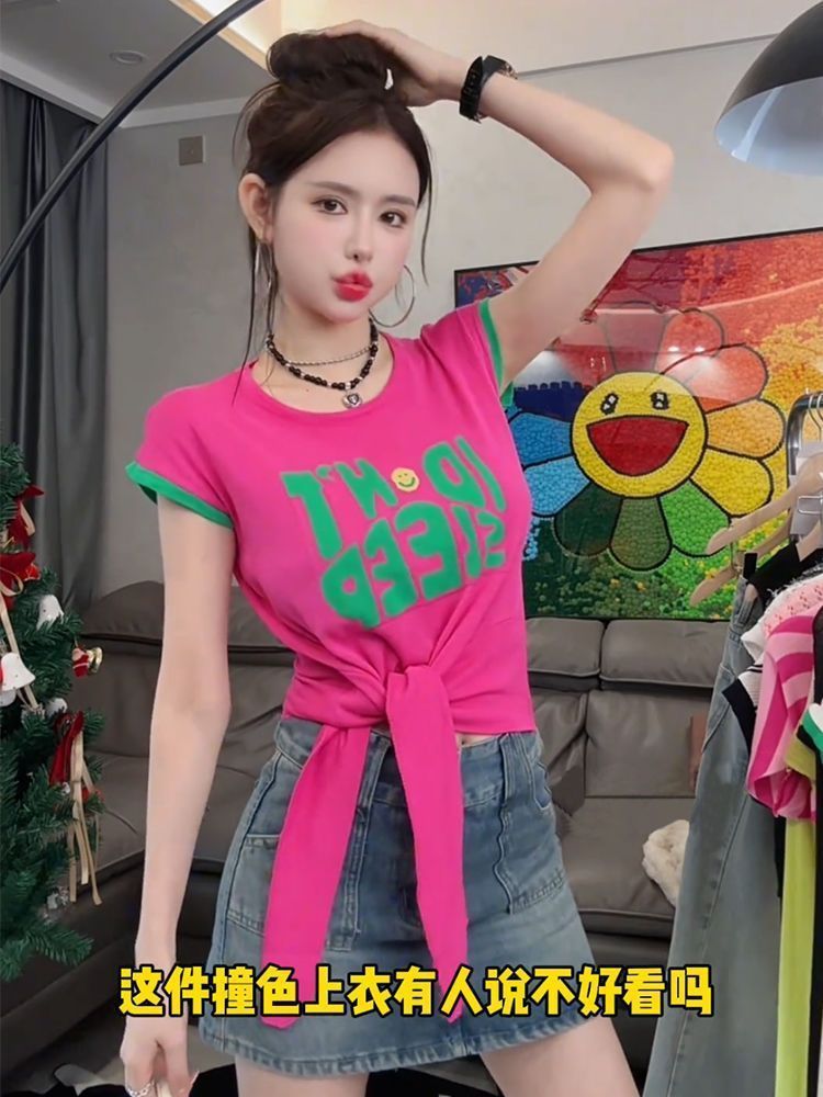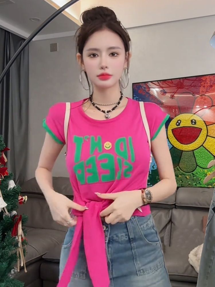 2024 verano cuello redondo color contraste dobladillo anudado camiseta de manga corta mujer nuevo estilo suelto y delgado moda talla grande top mujer