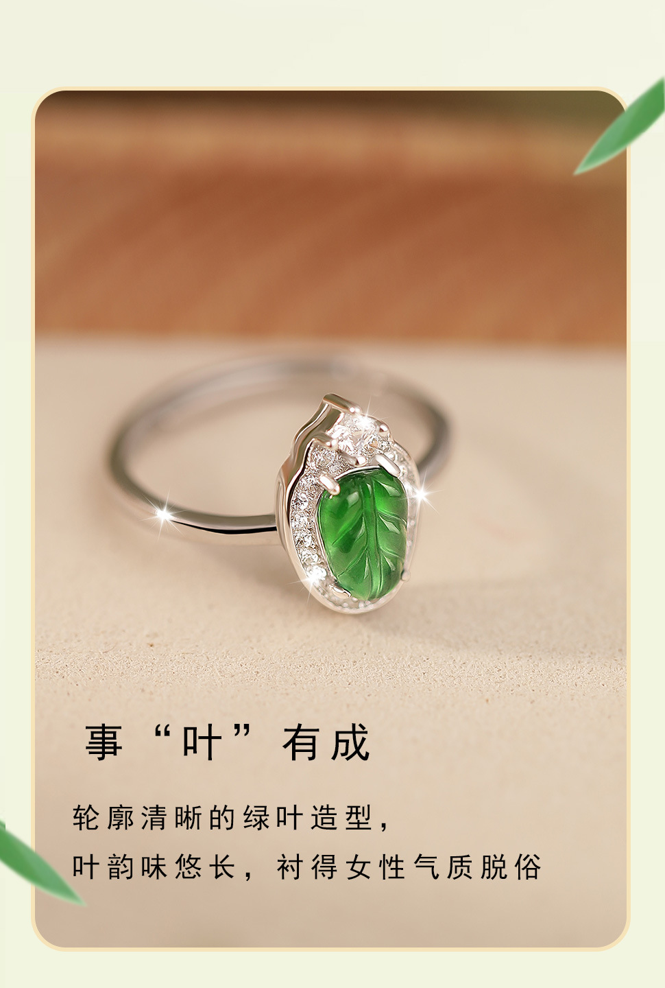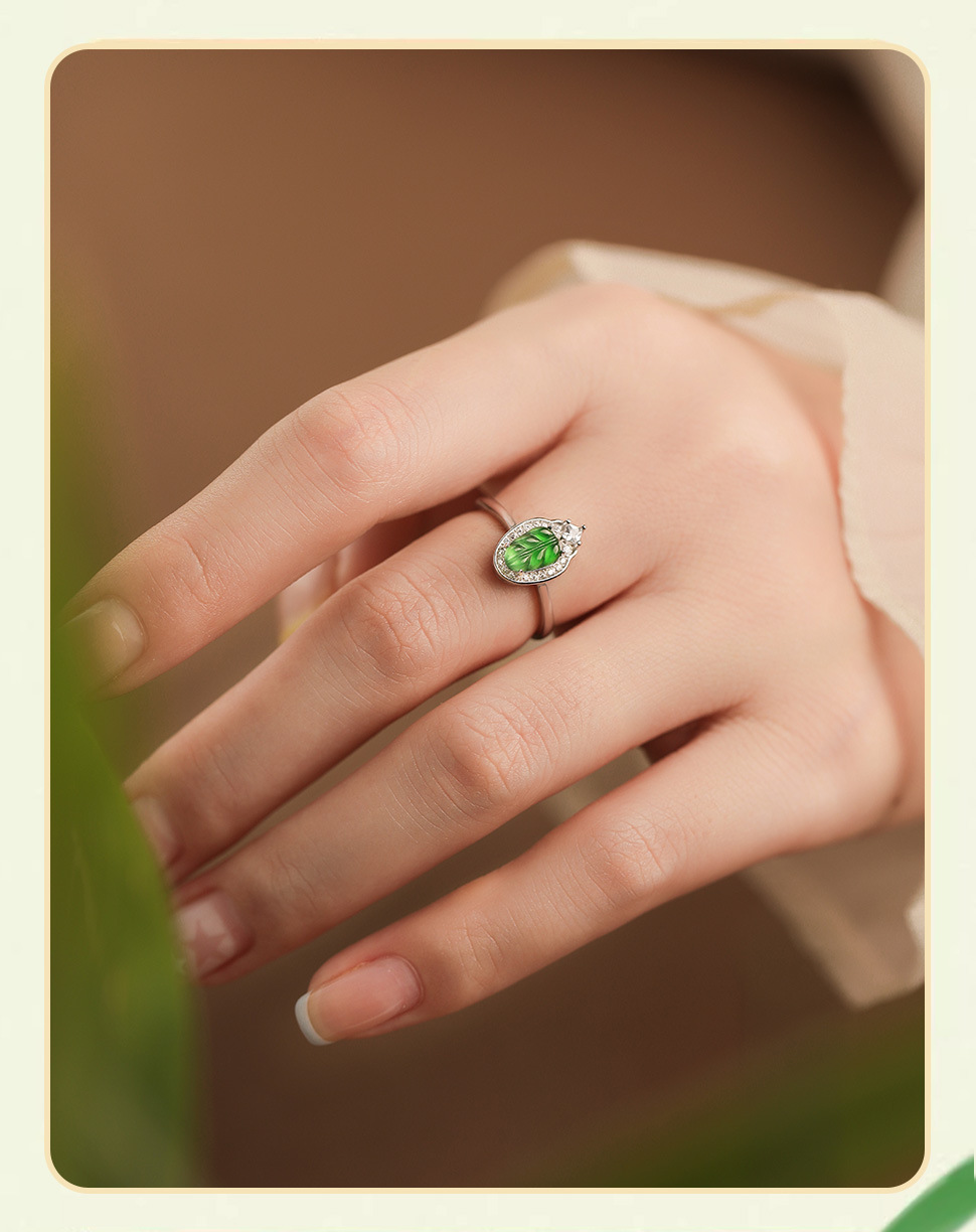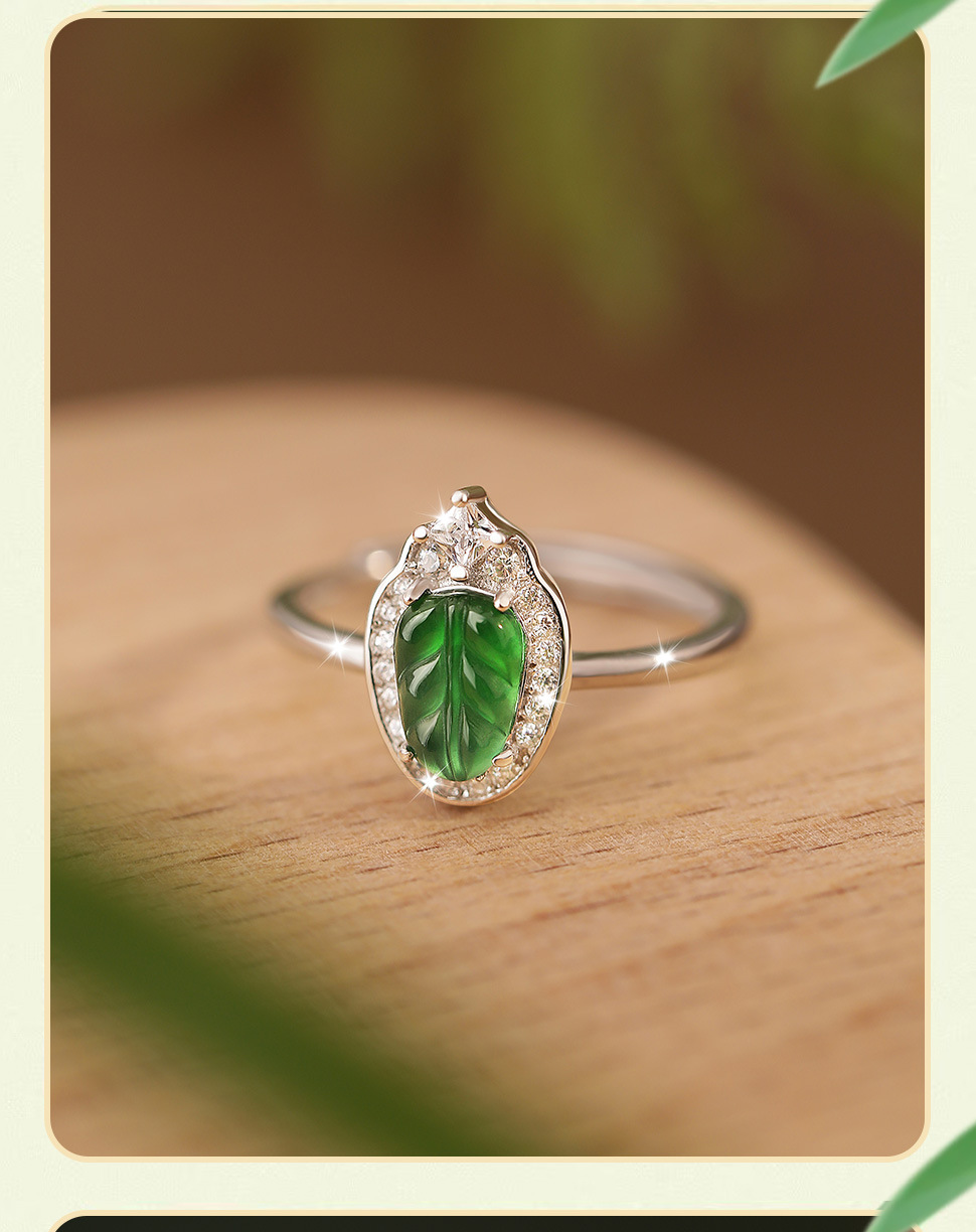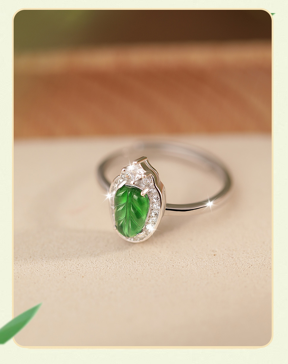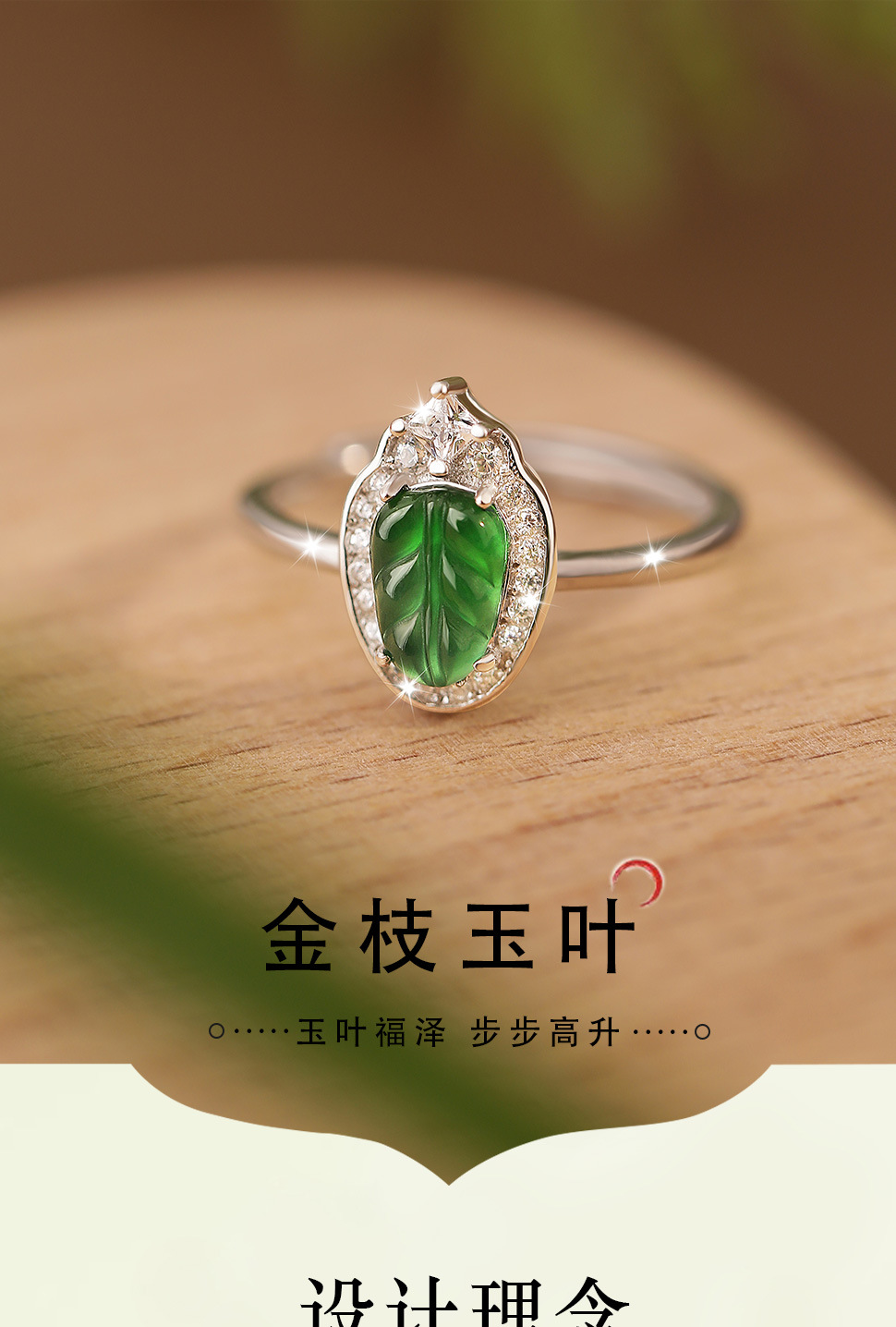 Material peligroso natural, rama de oro de jade, hoja de jade, anillo de plata esterlina s925, sentido de diseño de nicho femenino, apertura exquisita ajustable