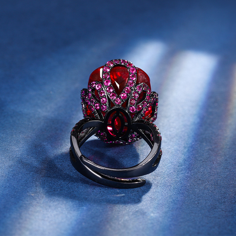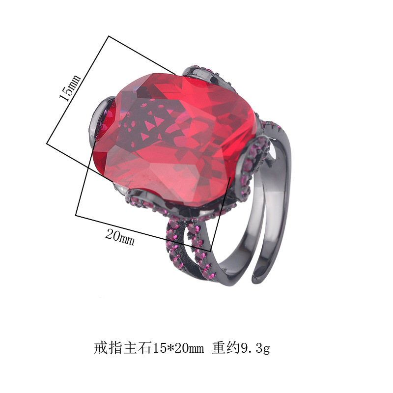 2024 Nueva joyería Zhuang Shengsheng, fondo de cobre, simulación chapada en oro, corindón, grasa rectangular, lujo ligero, oro negro, dedo femenino 15*20