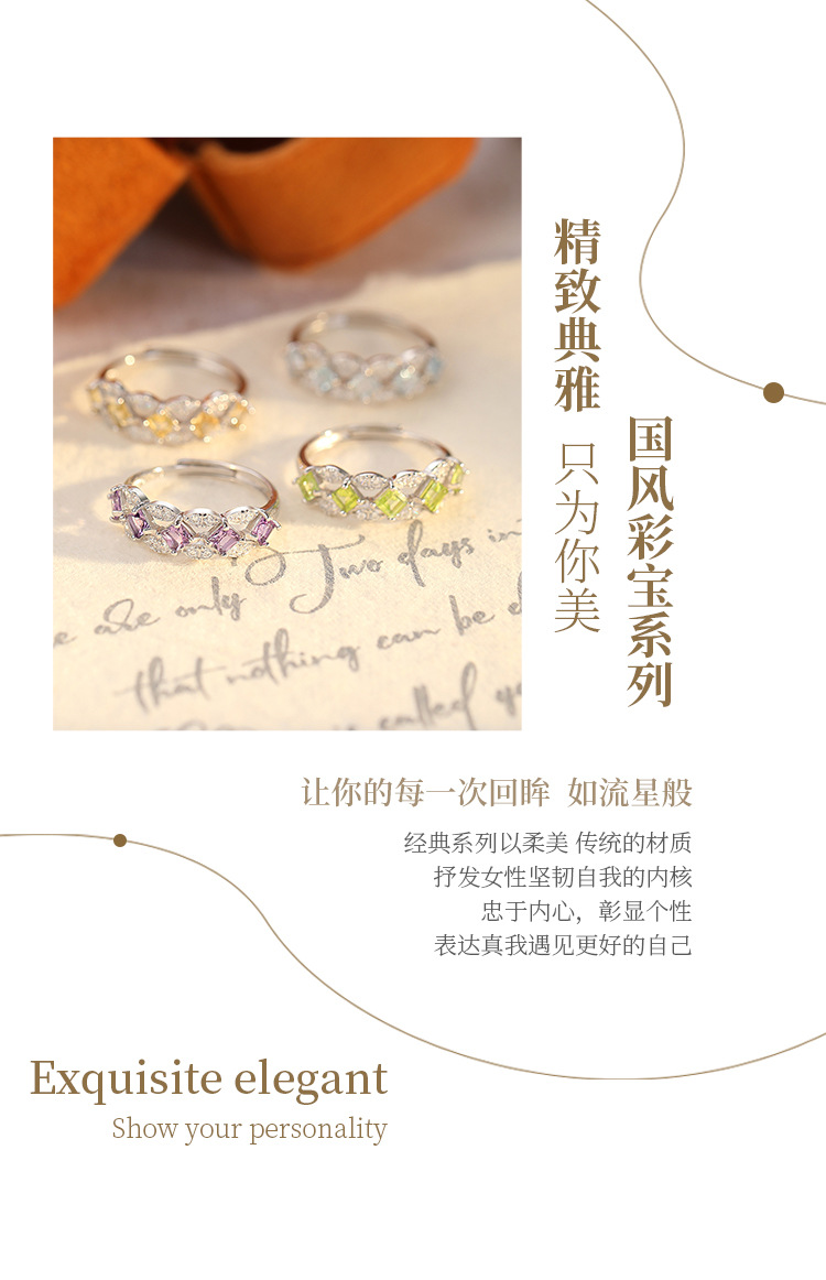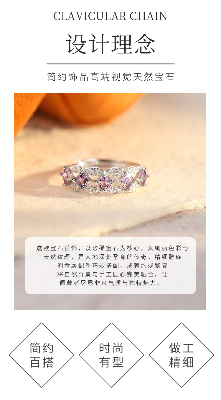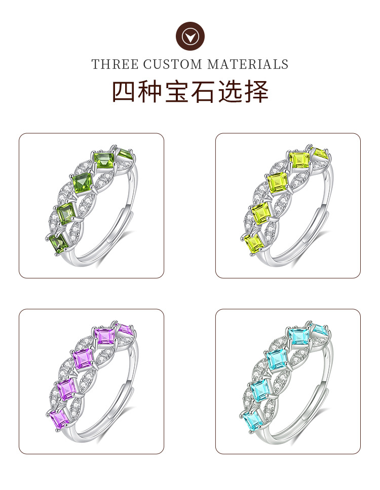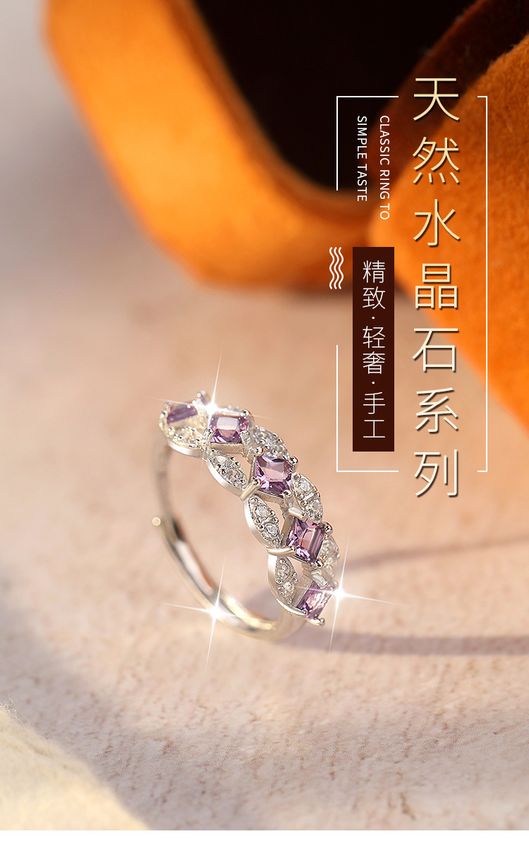 Anillo de fila de piedra de cristal natural de lujo ligero s925 anillo de plata de ley ajustable sin decoloración venta caliente transfronteriza accesorios de alta gama mujeres