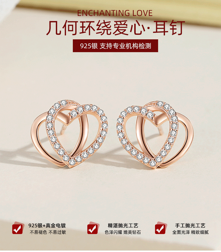 Pendientes de plata 925 pendientes de doble circón en forma de corazón para las mujeres Luz de lujo estilo nicho ins corazón a corazón imprimir joyería de alta calidad para las mujeres