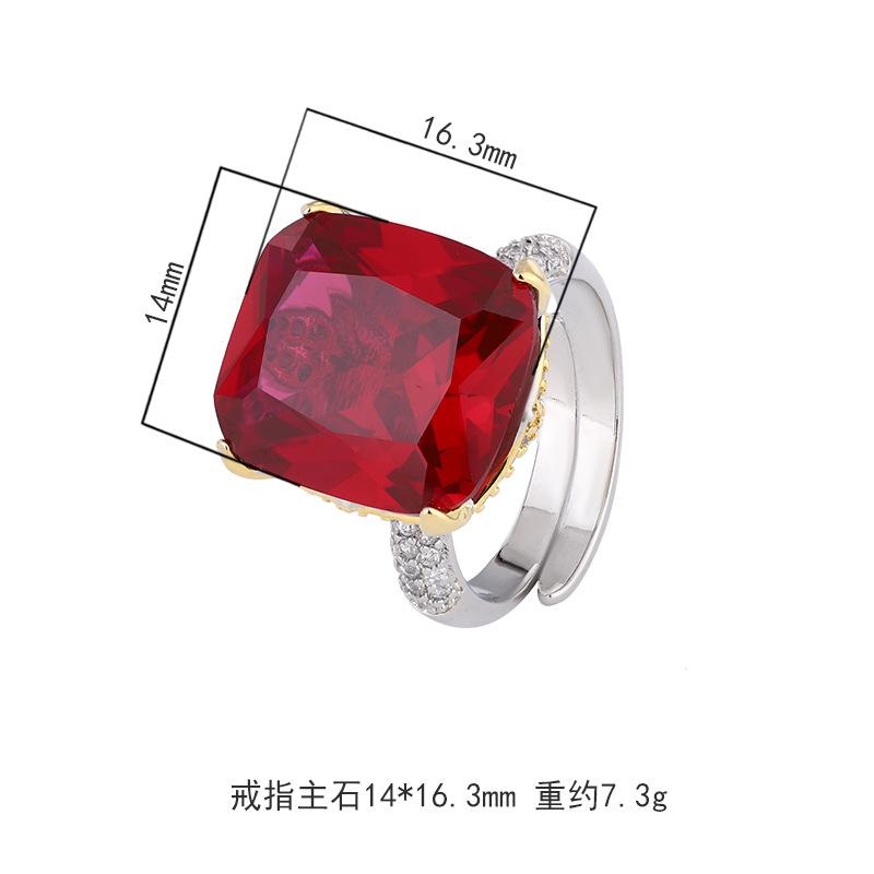 2024 Zhuang Shengsheng Joyas Fondo de cobre chapado en oro Moda europea y americana Simulación Corindón Fat Fang Ring Mujer 14*16