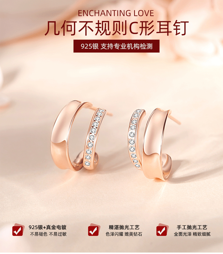 S925 plata geométrica irregular Stud pendientes mujer letra C circón pendientes moda alto sentido inglés joyería al por mayor