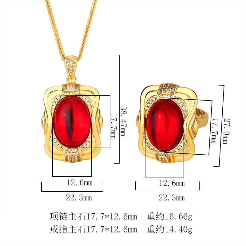 | Colores | Colgante de corindón rojo dorado con cadena,Anillo de corindón rojo dorado,Colgante de calcedonia verde dorado con cadena,Anillo de calcedonia verde dorado |