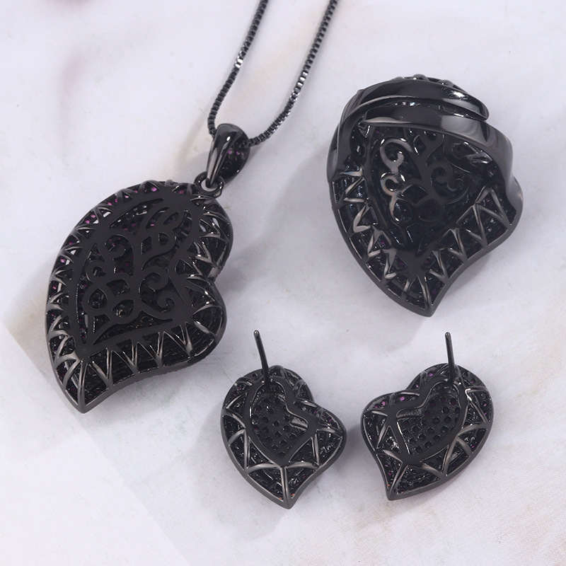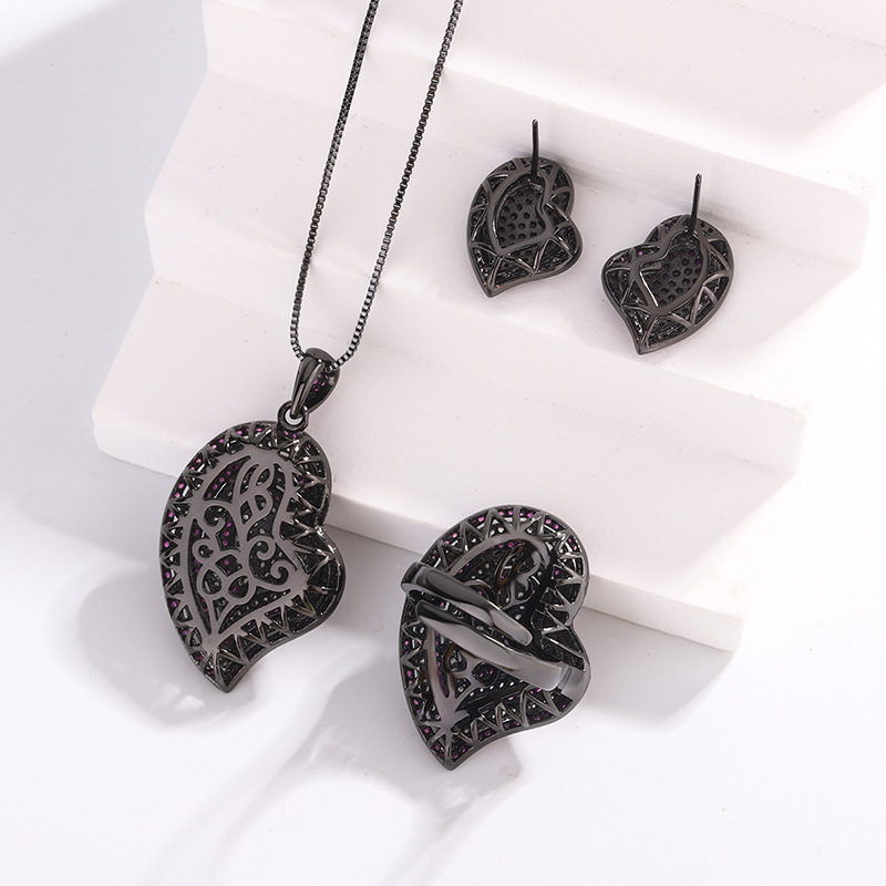 2024 nueva joyería Zhuang Shengsheng fondo de cobre chapado en oro simulación corindón rojo en forma de corazón diamante completo traje de oro negro mujer