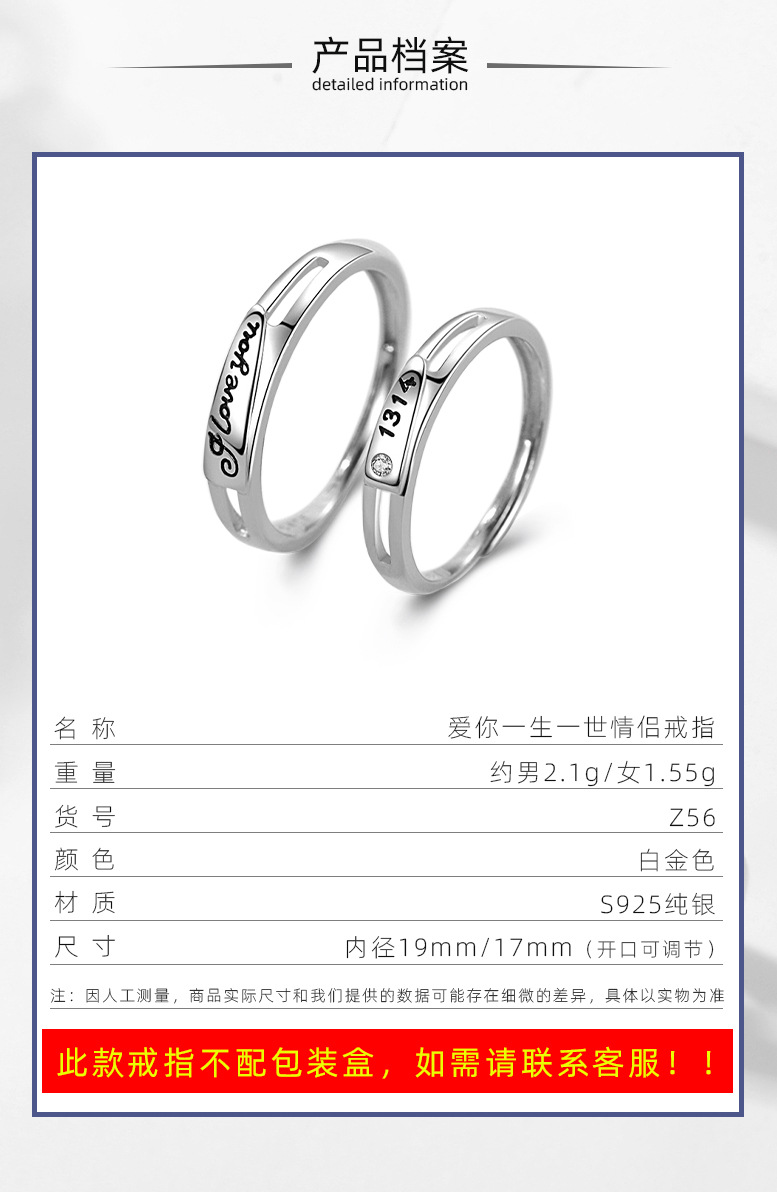 Plata esterlina s925 nuevo amor 1314 pareja anillo Inglés Simple boca abierta anillo moda anillo de San Valentín