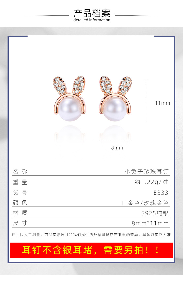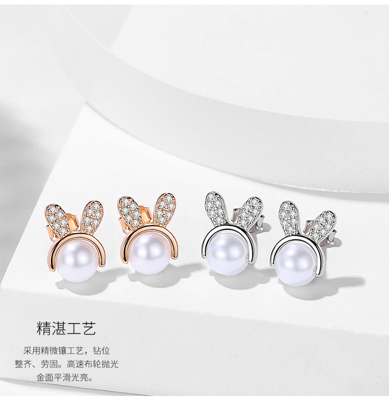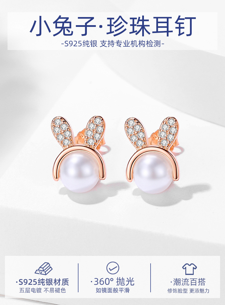 Lindo conejito diamante-incrustado pequeño S925 pendientes de plata elegante cuentas de plástico dulce pendientes de todo partido para las mujeres