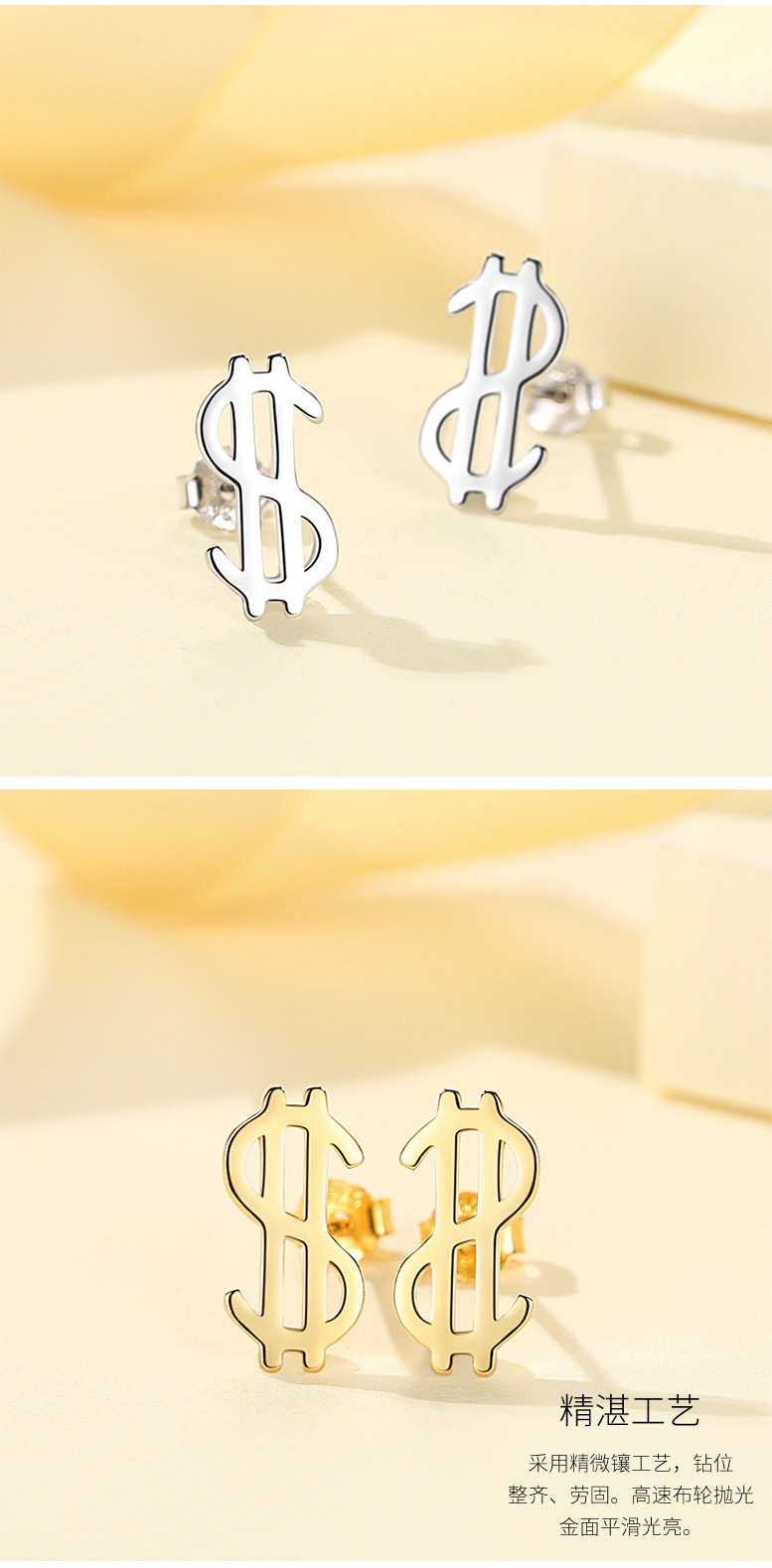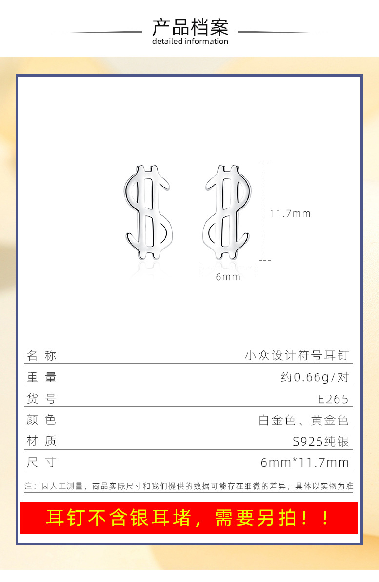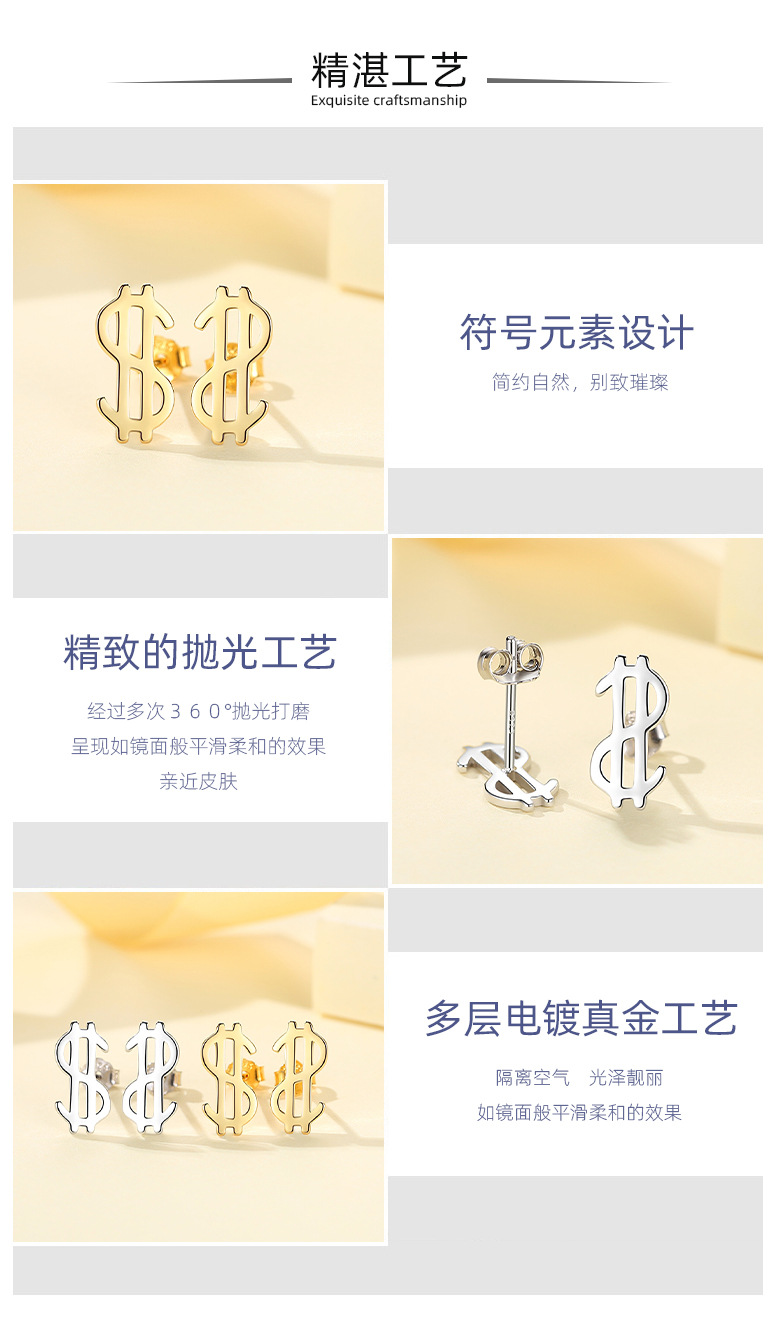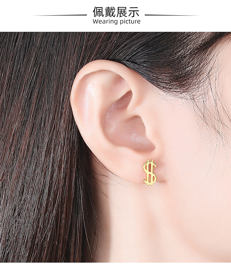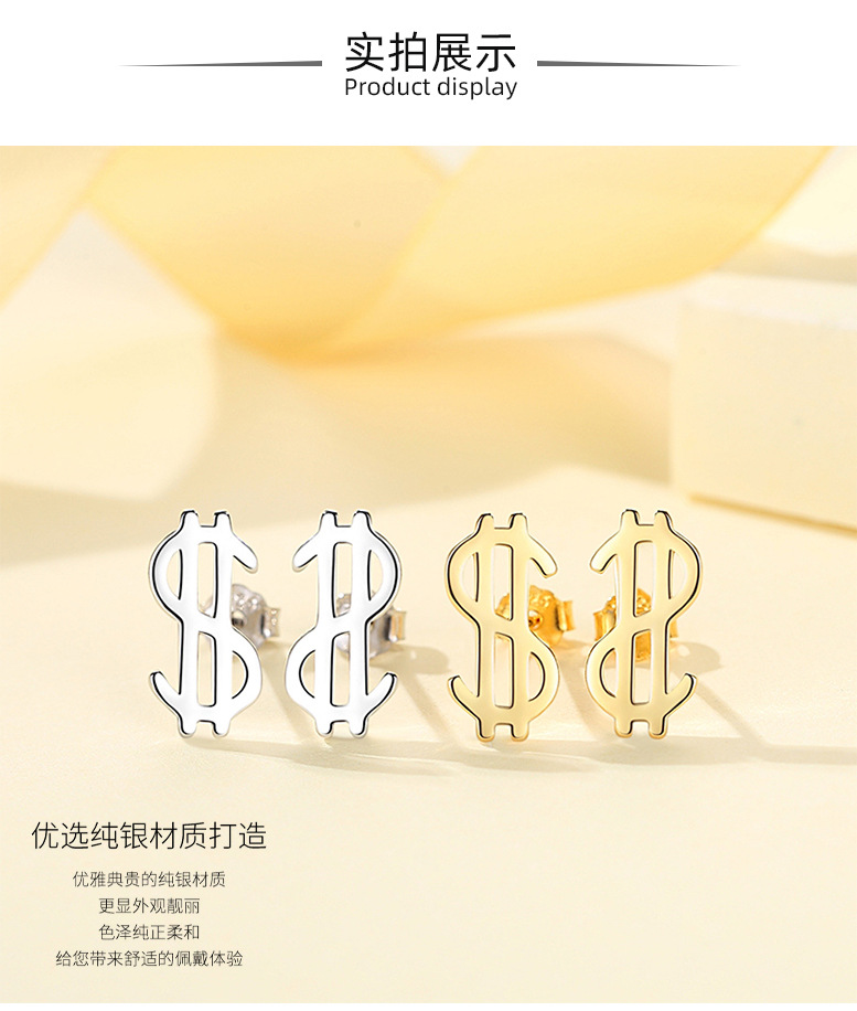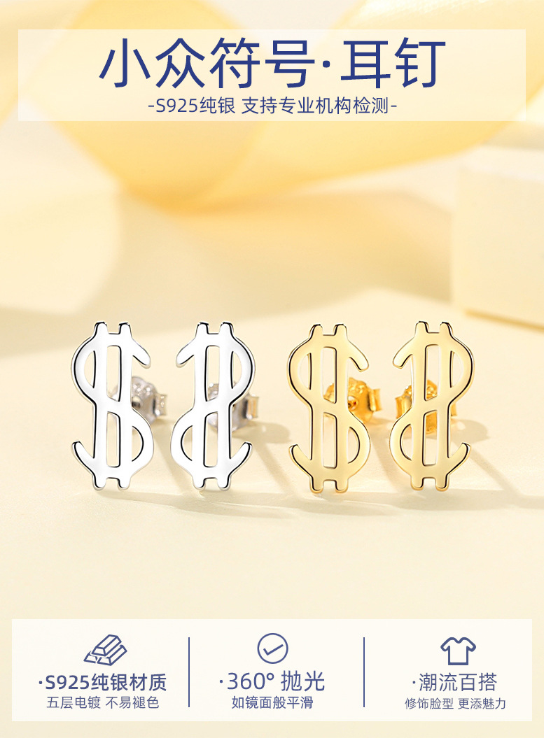 Plata esterlina s925 moneda símbolo Stud pendientes nicho diseño plata esterlina Stud pendientes nuevo personalizado Stud pendientes dormir-libre recogida
