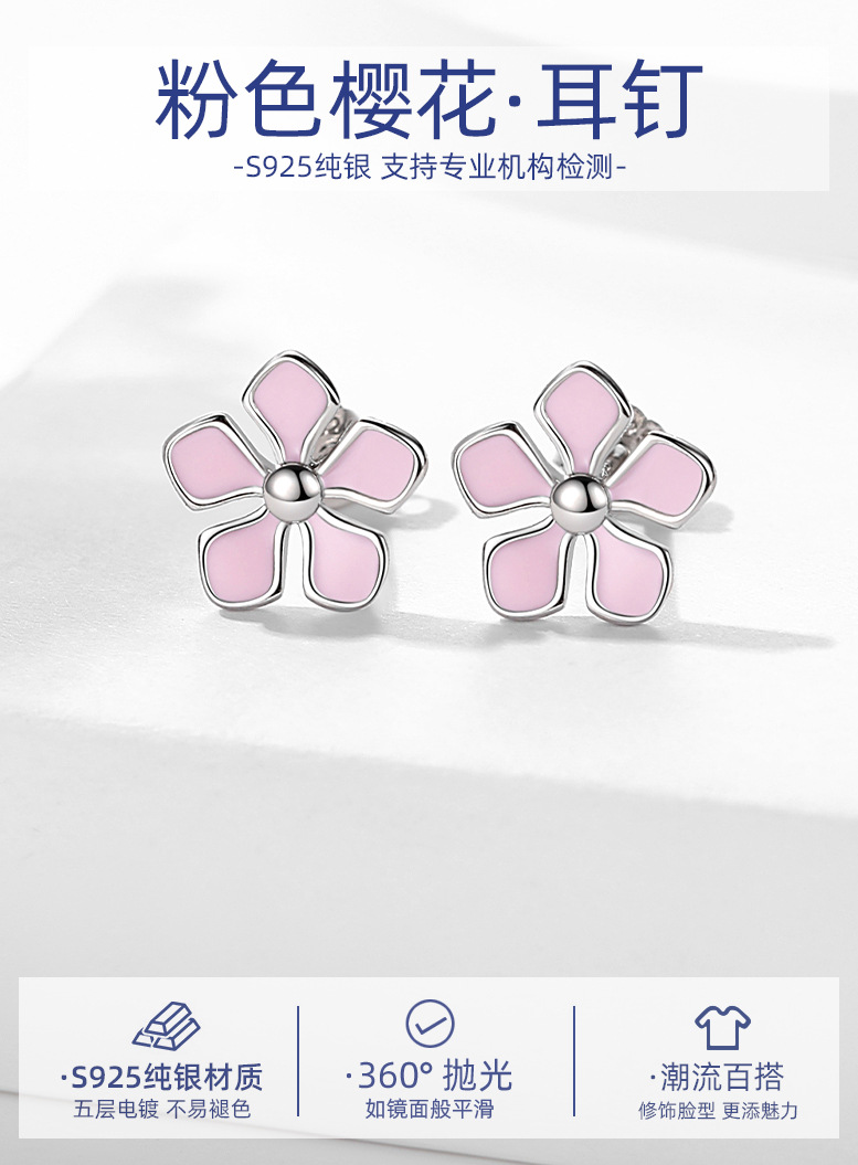 S925 plata esterlina Rosa flor de cerezo Stud pendientes de las mujeres de moda estilo japonés y coreano Mori dulce flor de cinco pétalos pendientes al por mayor