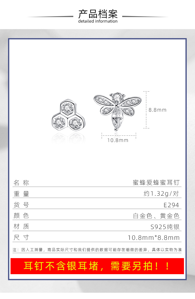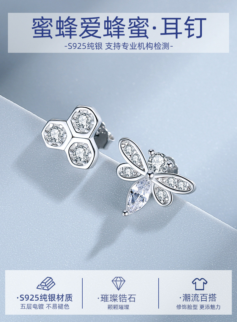 Pendientes de plata esterlina creativa abeja amor miel pendientes de plata aguja niñas asimétrica pendientes 925 al por mayor lindo ins