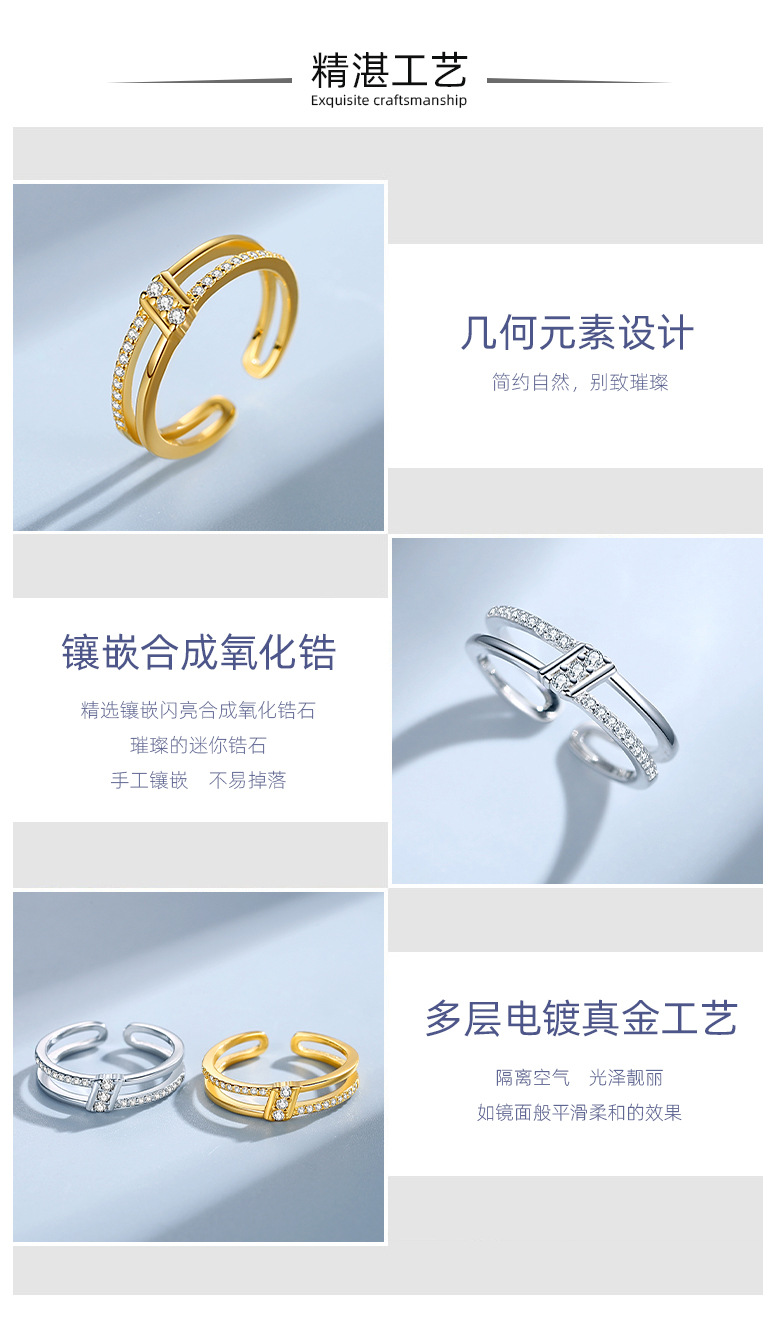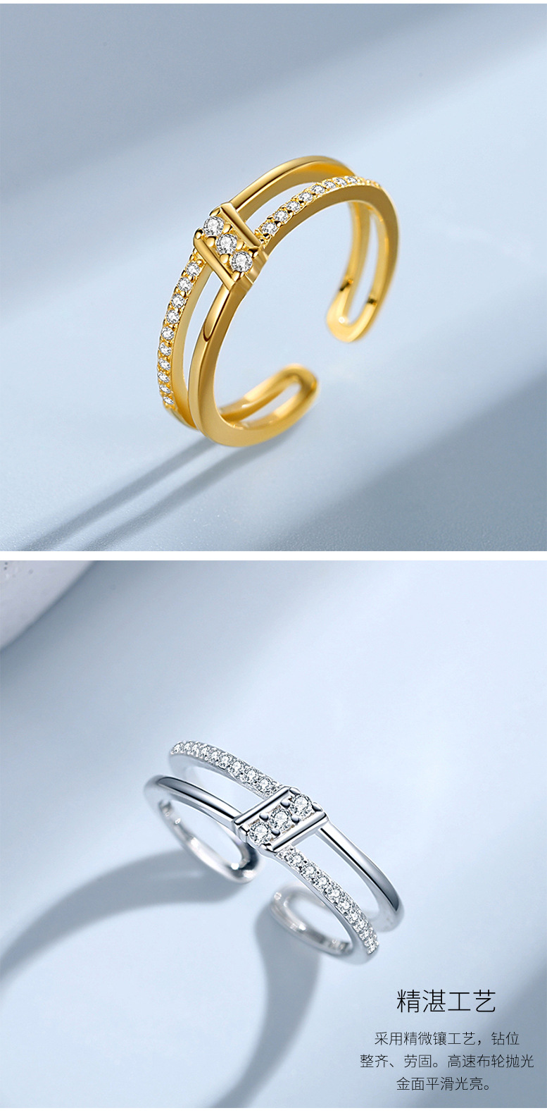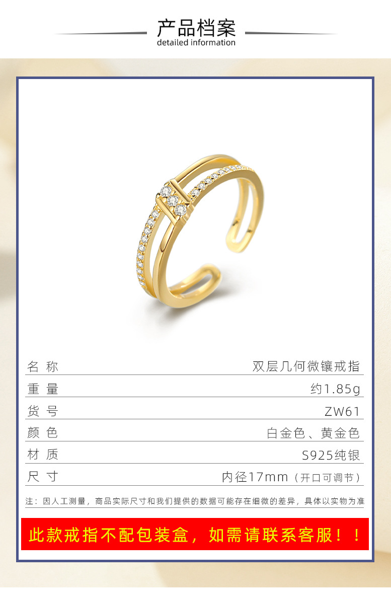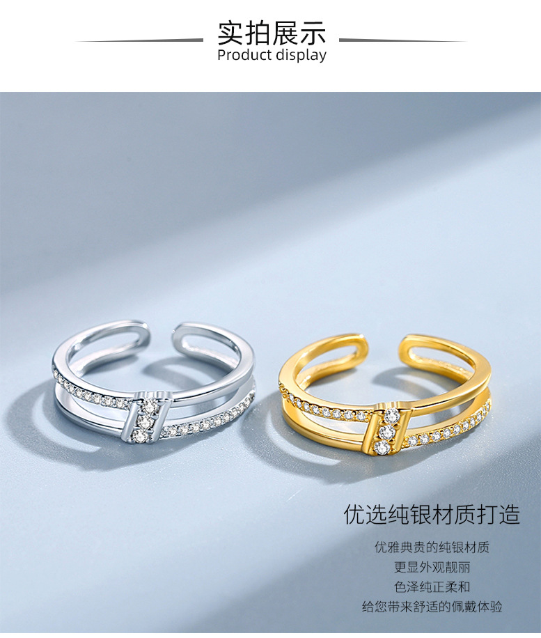 Anillo de mujer geométrica de doble capa de plata esterlina S925 estilo japonés y coreano estilo creativo Luz de lujo estilo diamante-incrustado anillo de dedo índice apertura ajustable