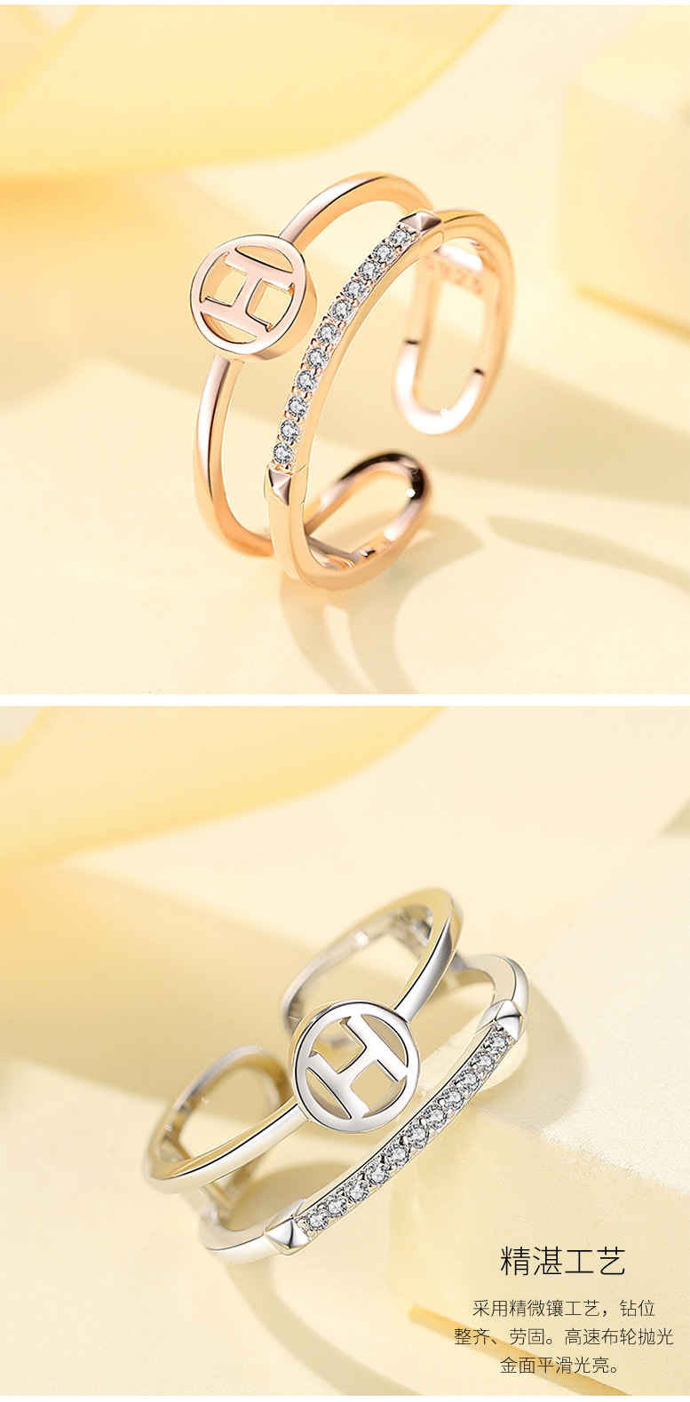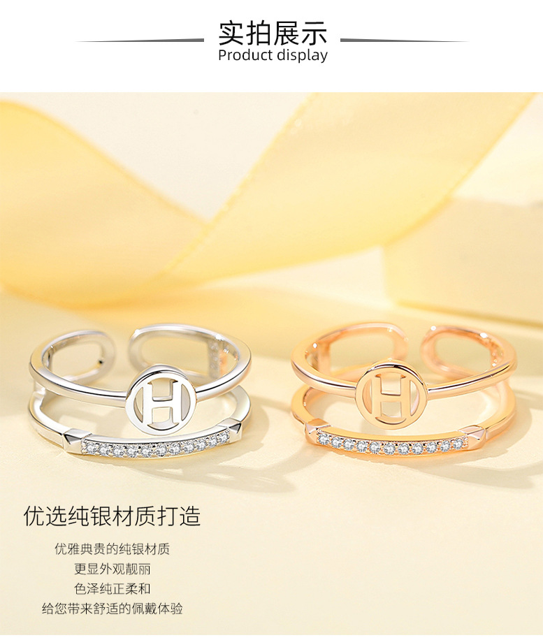 S925 plata esterlina anillo de doble capa hembra japonés y coreano letra H celebridad de Internet diamante incrustado anillo índice abierto anillo de cola de viento frío regalo