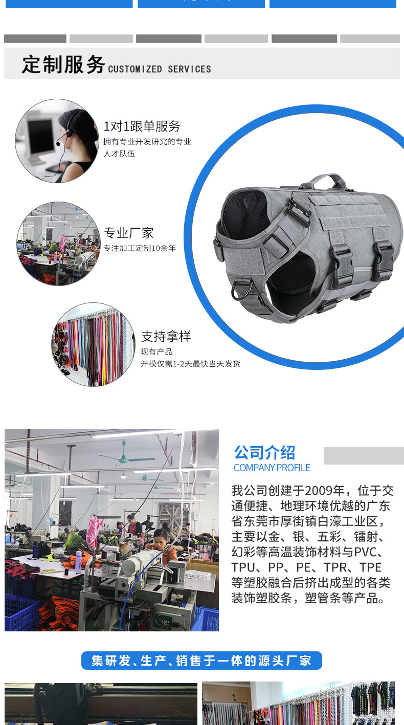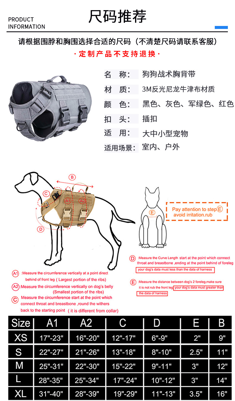| Color | Negro,Verde del Ejército (perros medianos y grandes),Rojo (perros medianos y grandes),Gris (perros medianos y grandes),Cuerda de la tracción (cuatro colores opcionales) |