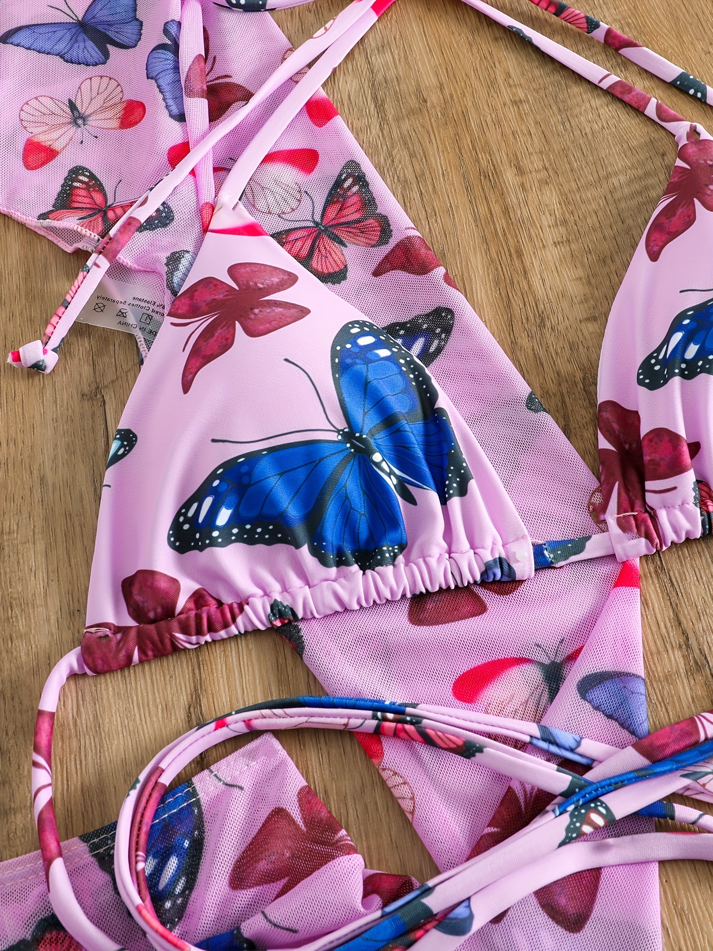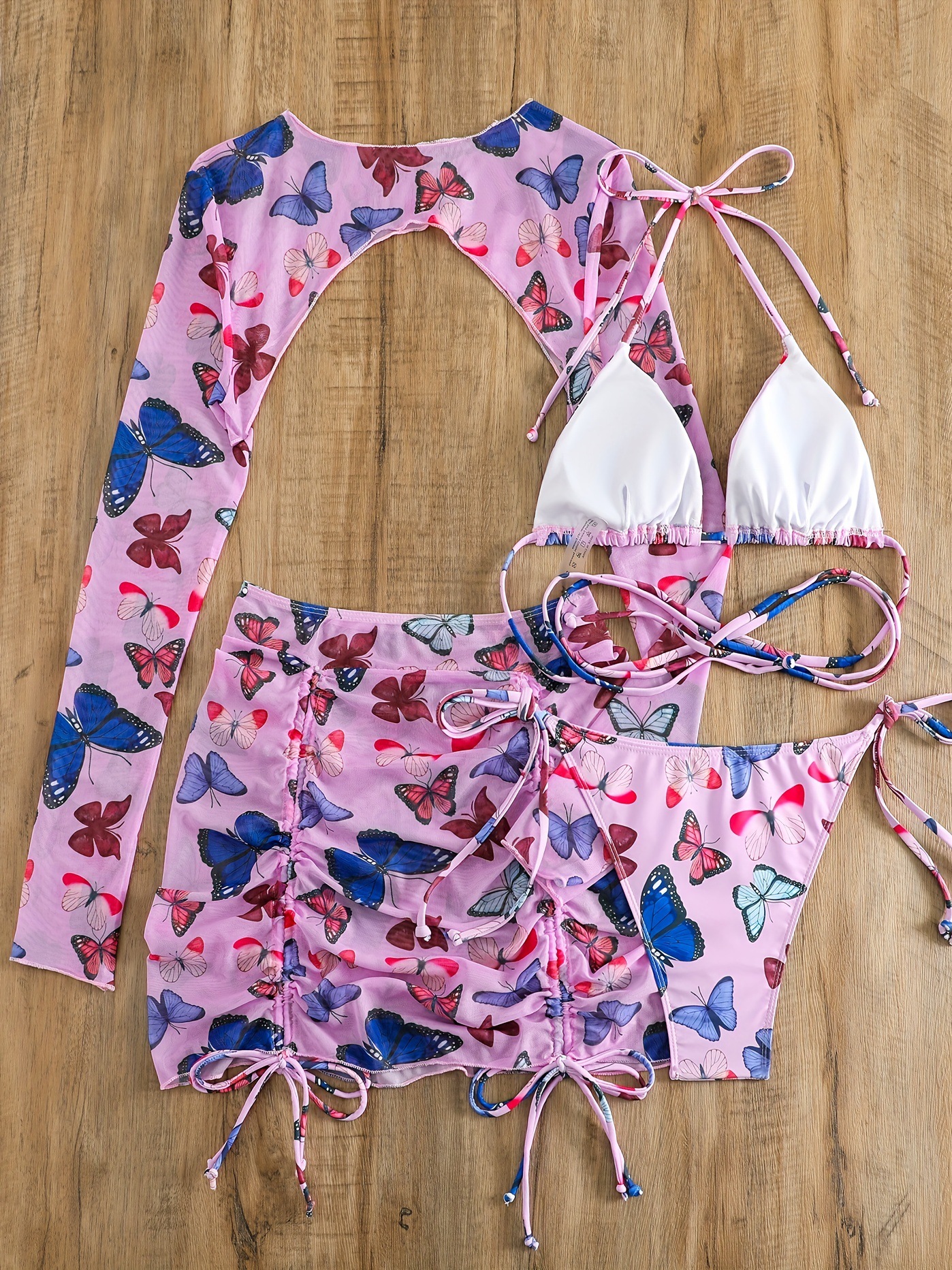 Nuevo traje de baño europeo y americano traje de baño de cuatro piezas para mujer con estampado de mariposa cordón sexy bikini